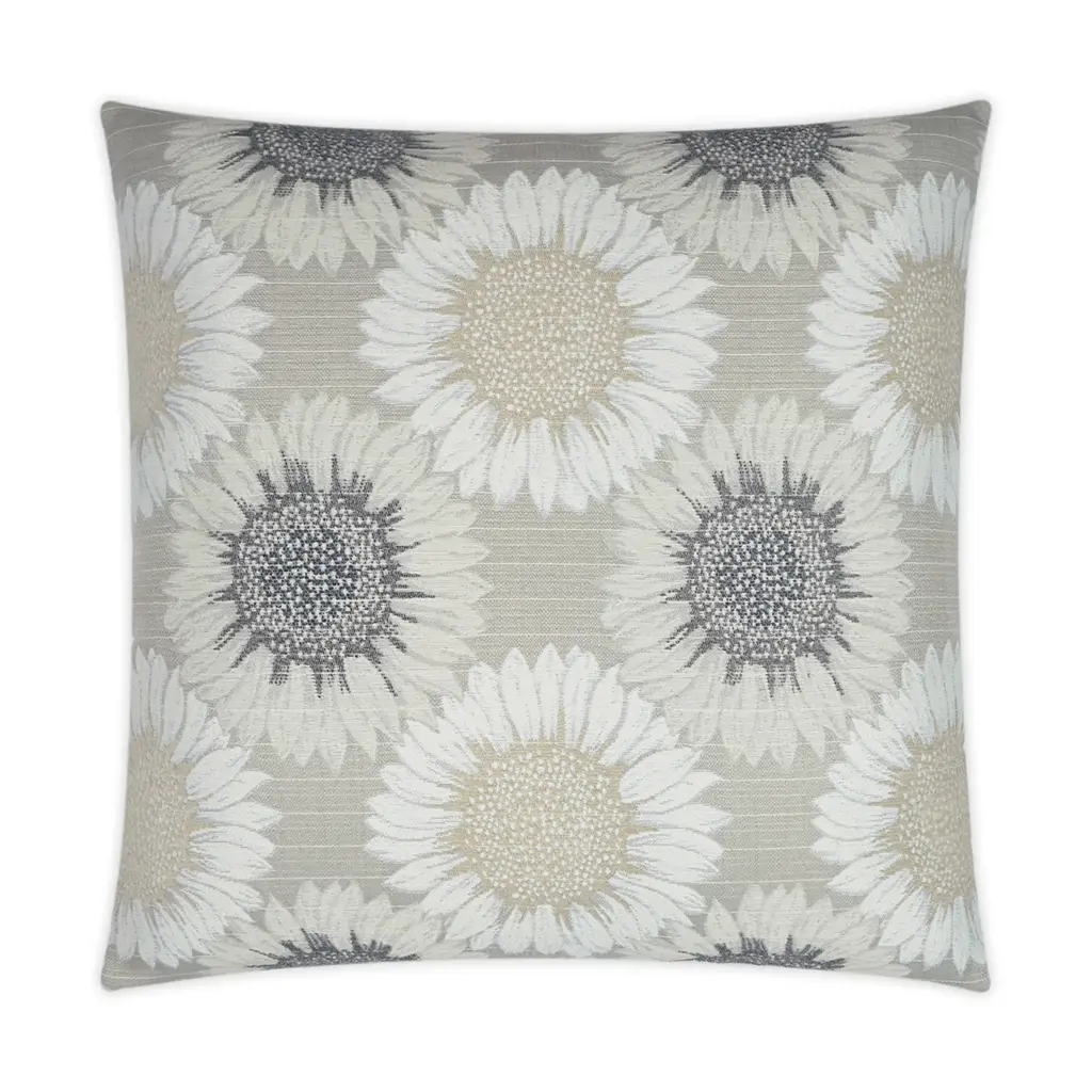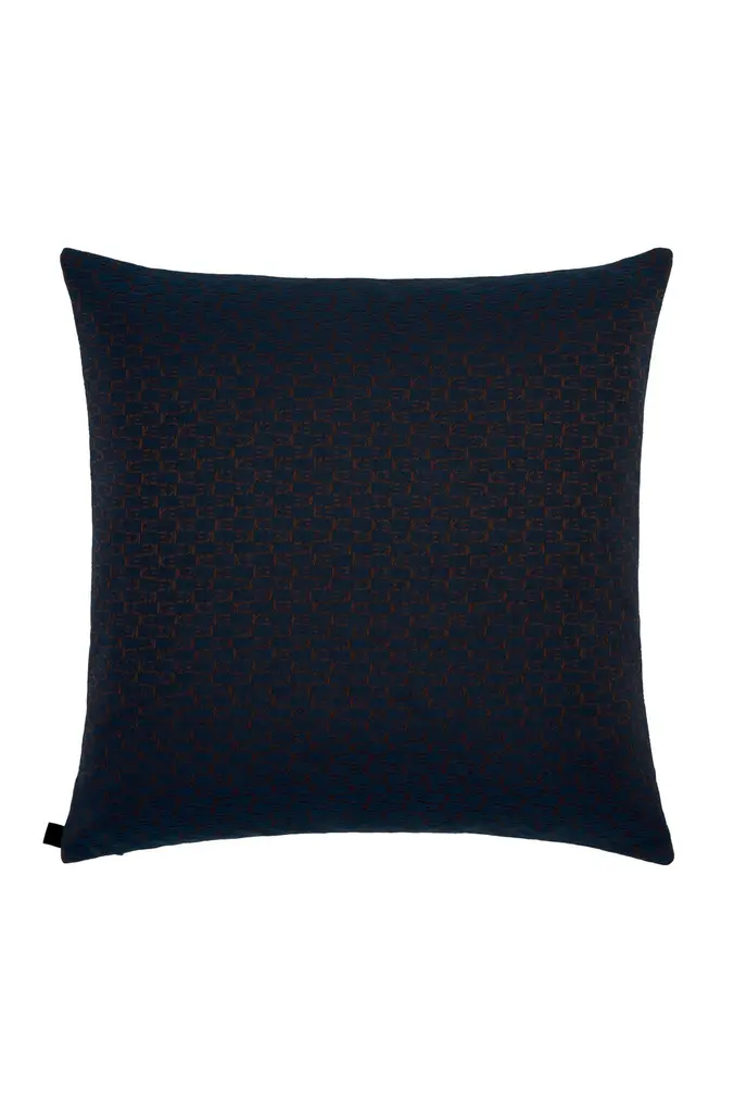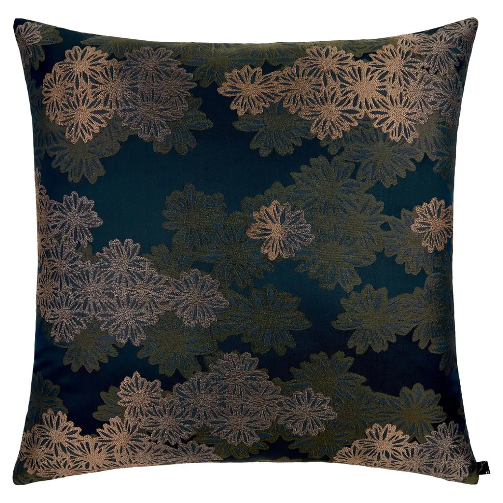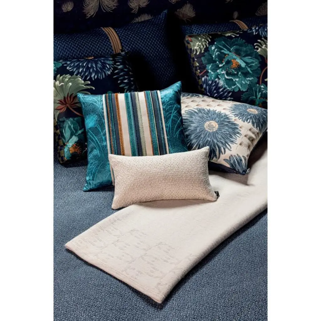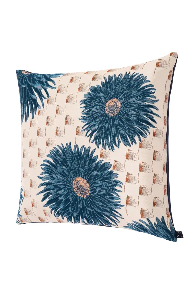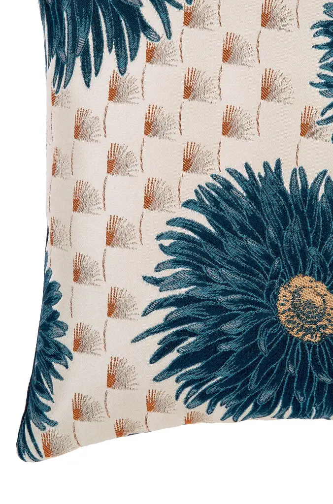 This is a jacquard cube pouf, seat in blue, green, and gold tones. Each edge of the pouf is divided by thin, gold sateen piping. The pouf features a pattern of beautiful large blue dahlias against a delicate golden plume background. The dahlia flower is a Japanese symbol for beauty and elegance. The sides of the pouf are designed with stylish 3D velvet stripes.