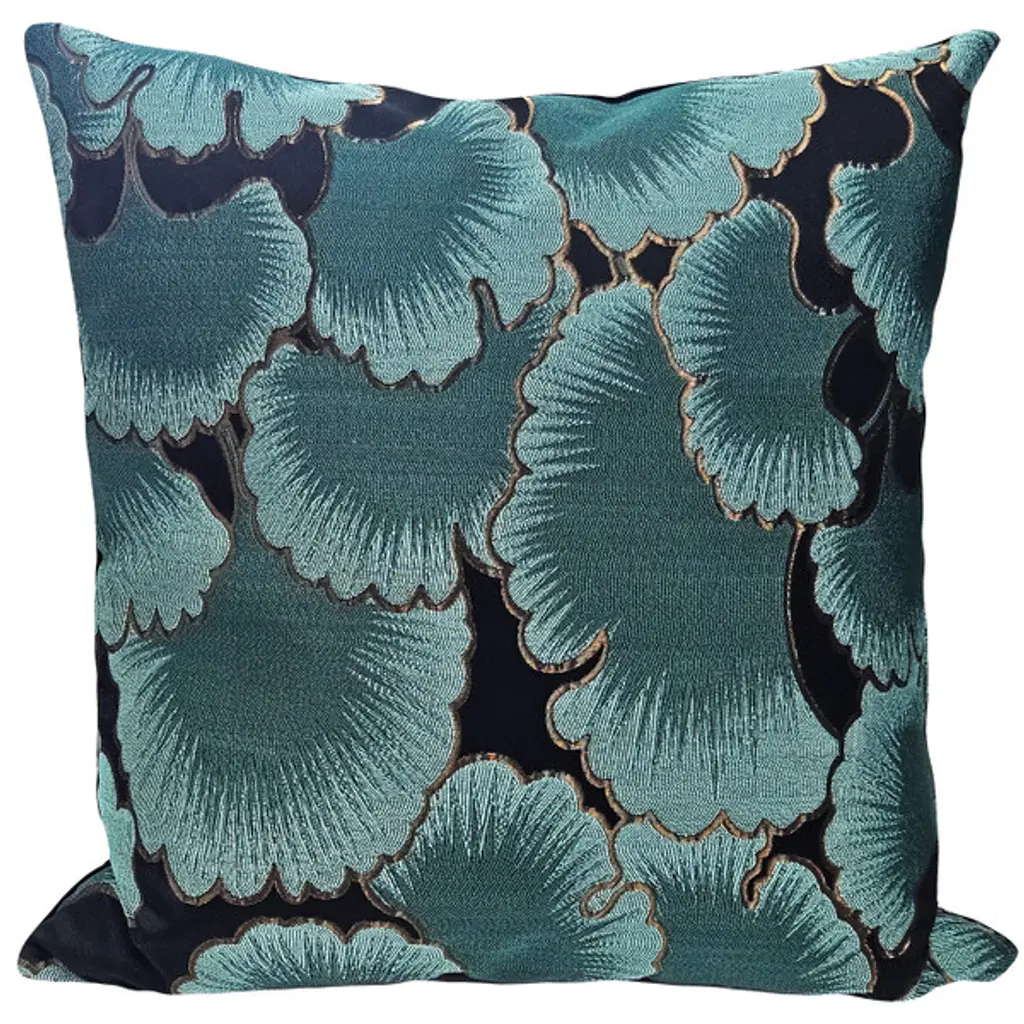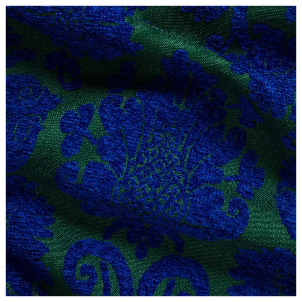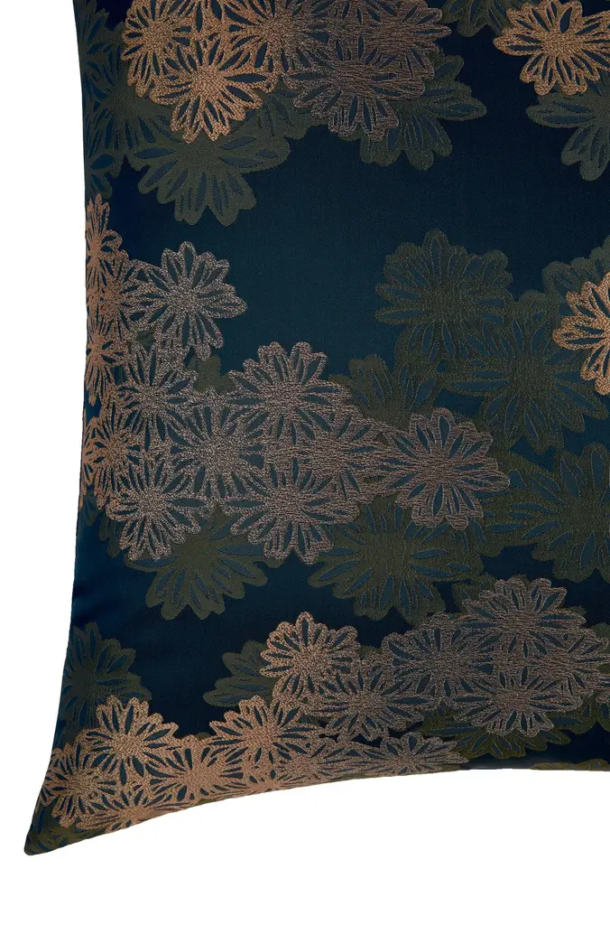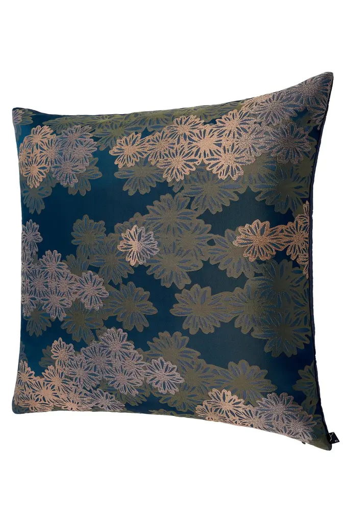 This is a jacquard cube pouf, seat in blue, green, and gold tones. Each edge of the pouf is divided by thin, gold sateen piping. The different patterns on the sides of the pouf are beautifully designed with 3D flower clusters and geometric florals and motifs.