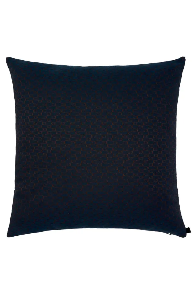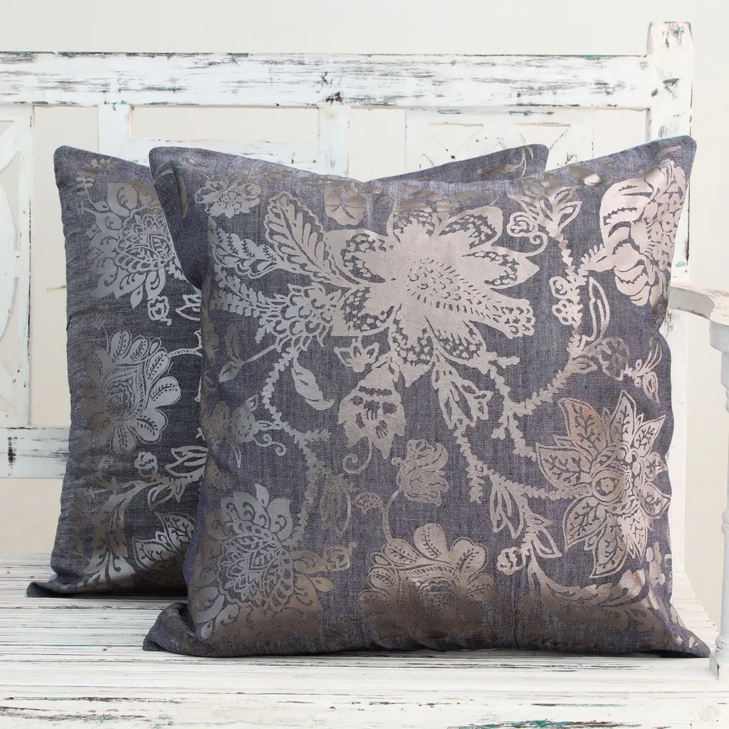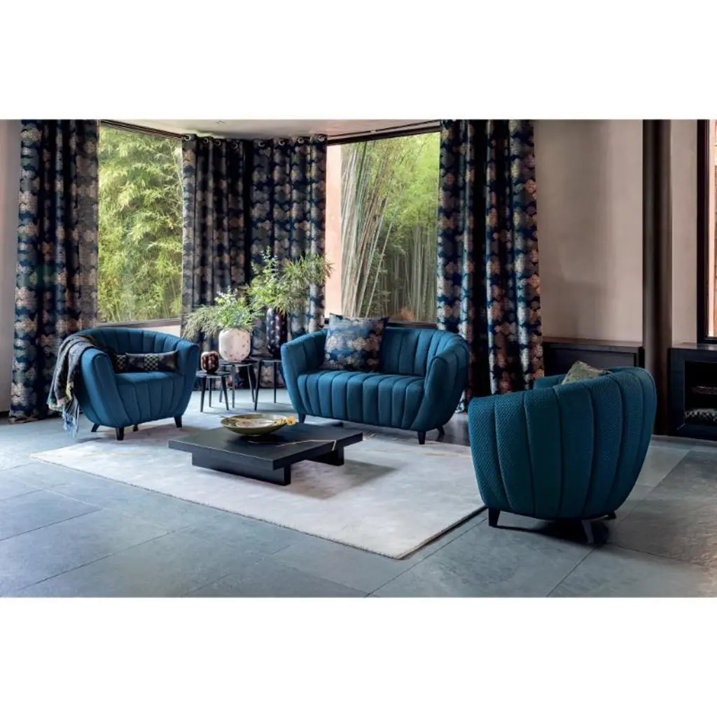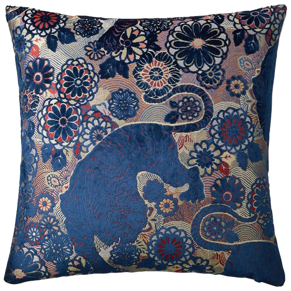 This is a jacquard cube pouf, seat in blue, green, and gold tones. Each edge of the pouf is divided by thin, gold sateen piping. The different patterns on the sides of the pouf are beautifully designed with 3D flower clusters and geometric florals and motifs.
