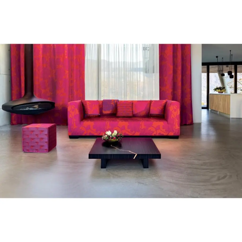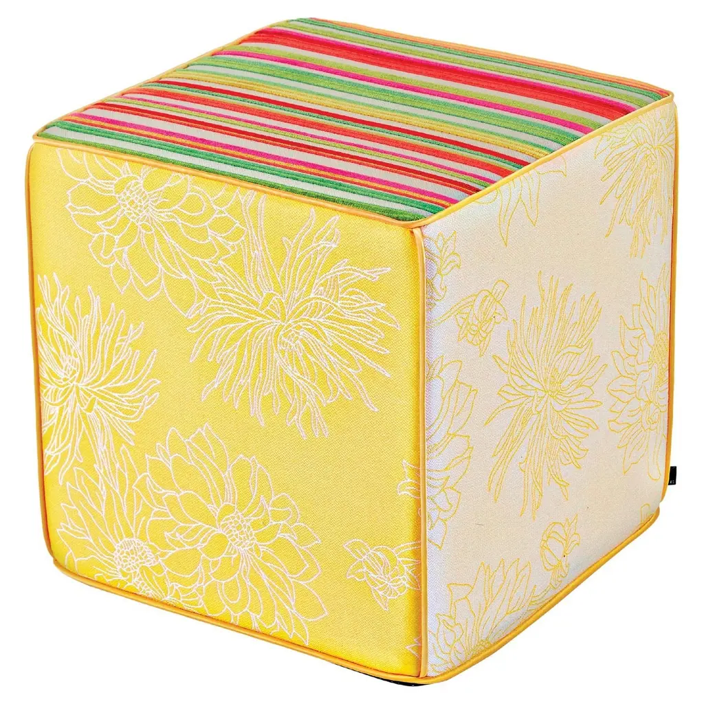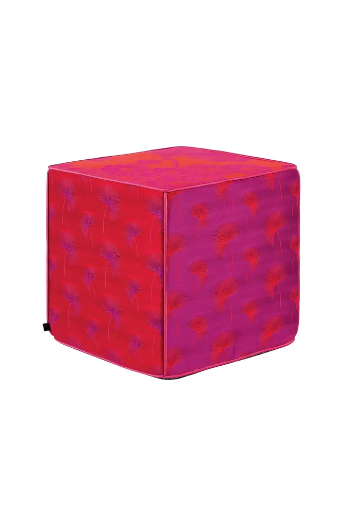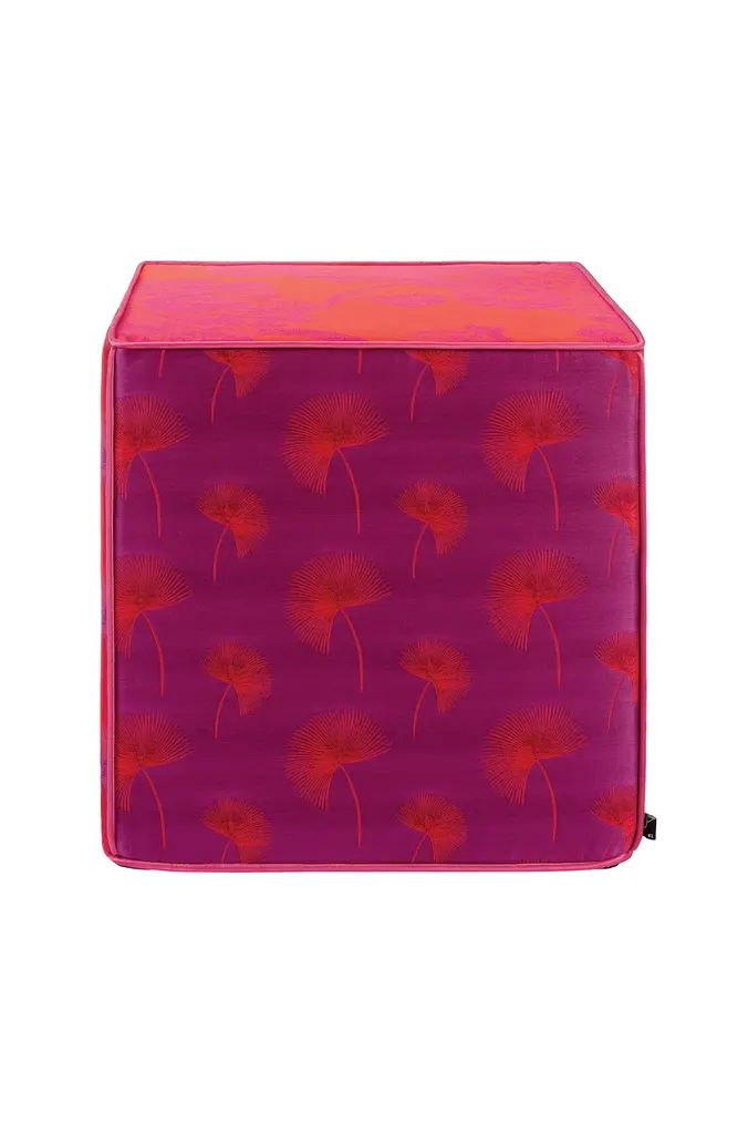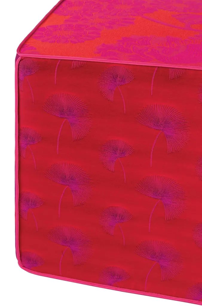This is a jacquard cube pouf, seat in vibrant pink and orange tones. Each edge of the pouf is divided by thin, gold sateen piping. The sides of the pouf are designed with a chic pattern of leaves in inverted tones and the top of the pouf features elegant large peonies, a Japanese symbol of good fortune.