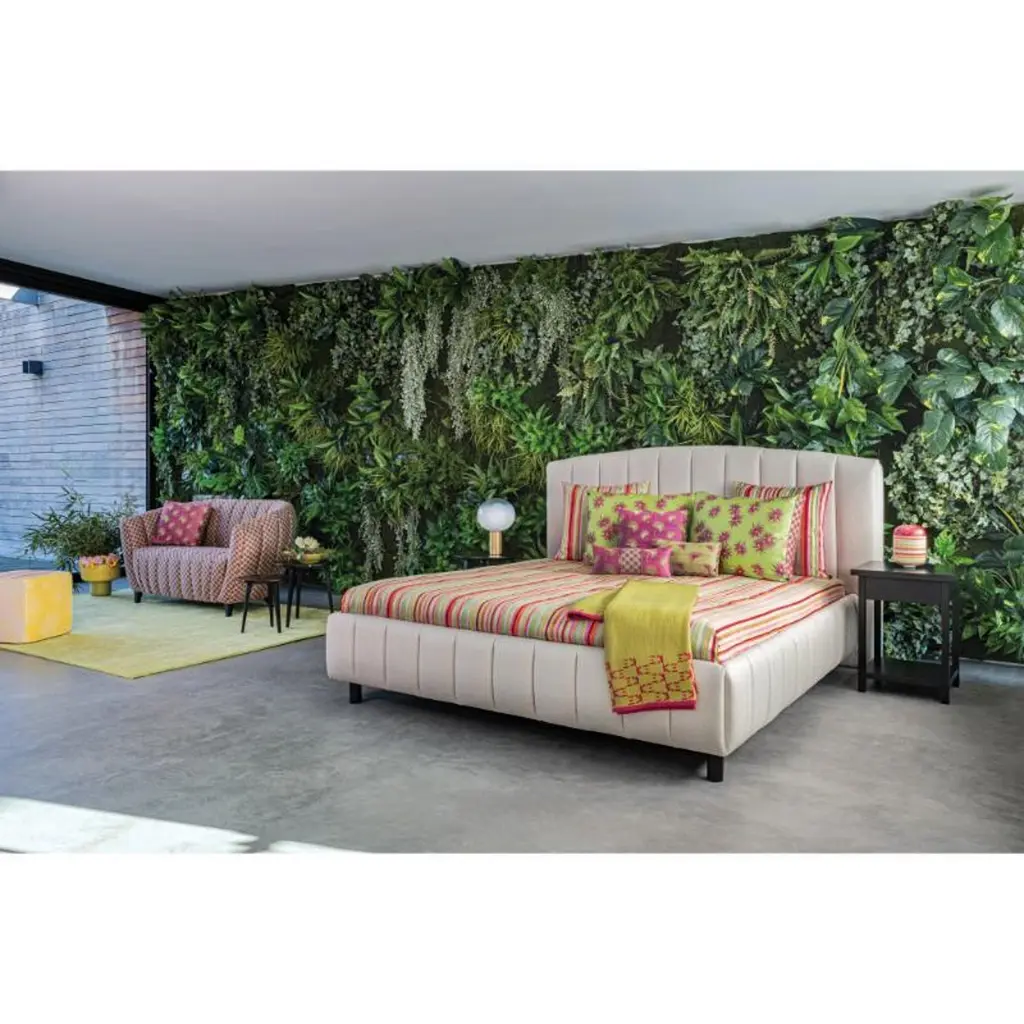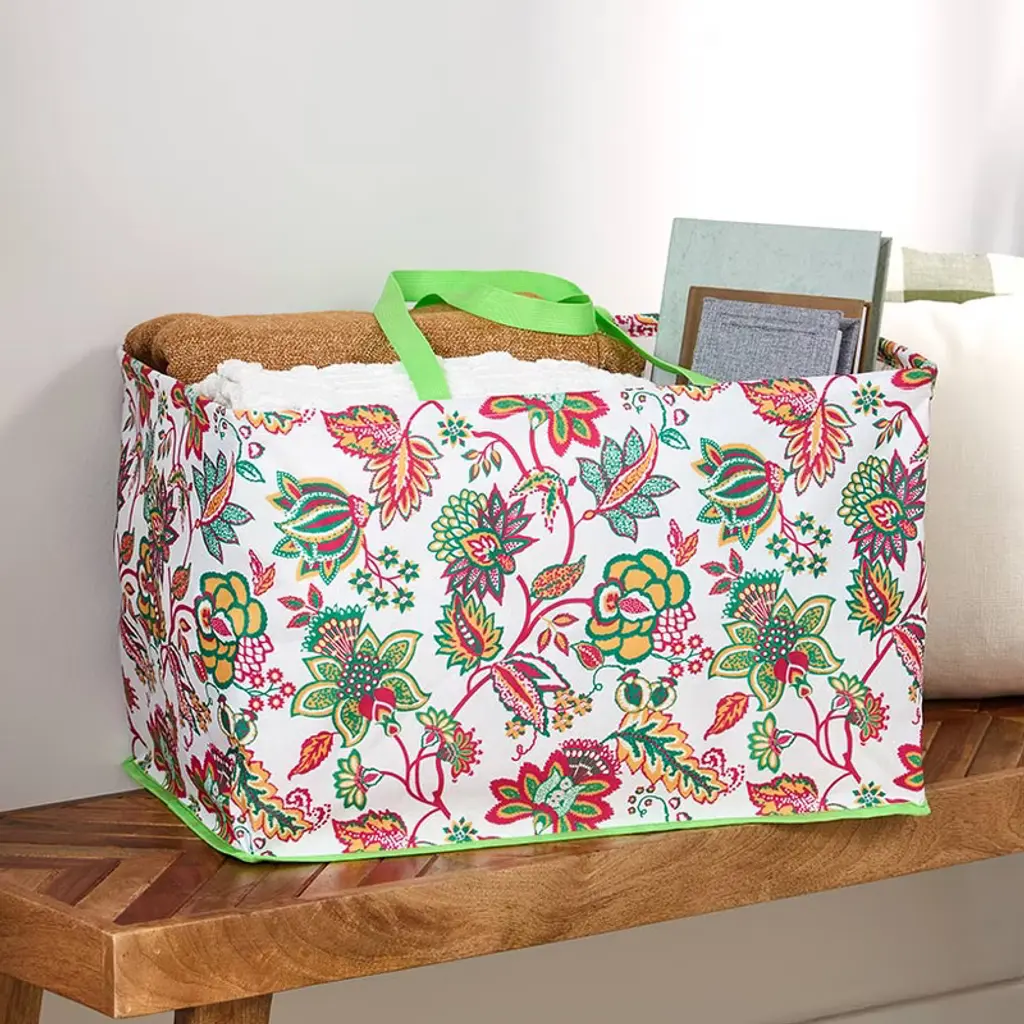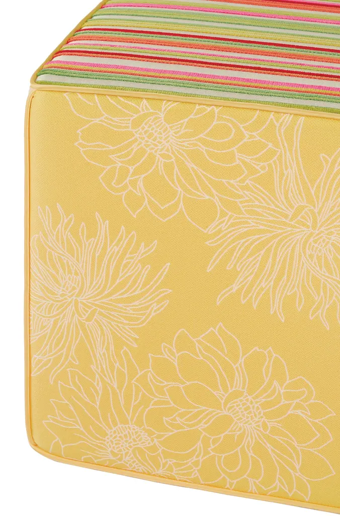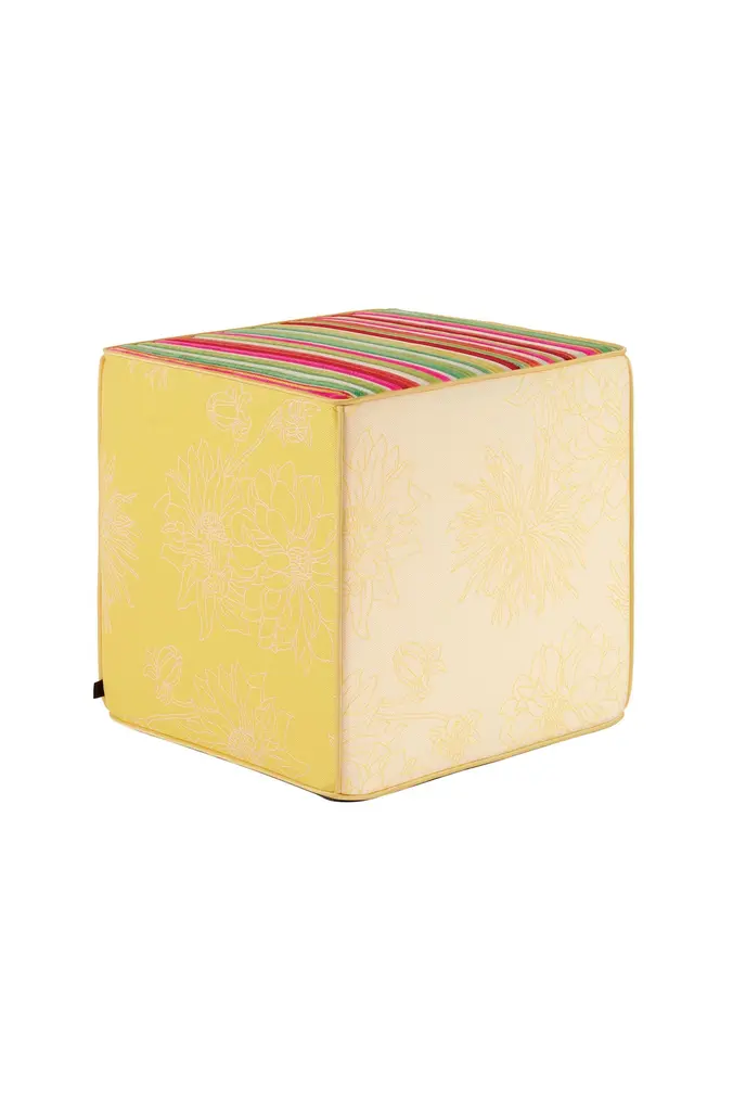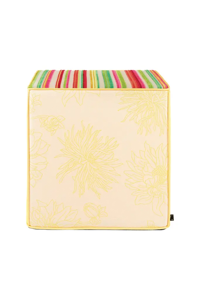 This is a jacquard cube pouf, seat in a vibrant yellow tone. The sides of the pouf features a playful floral pattern in inverted colours and the top of the pouf is designed with stylish 3D velvet stripes in the bright pink, green, and orange tones that are characteristic of this theme.