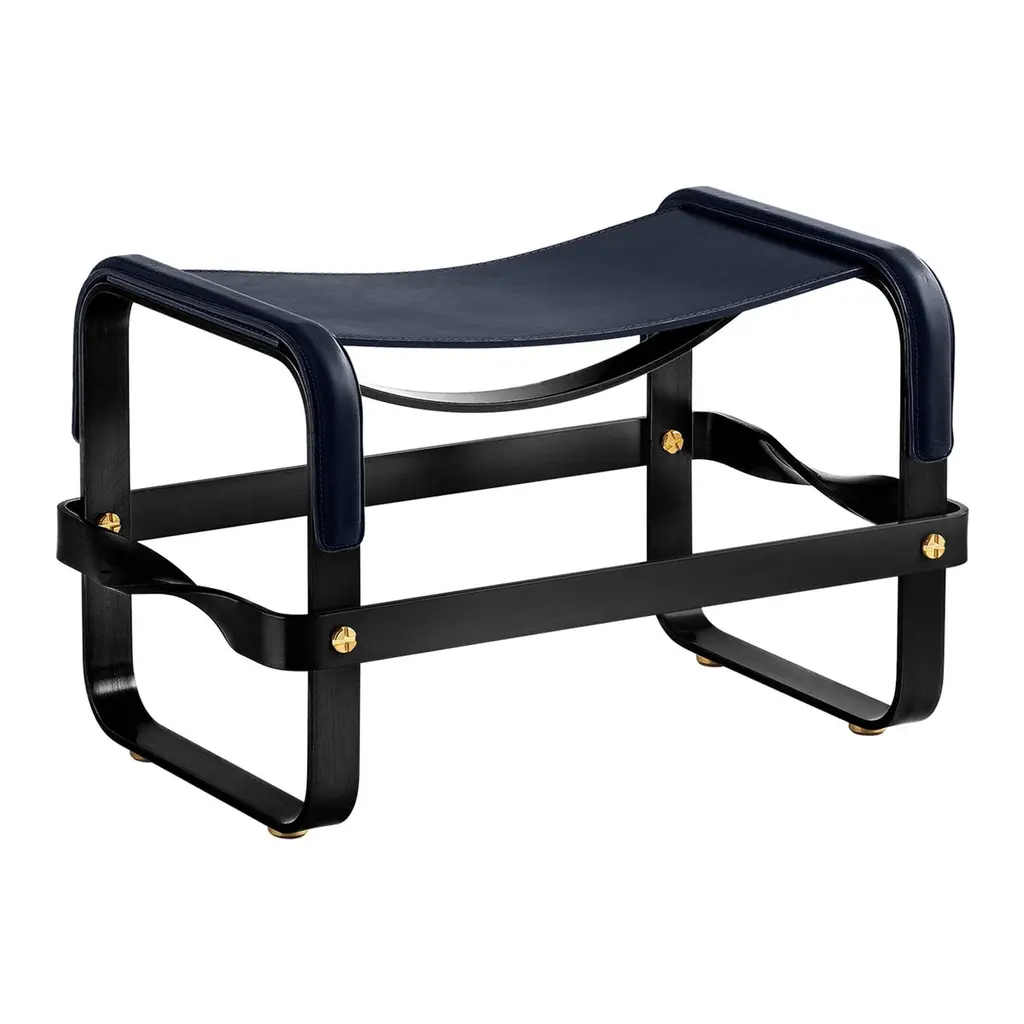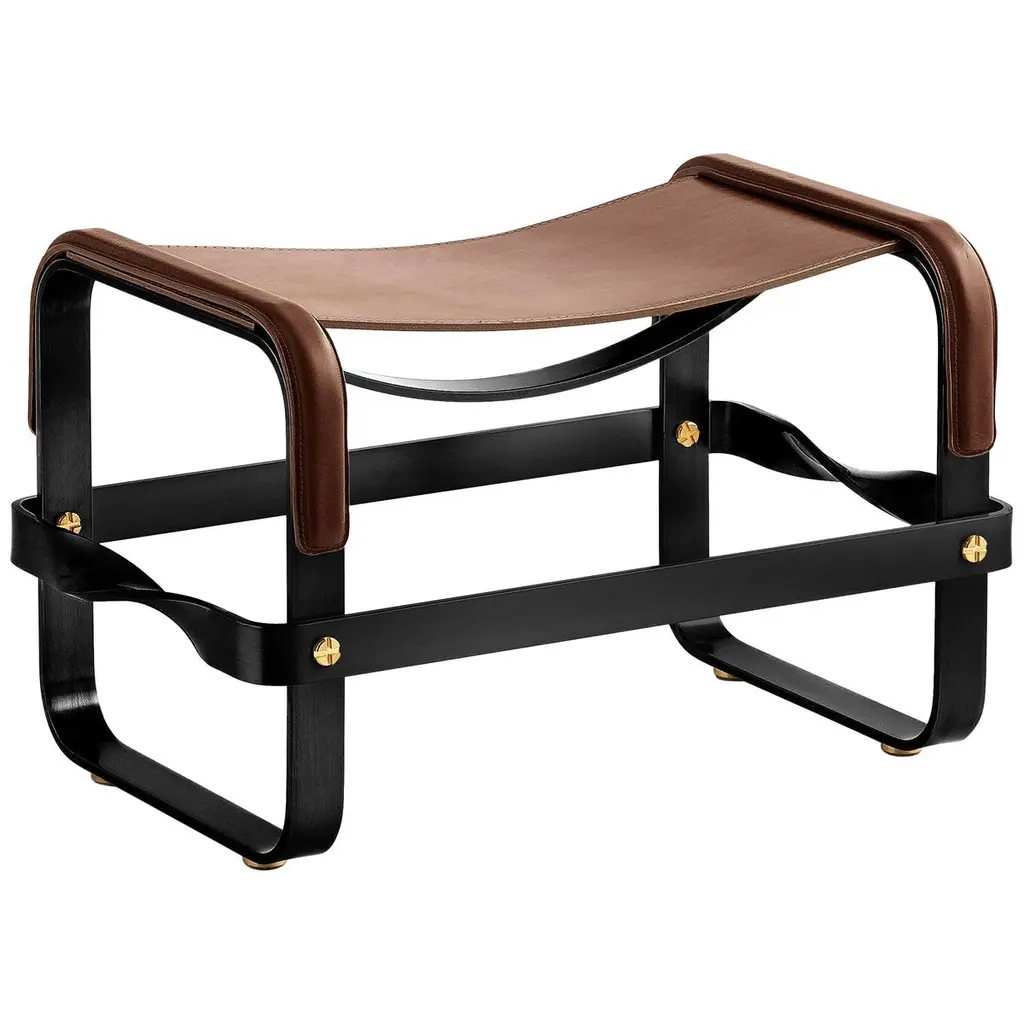 The Wanderlust contemporary ottoman and footstool belongs to a collection of minimalist and serene pieces where exclusivity and precision are shown in small details such as the hand-turned metal nuts and bolts that fix the leather surfaces, that go unnoticed at first sight.The robustness of the steel structure is combined with the delicacy of the rounded edges. The matte metal finishes evoke the passage of time and are complemented by vegetable tanned cowhide leathers that age gracefully with its use.The Wanderlust counter stool is designed and conceived as a tribute of Bauhaus tribute, the phrases "Less is more" and "God is in the detail" from the German American architect and industrial designer Mies van der Rohe, one of the pioneers of modernist architecture, define this collection.All pieces are done with cold bended steel rods, polished, nickel plated, colored by electrolysis, and lacquered. The process of polishing and lacquering the steel, goes through a manual and delicate chroming process, which gives its final and unique metal color finish. This precise technique gives a uniform metallic finish of minimum 50 microns over the entire Surface. Our metal finishing has successfully passed a corrosion resistance test in a salt spray chamber according to UNE-EN ISO 9227: 2017 and UNE-EN ISO 1456: 2010. Our signature screws are made with brass turning lathed, polished, and lacquered, these are the pieces that fix the saddle leather to the metal frame.Leathers are Spanish hides vegetable tanned. We use premium saddles in multiple colors to adjust to your taste and interior needs. This traditional vegetable dying and tanning method is an organic technique that relies on natural tannings from bark or plant tissues. The use of oils and natural fats give the leather a distinctive flexibility and texture, allowing it to be molded, retain its shape and age graciously.All skins are carefully selected from food industry sub-products, with a minimum thickness of 3.5 mm / 0,02 in, using the part of the animal's shoulder, which allows for larger pieces and uniformity, even though signature wrinkle from the animal’s neck may be recognizable. The vegetable tanning is a traditional and artisan treatment, which is respectful to the environment. Even with careful selection natural marks as a result of the contact with other animals, the age, origin and characteristics of the skin, or even the season in which the tanning takes place cannot be avoided. We still believe that these factors only add authenticity and uniqueness to every piece. Our leather parts are made with double saddles, always showing the top side of the hides that presents the better quality.Customization options.With the aim of creating customized pieces, clients can select from the various metal finishes, and leather colors to create pieces that complement their home décor. Leather colors available, black, navy, dark brown, cognac and natural tobacco, and steel polished finishing available, aged brass, black smoke and aged silver.Normally we use tone on tone threats for stitches, but client can select a contrast option, being possible to select any color to make a unique piece for the project it belongs. The finish on the edges of our leather components are sanded and hand painted. We have the option of select an alternative color if not tone on tone will be applied.Please consult in case you are interested on having a particular heat embossing stamp on the leather with your own branding.Our collections are made to full fill home spaces where to gather and enjoy great conversation with families and friends. Occasional furniture for exquisite homes, from cottages to exclusive resorts. Our product is understood as a sculptural piece of design, as an art object to be displayed at different house spaces as library, bar, living, foyer, bedroom, powder, meeting, grand or great room.The different finishes options make the furniture perfect combinations on diverse styles, from rustic mountain home, a small cottage, a ski lodge retreat, or industrial a minimalist look.