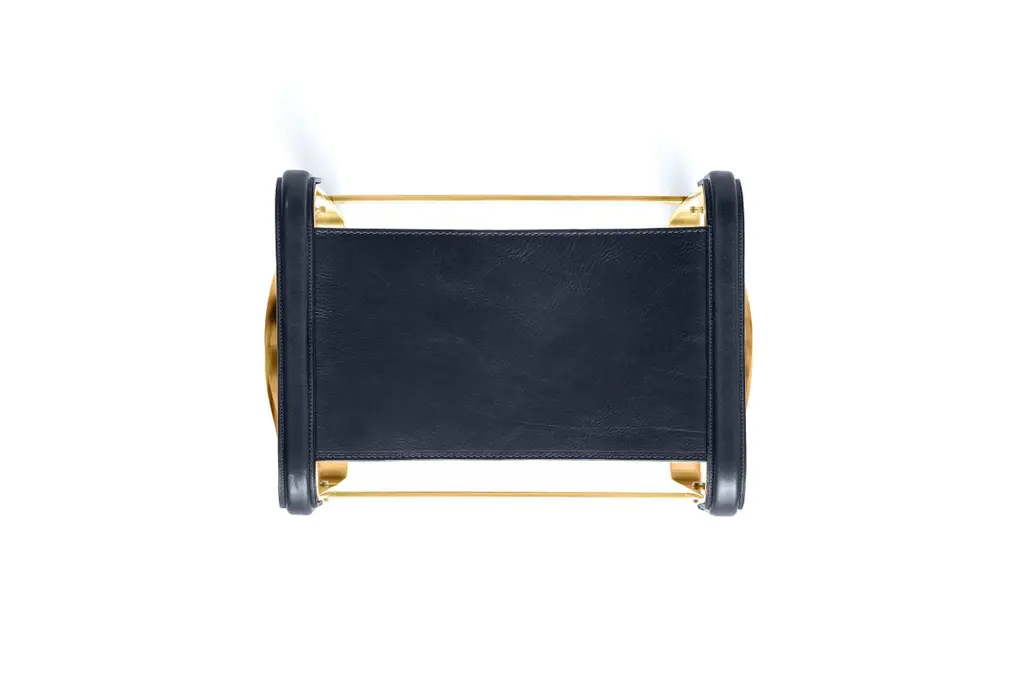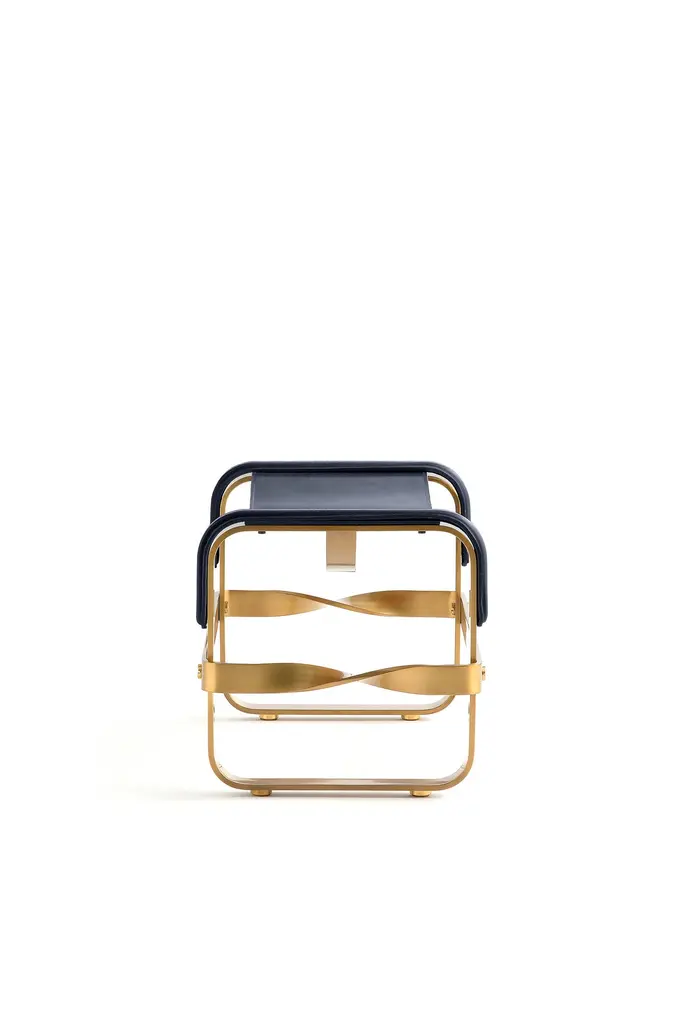 Footstool Aged Brass Steel & Navy Blue Leather, Contemporary Style