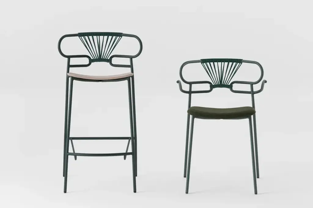 Barstool for kichen, restaurant, bar, hotel, house. Metal base lacquered and wood seat, back in color rope.