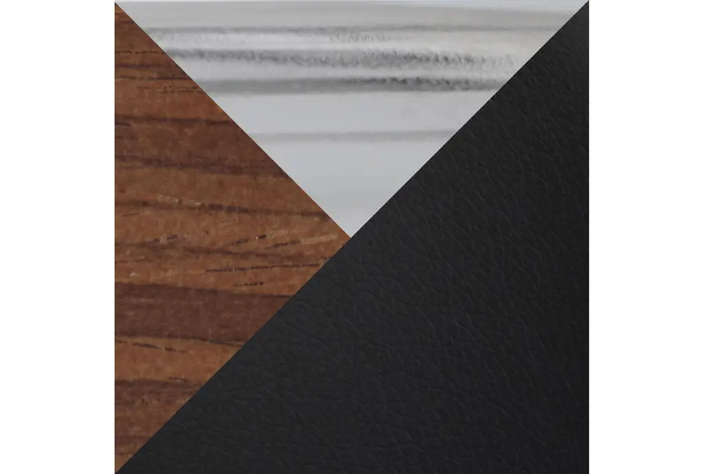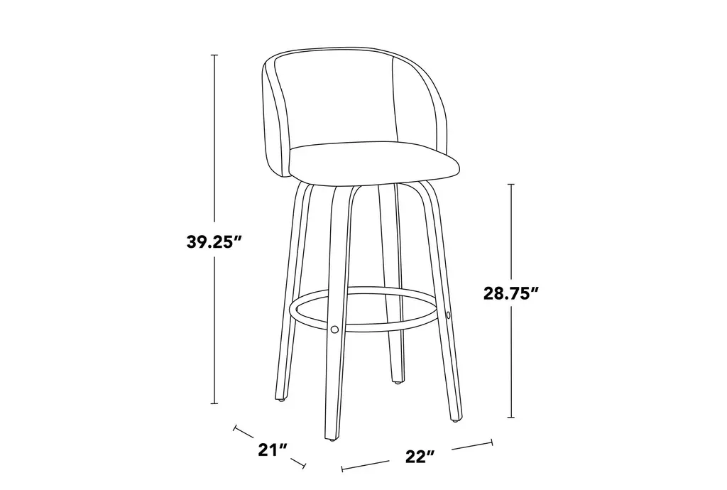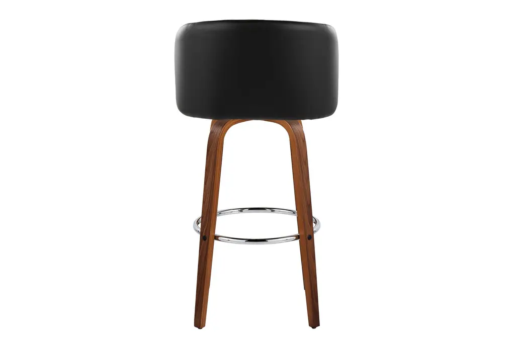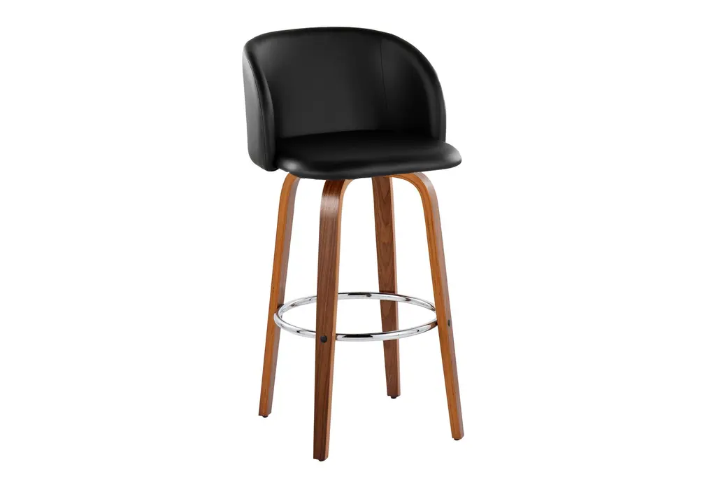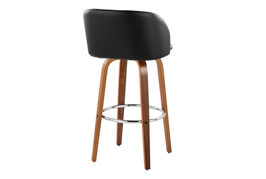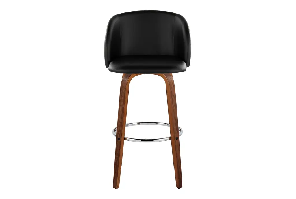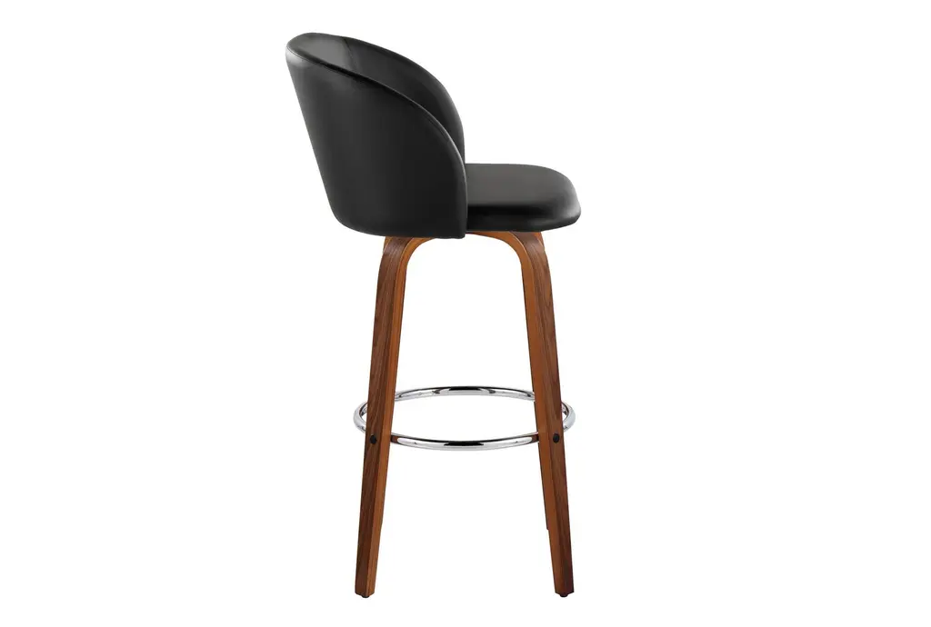 Hanne 29" Barstool With Swivel In Walnut Wood And Black Faux Leather With Round Chrome Metal Footrest Set Of 2 pairs a curved, armless seat upholstered in black faux leather with walnut wood legs for comfortable counter-height seating. The supportive backrest and smooth swivel mechanism make it easy to turn toward conversation or the kitchen island. A round chrome footrest ties the design together while adding stable support, and protective glides help preserve floors. Designed with a contemporary profile, this set balances everyday practicality with comfort-forward details.