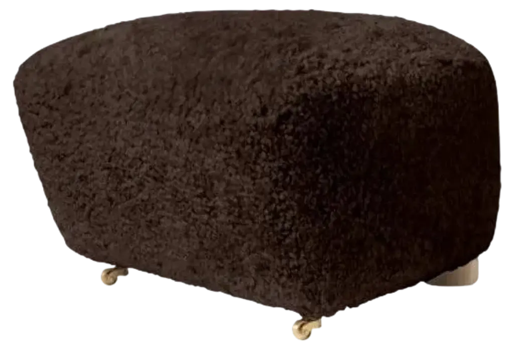 Honey smoked oak sheepskin the tired man footstool by Lassen Dimensions: W 55 x D 53 x H 36 cm Materials: Sheepskin Flemming Lassen designed the overstuffed easy chair, The Tired Man, for The Copenhagen Cabinetmakers’ Guild Competition in 1935. It is characterised by organic, bearlike shapes and then as now it created a sensation with its curved form and voluminous armrests. Sitting in the chair should, in Flemming Lassen’s own ords, be ”as warm and safe as a polar bear cub in the arms of its mother in the middle of the ice cap”. The family man Flemming Lassen valued intimate relationships - with its warm exterior, The Tired Man invokes domestic cosiness and socialising by candlelight.