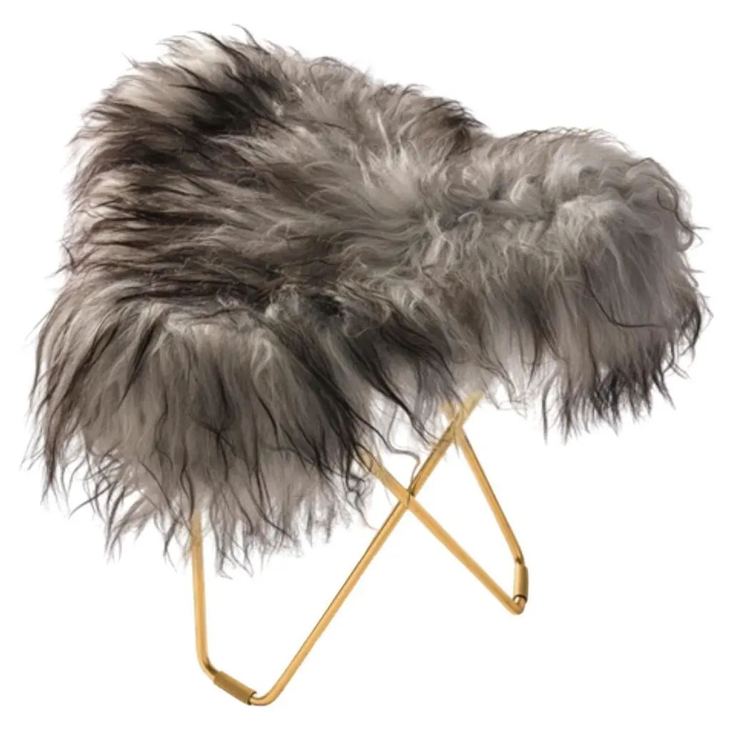 Iceland Flying Goose Footstool by Cuero DesignDimensions: D 48 x W 47 x H 48 cm.Materials: Sheepskin and chrome.Finish: Wild black sheepskin and chrome frame.Weight: 5,5 kg.Available in different upholstery and metal color options and finishes. Prices may vary. Please contact us.We are introducing Cuero's sheepskin stool. The perfect combination of warmth, comfort, stability, and weightlessness. This sheepskin stool can easily be moved around to serve every purpose you need it to while staying elegant and sophisticated. With its minimalistic design, this sheepskin stool will adapt perfectly to any interior design, bringing the whole room together.The Flying Goose is the perfect height to serve as a footrest for your matching Sheepskin Butterfly Chair. So sit back and enjoy the ultimate comfort of your full Cuero set while reading a book by the fireplace and sipping a hot cocoa form your favorite mug.Cuero DesignWe make furniture that we want to have in our own homes. Everything has to be comfortable, beautiful, and very high quality. Second-generation family business. Since 1986 - My father started importing luxury leather goods from South America to Sweden. He eventually discovered the butterfly chair which is a classical design from Argentina and became obsessed. 15 years of his life were dedicated to improving its shape and quality. Agustina is from Patagonia and Nils is from Sweden.