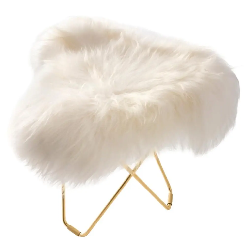 Iceland Flying Goose Footstool by Cuero DesignDimensions: D 48 x W 47 x H 48 cm.Materials: Sheepskin and 24K gold plated metal.Finish: Wild grey sheepskin and 24K gold frame.Weight: 5,5 kg.Available in different upholstery and metal color options and finishes. Prices may vary. Please contact us.We are introducing Cuero's sheepskin stool. The perfect combination of warmth, comfort, stability, and weightlessness. This sheepskin stool can easily be moved around to serve every purpose you need it to while staying elegant and sophisticated. With its minimalistic design, this sheepskin stool will adapt perfectly to any interior design, bringing the whole room together.The Flying Goose is the perfect height to serve as a footrest for your matching Sheepskin Butterfly Chair. So sit back and enjoy the ultimate comfort of your full Cuero set while reading a book by the fireplace and sipping a hot cocoa from your favorite mug.Cuero DesignWe make furniture that we want to have in our own homes. Everything has to be comfortable, beautiful, and very high quality. Second-generation family business. Since 1986 - My father started importing luxury leather goods from South America to Sweden. He eventually discovered the butterfly chair which is a classical design from Argentina and became obsessed. 15 years of his life were dedicated to improving its shape and quality. Agustina is from Patagonia and Nils is from Sweden.