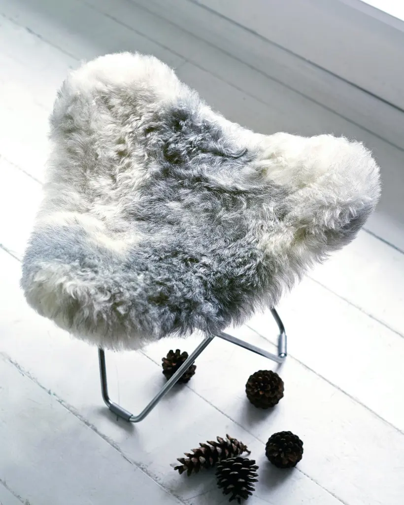 Iceland Flying Goose Footstool by Cuero DesignDimensions: D 48 x W 47 x H 48 cm.Materials: Sheepskin and metal.Finish: Shorn black sheepskin and black frame.Weight: 5,5 kg.Available in different upholstery and metal color options and finishes. Prices may vary. Please contact us.We are introducing Cuero's sheepskin stool. The perfect combination of warmth, comfort, stability, and weightlessness. This sheepskin stool can easily be moved around to serve every purpose you need it to while staying elegant and sophisticated. With its minimalistic design, this sheepskin stool will adapt perfectly to any interior design, bringing the whole room together.The Flying Goose is the perfect height to serve as a footrest for your matching Sheepskin Butterfly Chair. So sit back and enjoy the ultimate comfort of your full Cuero set while reading a book by the fireplace and sipping a hot cocoa from your favorite mug.Cuero DesignWe make furniture that we want to have in our own homes. Everything has to be comfortable, beautiful, and very high quality. Second-generation family business. Since 1986 - My father started importing luxury leather goods from South America to Sweden. He eventually discovered the butterfly chair which is a classical design from Argentina and became obsessed. 15 years of his life were dedicated to improving its shape and quality. Agustina is from Patagonia and Nils is from Sweden.