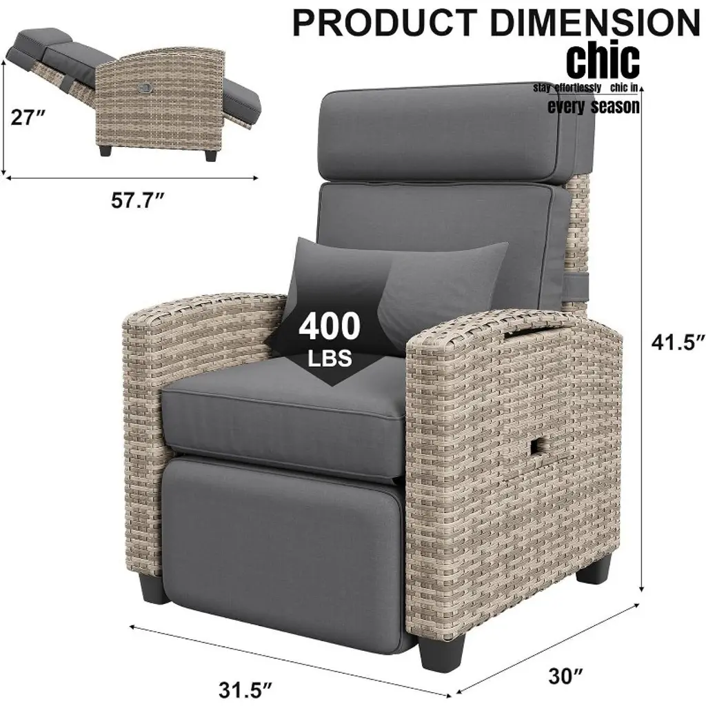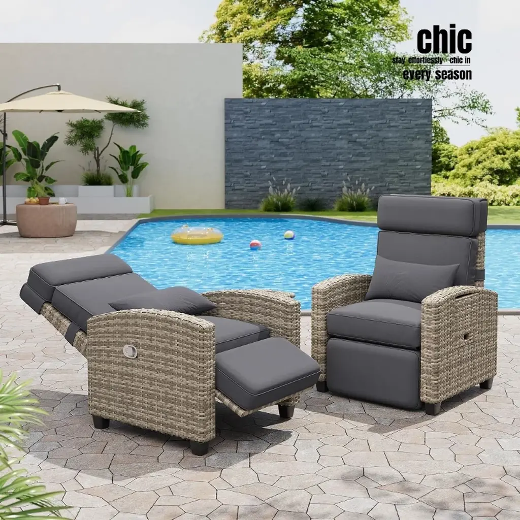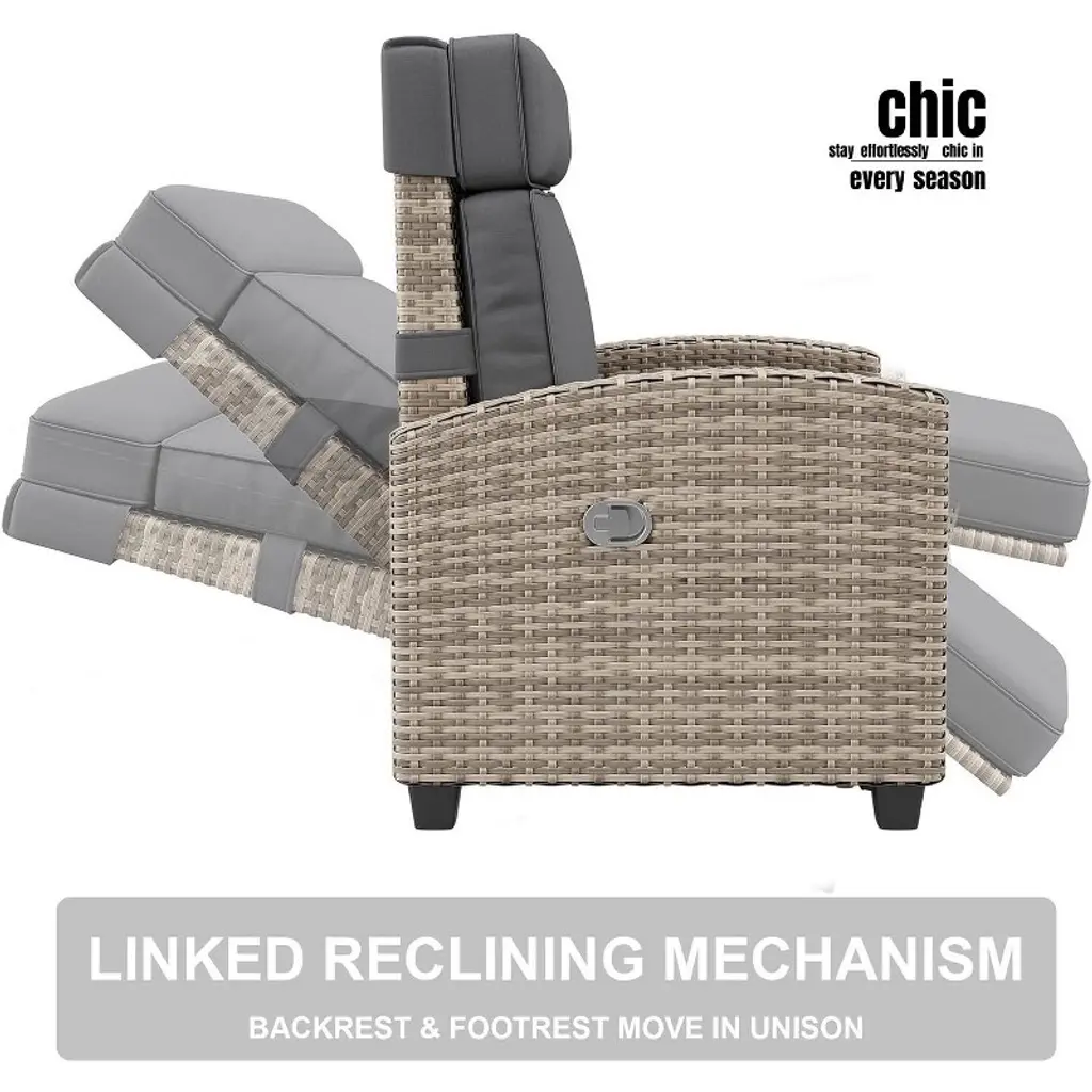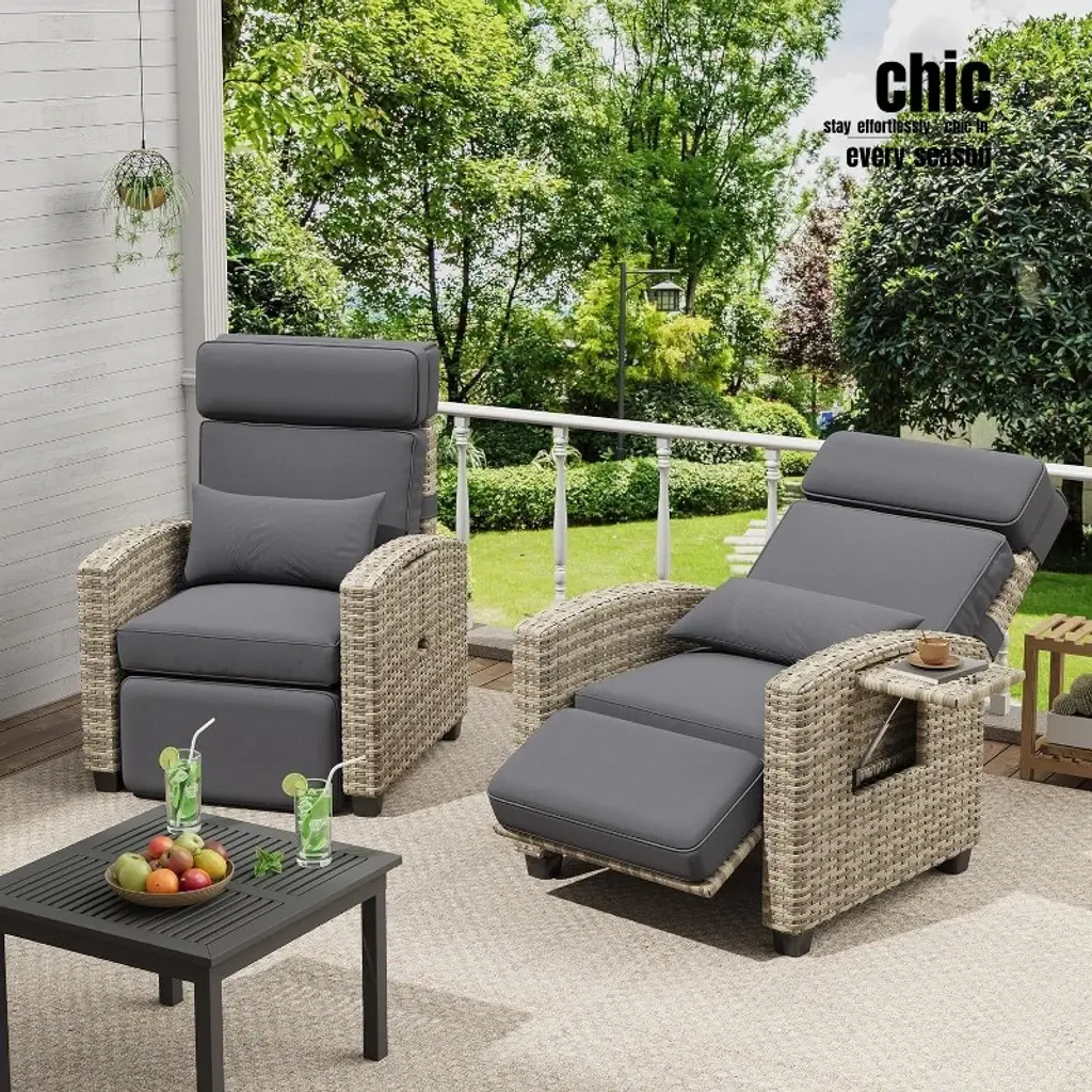 Relax in comfort with this all-weather recliner featuring a 150° adjustable backrest and footrest, ergonomic design for taller users, durable PE rattan frame, built-in flip-up table, and quick 30-min assembly. Ideal for poolside, patios, or balconies.