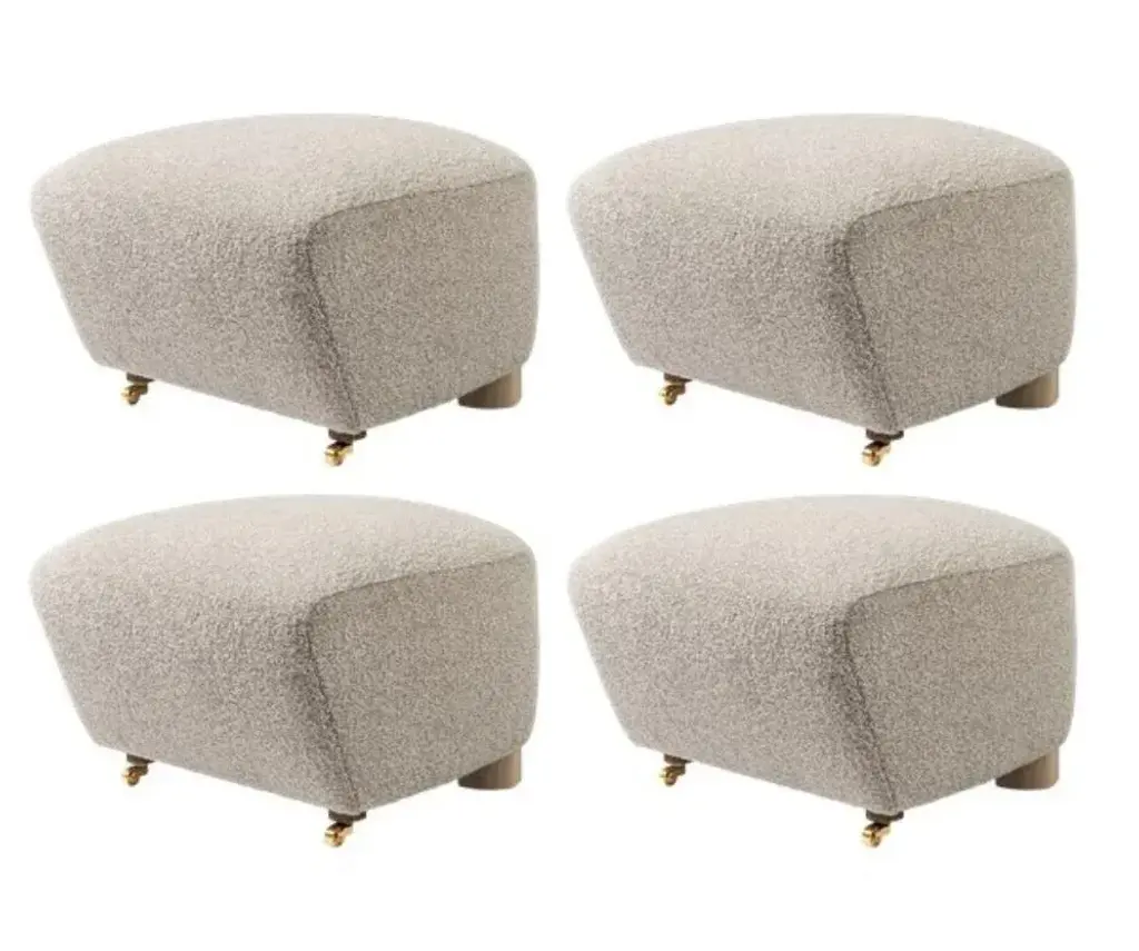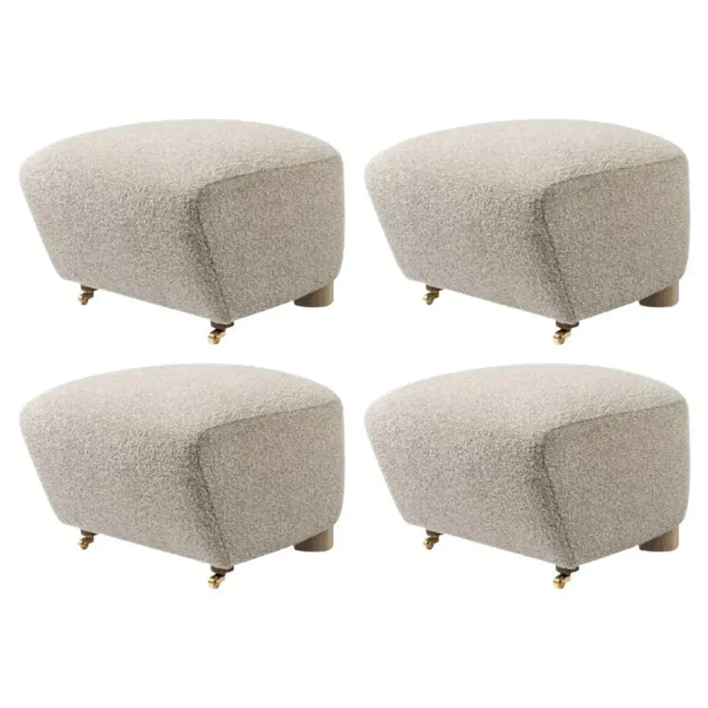 Set of 4 light beige natural oak Sahco zero the tired man footstool by Lassen Dimensions: W 55 x D 53 x H 36 cm Materials: textile Flemming Lassen designed the overstuffed easy chair, The Tired Man, for The Copenhagen Cabinetmakers’ Guild Competition in 1935. It is characterised by organic, bearlike shapes and then as now it created a sensation with its curved form and voluminous armrests. Sitting in the chair should, in Flemming Lassen’s own ords, be ”as warm and safe as a polar bear cub in the arms of its mother in the middle of the ice cap”. The family man Flemming Lassen valued intimate relationships - with its warm exterior, The Tired Man invokes domestic cosiness and socialising by candlelight. By Lassen is a Danish design brand focused on iconic designs created by Mogens and Flemming Lassen, founded by Lassens’ relatives in 2008.