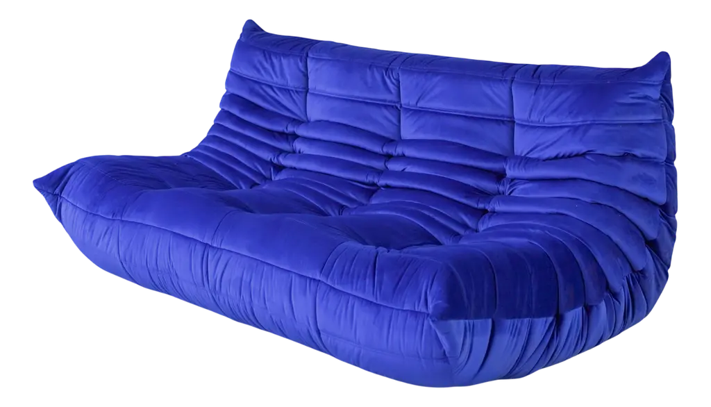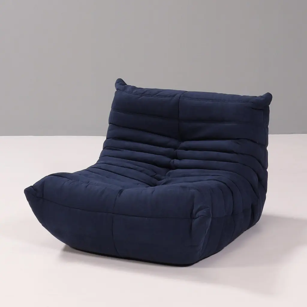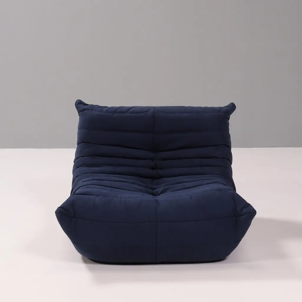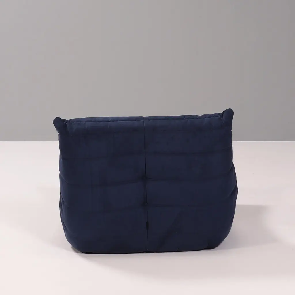 The iconic Togo sofa, originally designed by Michel Ducaroy for Ligne Roset in 1973, has become a mid-century design classic.This fireside armchair and footstool is incredibly versatile and can be used alone or paired with other pieces from the range.The chair features high quality dark blue upholstery. Made completely from foam, with three different densities, this sofa range was built for comfort.The piece features the instantly recognizable pleated fabric design, which gives the chair its relaxed aesthetic.Please note, some of our togo sofas are not available for immediate dispatch. Please enquire for further details on delivery timings.Lead time of 2 - 4 weeks.Measures:Fireside Chair: 87cm (W) x 70cm (H) x 102cm (D)Footstool: 87cm (W) x 34cm (H) x 80cm (D)Have you heard about our free same-day returns? If you're not happy with your item at delivery, we’ll take it back on the spot!Please note that the items shown together are sold separately unless specified as a set in the title.