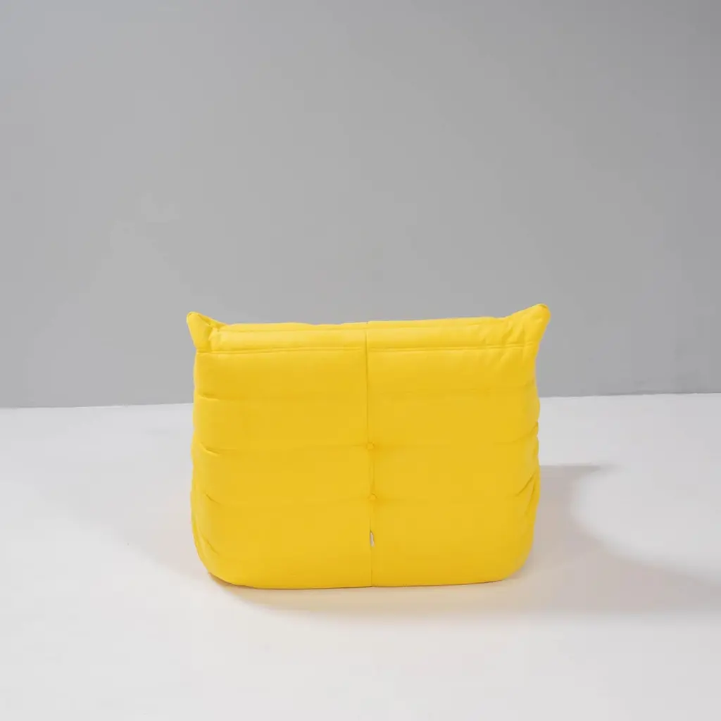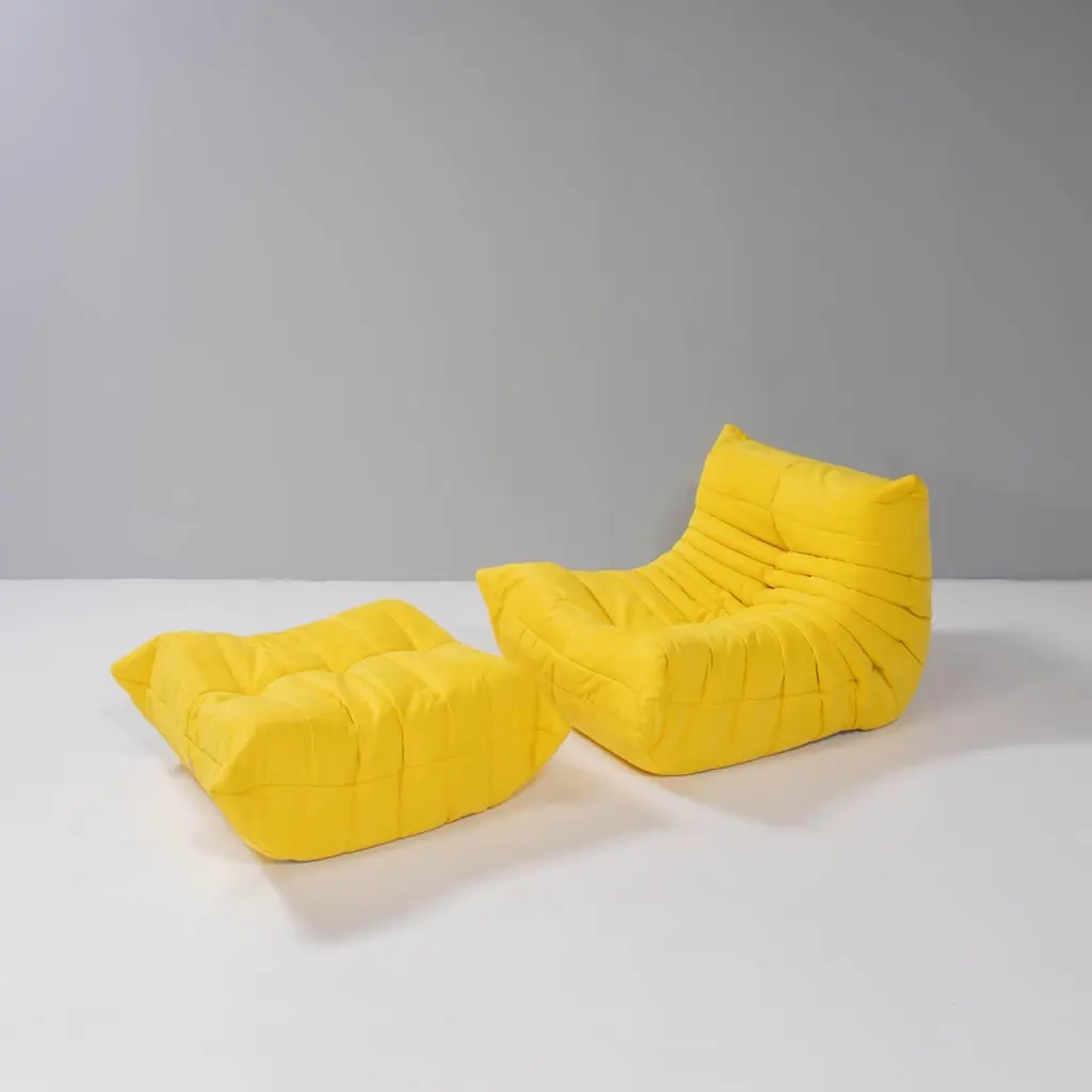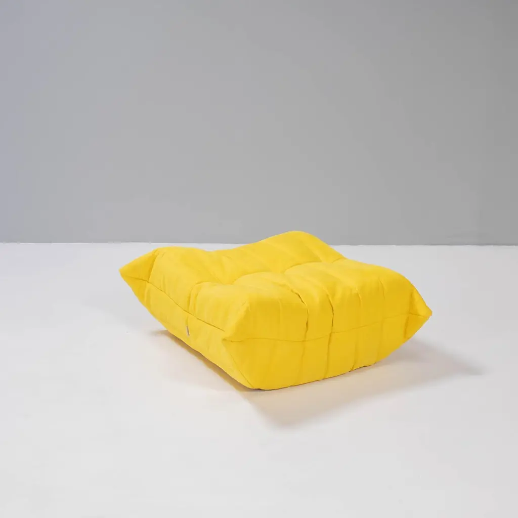 The iconic Togo sofa set, originally designed by Michel Ducaroy for Ligne Roset in 1973, has become a Mid Century Design Classic. This set, including an armchair and footstool, offers unmatched versatility and comfort, effortlessly adapting to your space as individual pieces or as part of a larger set.Made completely from foam, with three different densities, this sofa range was built for comfort, perfect for lounging and socialising. The sofas have been newly reupholstered in a soft microsuede fabric extending the life of these design classics. We use a breathable micro-suede fabric which is easy to care for and has a softer feel than alcantara, this vibrant yellow fabric will bring a pop of colour to your space.The pieces feature the instantly recognisable pleated fabric design, which gives the chair its relaxed aesthetic.Individual dims in Inches:Single: H 27.5 in, W 34.25 in, D 40 inFootstool: H 13.5 in, W 34.25 in, D 31.5 inIndividual dims in Centimetres (cm):Single: H 70 cm, W 87 cm, D 102 cmFootstool: H 34 cm, W 87 cm, D 80 cmCare Instructions:Clean with a soft brush or vacuum with an upholstery attachmentSpot clean with a damp cloth as needed.Delivery:Please note, some of our togo sets have a short lead time. Please enquire for further details on delivery timings.