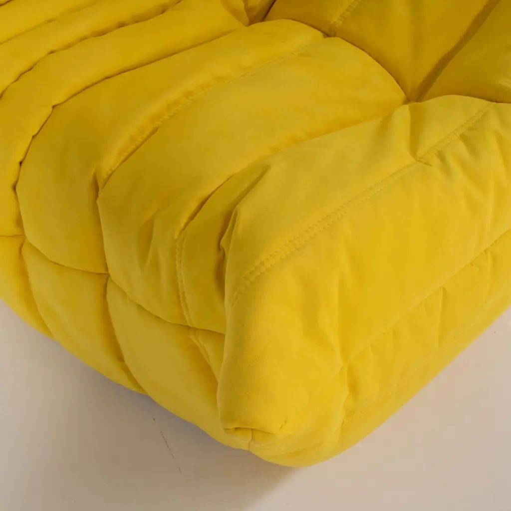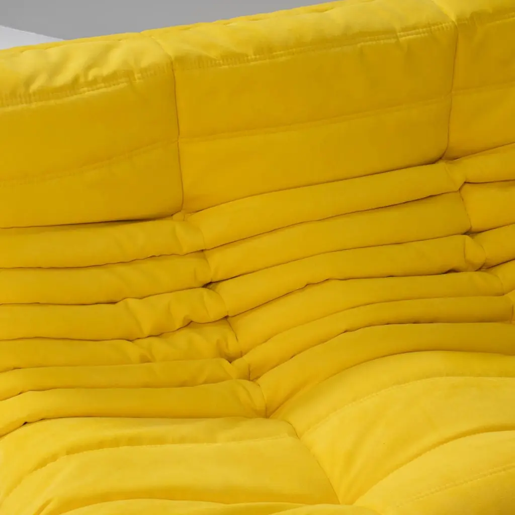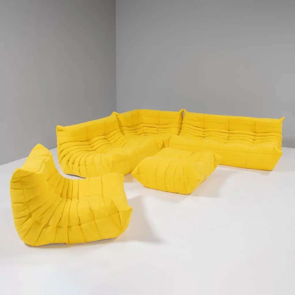 The iconic Togo sofa, originally designed by Michel Ducaroy for Ligne Roset in 1973 has become a design Classic. This five-piece modular set is incredibly versatile and can be configured into one large corner sofa or split for a multitude of seating arrangements. Comprising of a two seater yellow sofa, a three seater sofa, one corner seat, one armchair and a footstool, the set features brand new fabric upholstery that would make a stunning showpiece.All of the pieces feature the instantly recognisable pleated fabric design, which gives the sofa its relaxed aesthetic.Please note, some of our togo sofas are not available for immediate dispatch. Please enquire for further details on delivery timings.Lead time of 2 - 4 weeks.Measures:Three Seater Sofa: 70 cm (H) x 174 cm (W) x 102 cm (D)Two Seater Sofa: 131 cm (W) x 70 cm (H) x 102 cm (D) Corner Piece: 102 cm (W) x 70 cm (H) x 102 cm (D) Fireside Chair: 87 cm (W) x 70 cm (H) x 102 cm (D) Footstool: 87 cm (W) x 34 cm (H) x 80 cm (D)Have you heard about our free same-day returns? If you're not happy with your item at delivery, we’ll take it back on the spot!