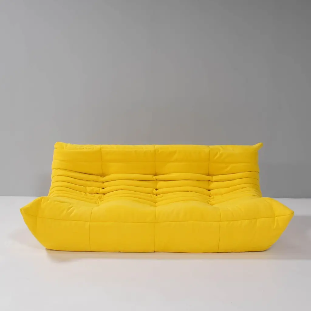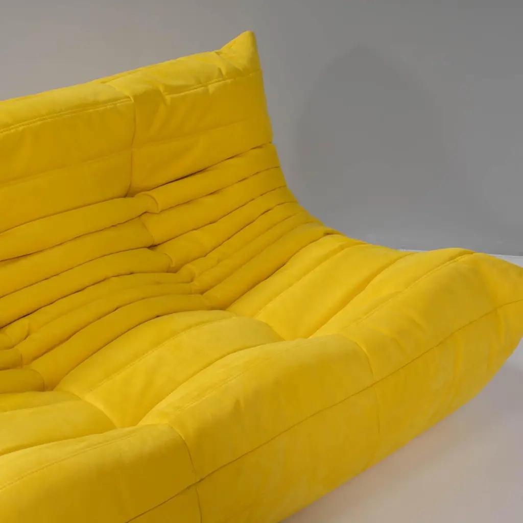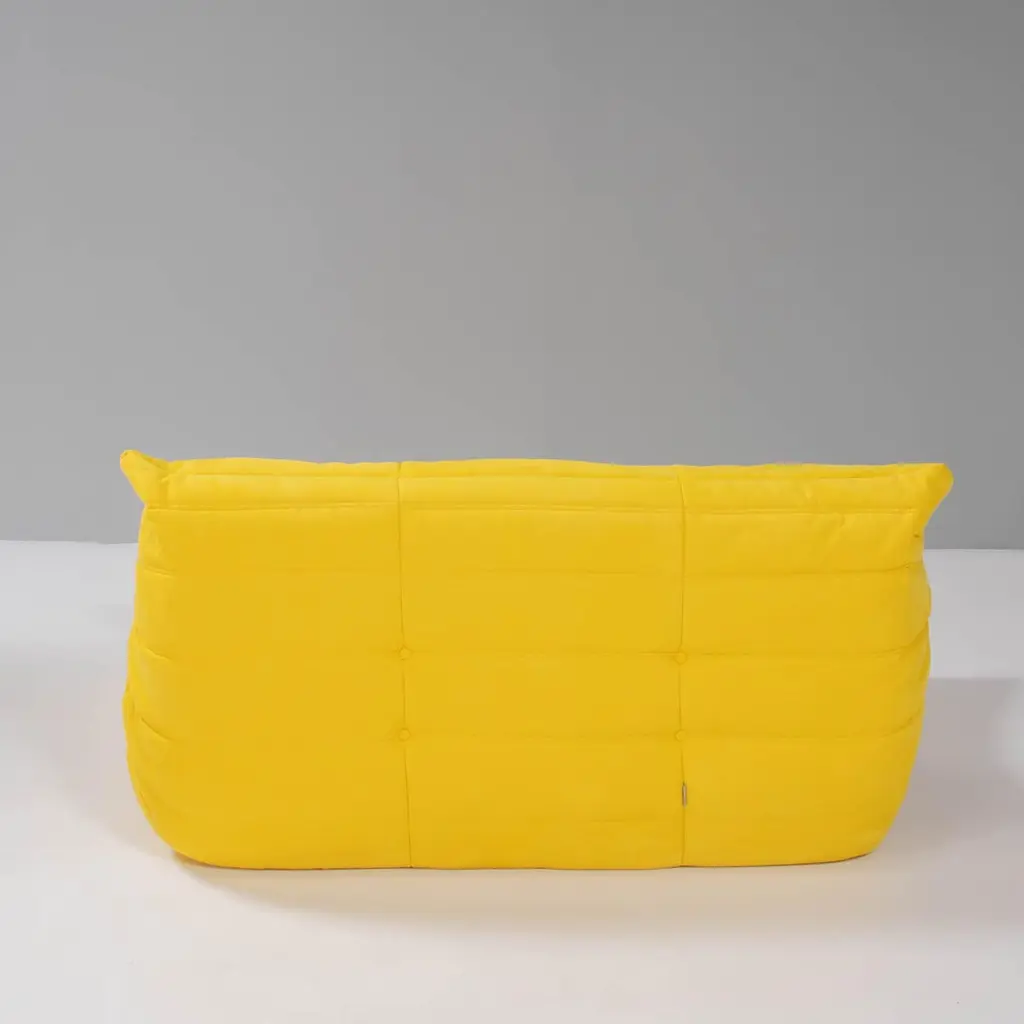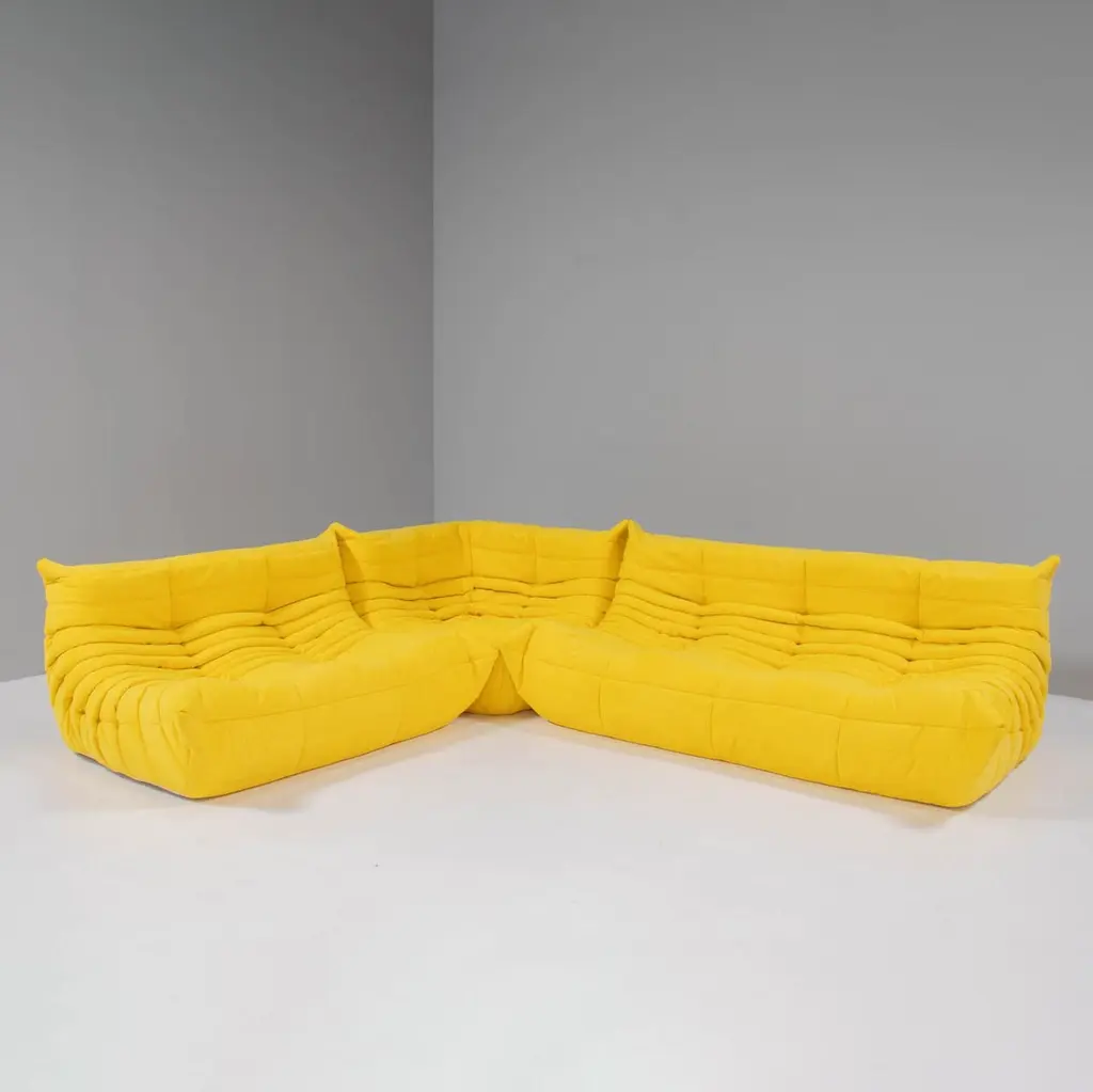 The iconic Togo sofa, originally designed by Michel Ducaroy for Ligne Roset in 1973 has become a design Classic. This five-piece modular set is incredibly versatile and can be configured into one large corner sofa or split for a multitude of seating arrangements. Comprising of a two seater yellow sofa, a three seater sofa, one corner seat, one armchair and a footstool, the set features brand new fabric upholstery that would make a stunning showpiece.All of the pieces feature the instantly recognisable pleated fabric design, which gives the sofa its relaxed aesthetic.Please note, some of our togo sofas are not available for immediate dispatch. Please enquire for further details on delivery timings.Lead time of 2 - 4 weeks.Measures:Three Seater Sofa: 70 cm (H) x 174 cm (W) x 102 cm (D)Two Seater Sofa: 131 cm (W) x 70 cm (H) x 102 cm (D) Corner Piece: 102 cm (W) x 70 cm (H) x 102 cm (D) Fireside Chair: 87 cm (W) x 70 cm (H) x 102 cm (D) Footstool: 87 cm (W) x 34 cm (H) x 80 cm (D)Have you heard about our free same-day returns? If you're not happy with your item at delivery, we’ll take it back on the spot!