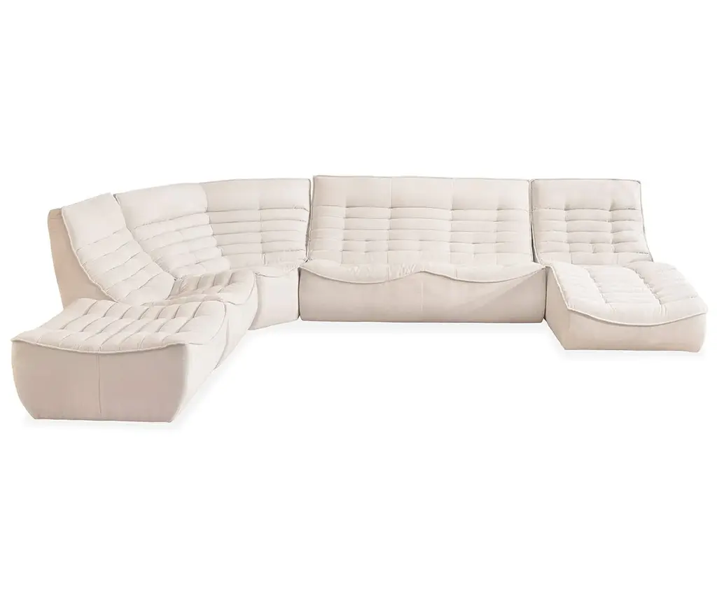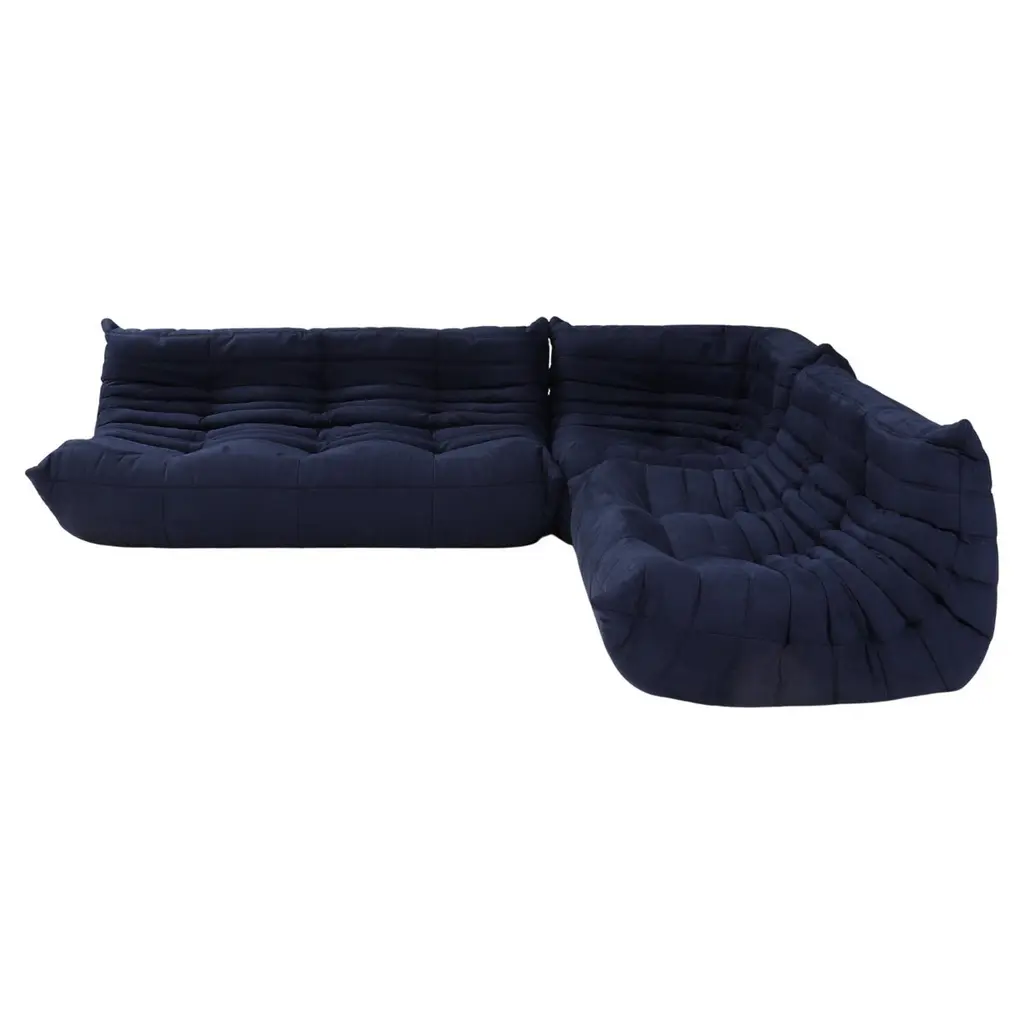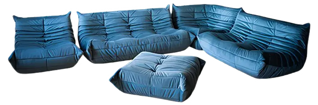 The iconic Togo sofa, originally designed by Michel Ducaroy for Ligne Roset in 1973 has become a design Classic. This five-piece modular set is incredibly versatile and can be configured into one large corner sofa or split for a multitude of seating arrangements. Comprising of a two seater sofa, a three seater sofa, one corner seat, one armchair and a footstool, the set features brand new fabric upholstery that would make a stunning showpiece.All of the pieces feature the instantly recognisable pleated fabric design, which gives the sofa its relaxed aesthetic.Please note, some of our togo sofas are not available for immediate dispatch. Please enquire for further details on delivery timings.Lead time of 2 - 4 weeks.Measures:Three Seater Sofa: 70 cm (H) x 174 cm (W) x 102 cm (D)Two Seater Sofa: 131 cm (W) x 70 cm (H) x 102 cm (D) Corner Piece: 102 cm (W) x 70 cm (H) x 102 cm (D) Fireside Chair: 87 cm (W) x 70 cm (H) x 102 cm (D) Footstool: 87 cm (W) x 34 cm (H) x 80 cm (D)Have you heard about our free same-day returns? If you're not happy with your item at delivery, we’ll take it back on the spot!