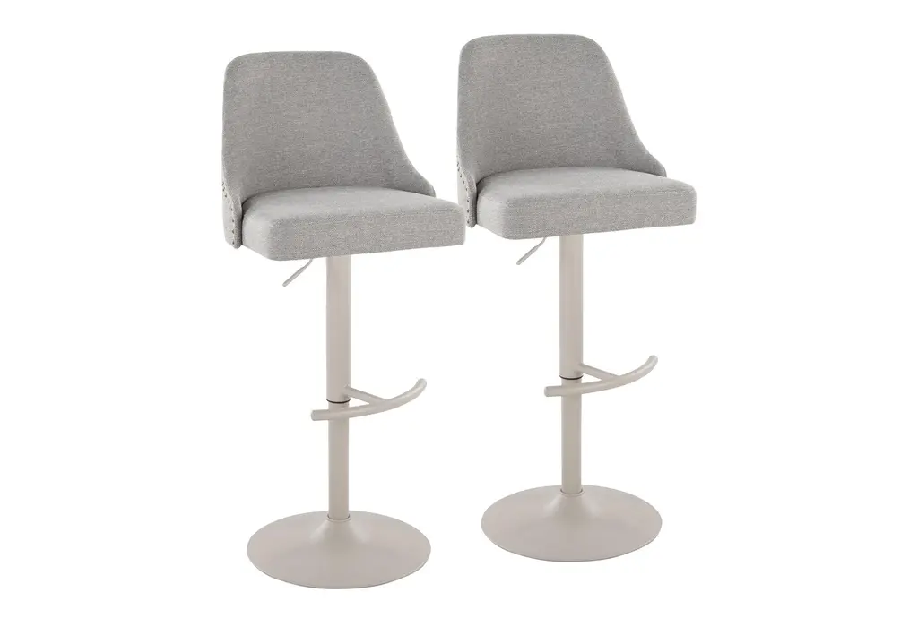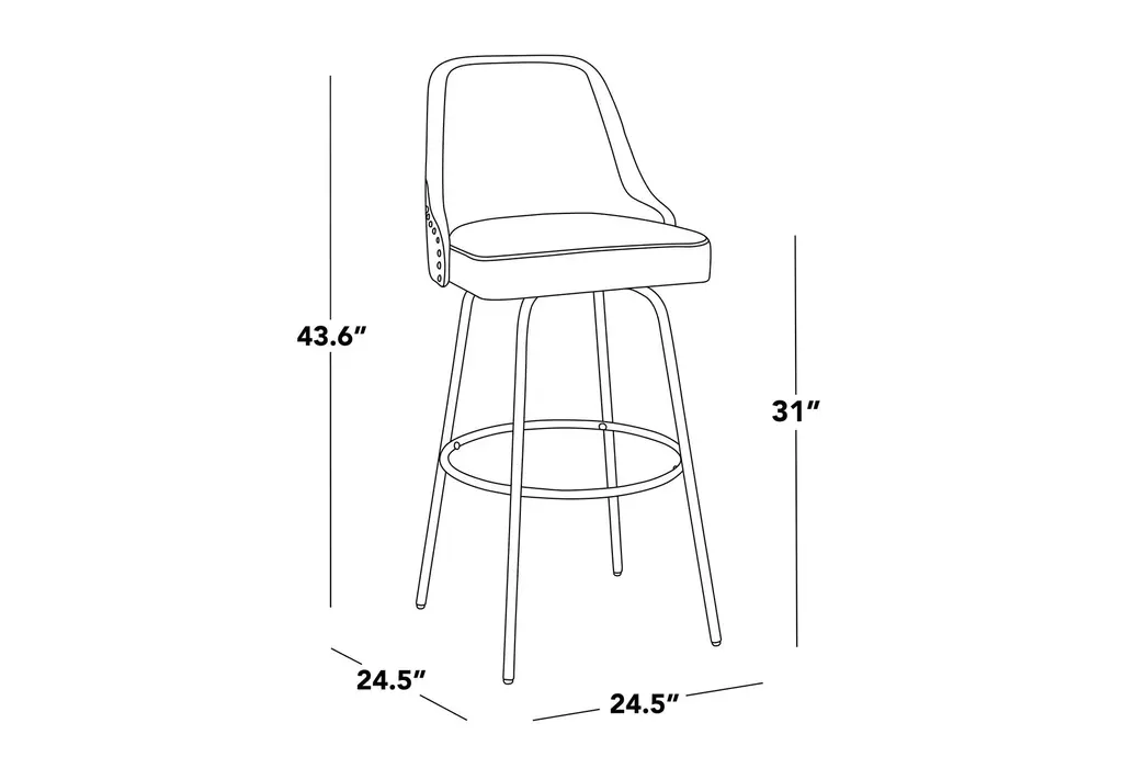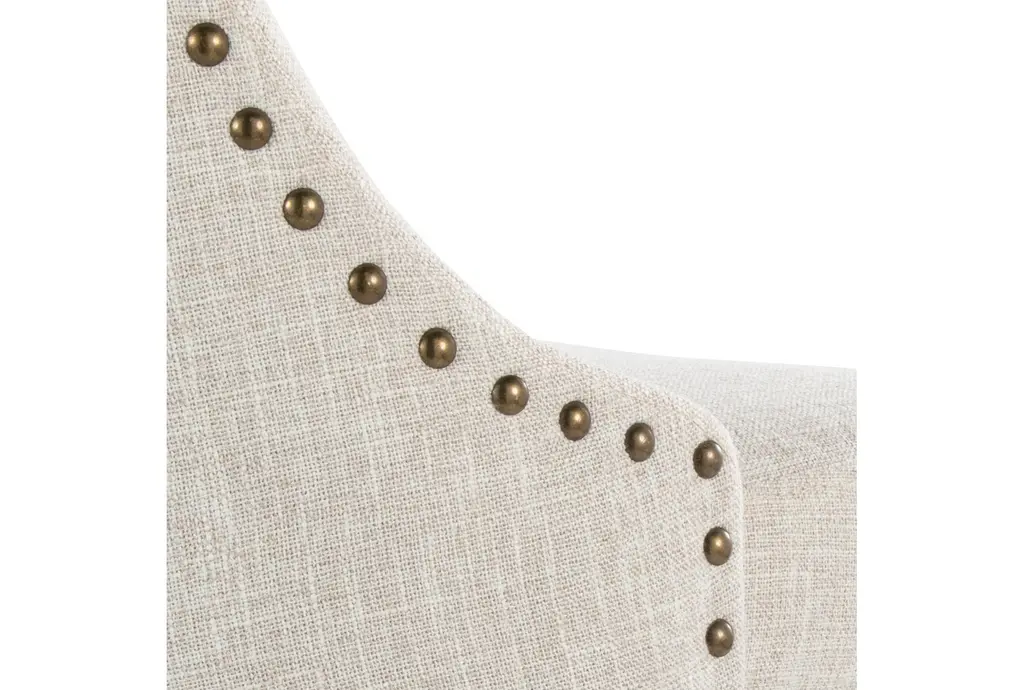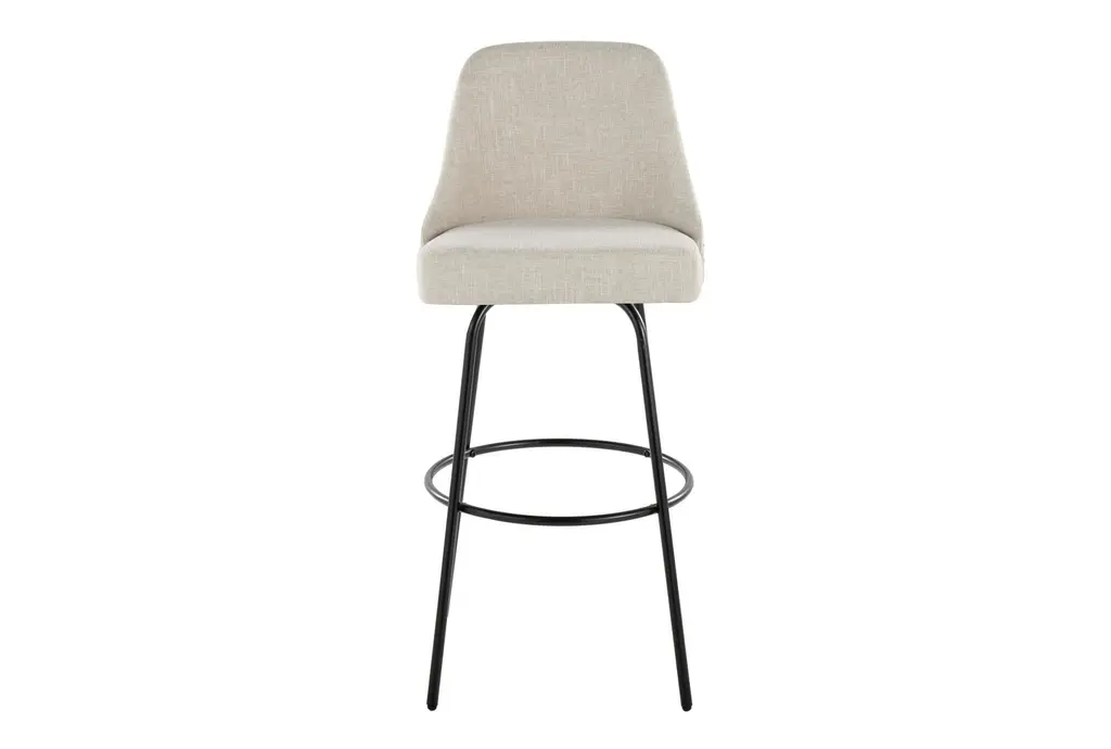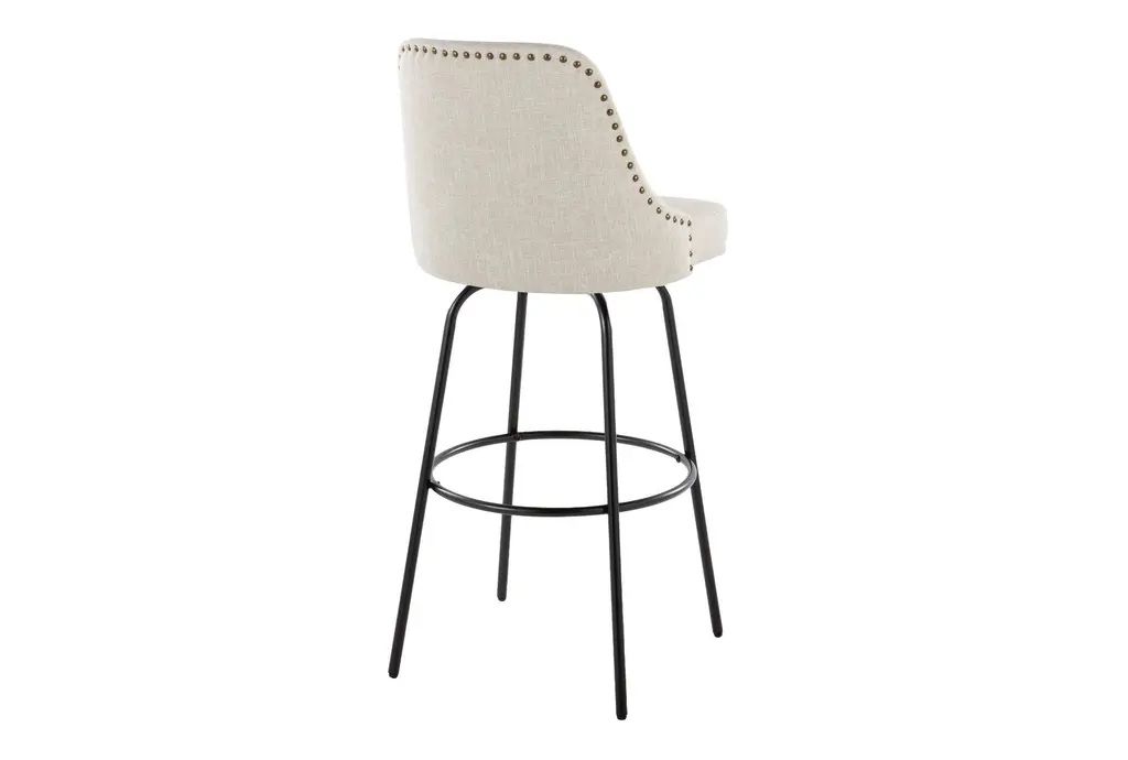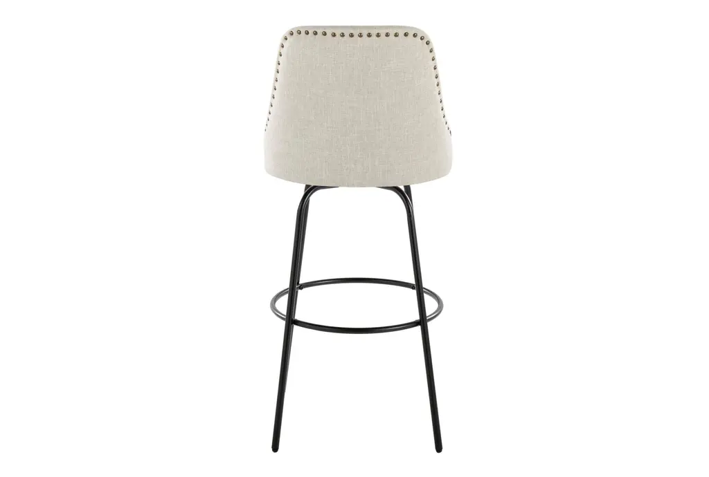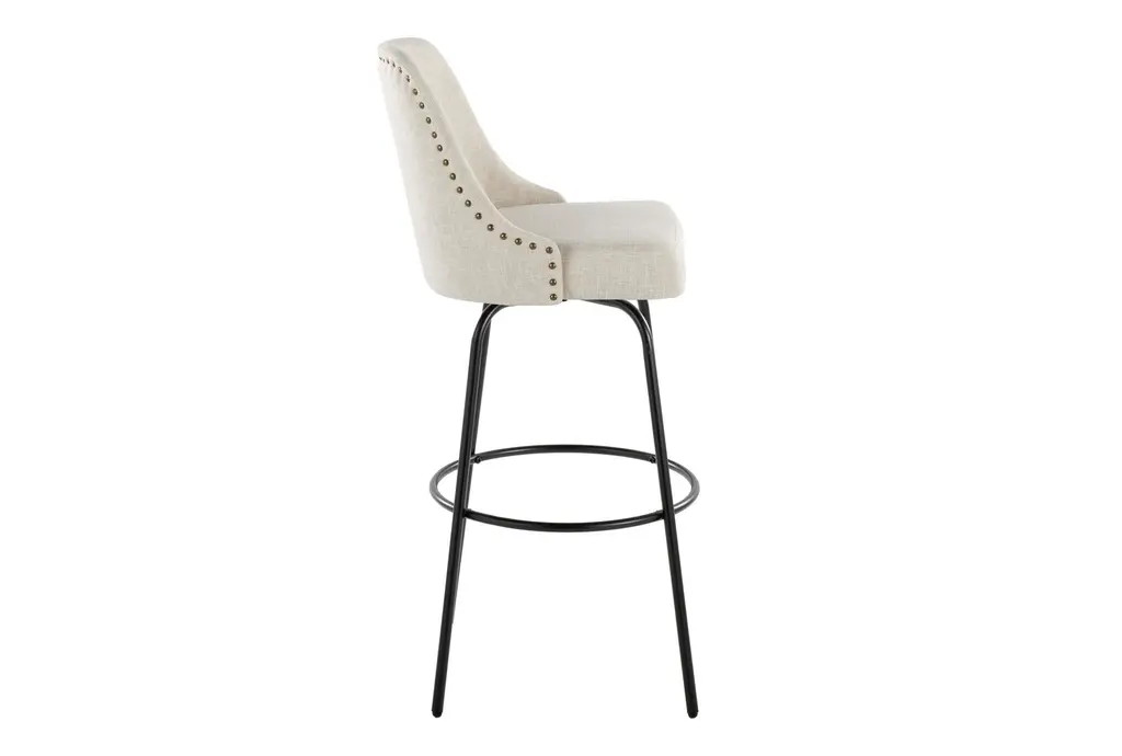 Marnie Studded 30" Barstool With Swivel brings approachable, contemporary seating to your kitchen or bar with cream fabric upholstery, brass nailhead trim, and a matte black metal base. The armless, curved seat is padded for comfortable perching and swivels smoothly so conversations and passing plates are effortless. A round black metal footrest ties the design together for practical support, and these stools are sold as a set of two to outfit a casual dining or prep area.