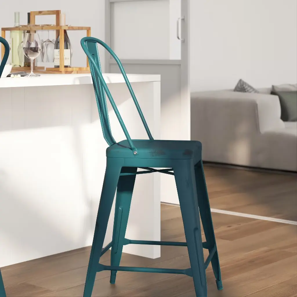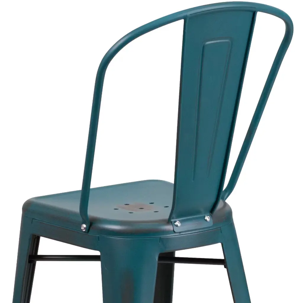Merrick Lane 24" Metal Indoor-outdoor Counter Stool With Vertical Slat Back And Integrated Footrest In Distressed Kelly Blue-teal