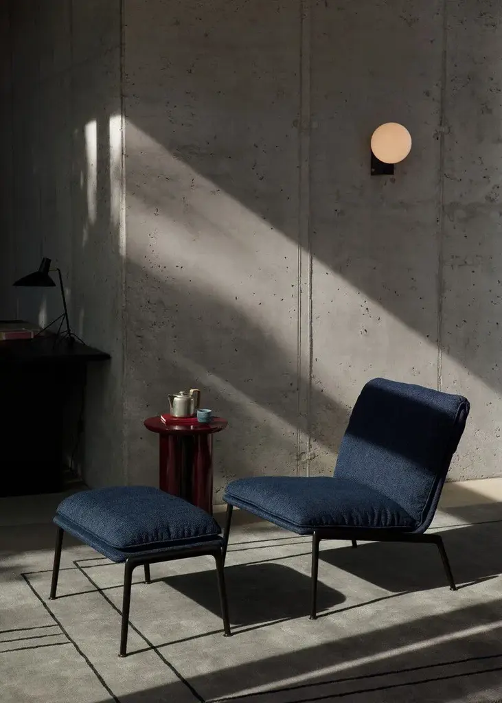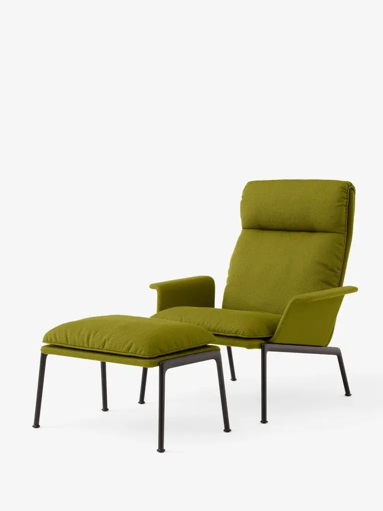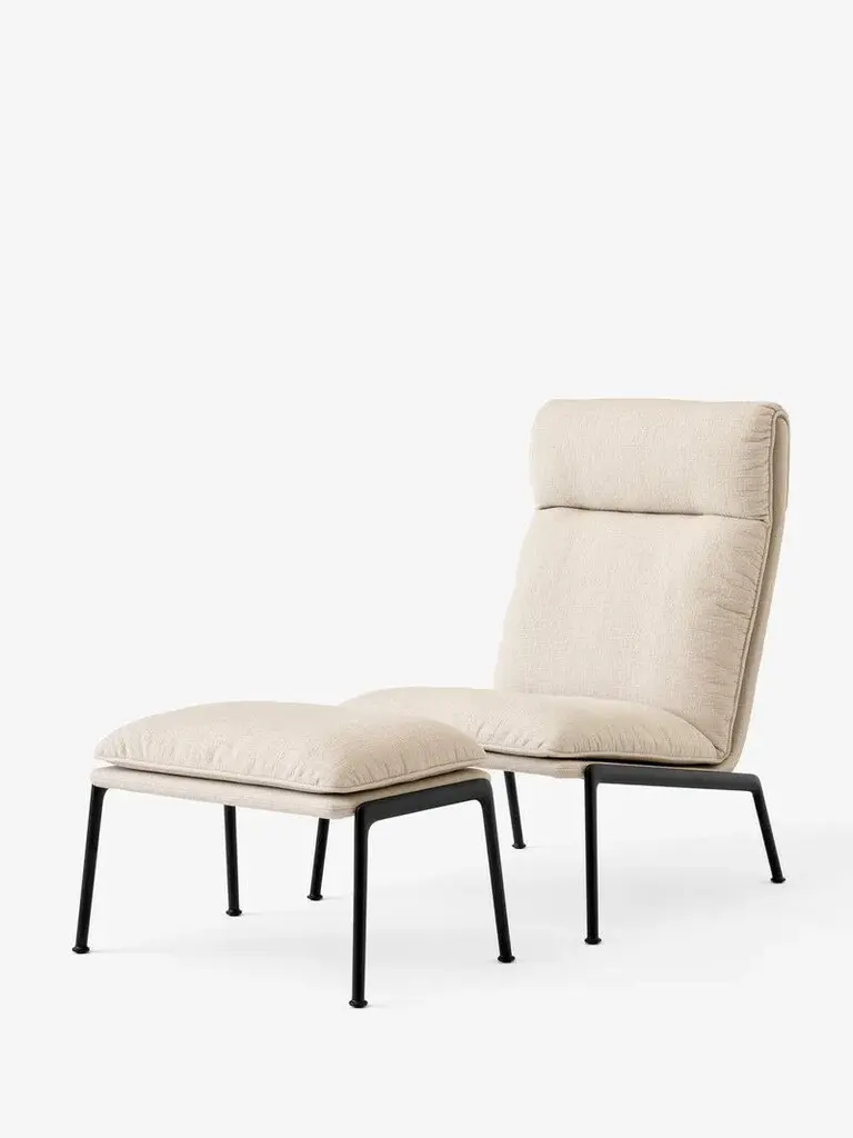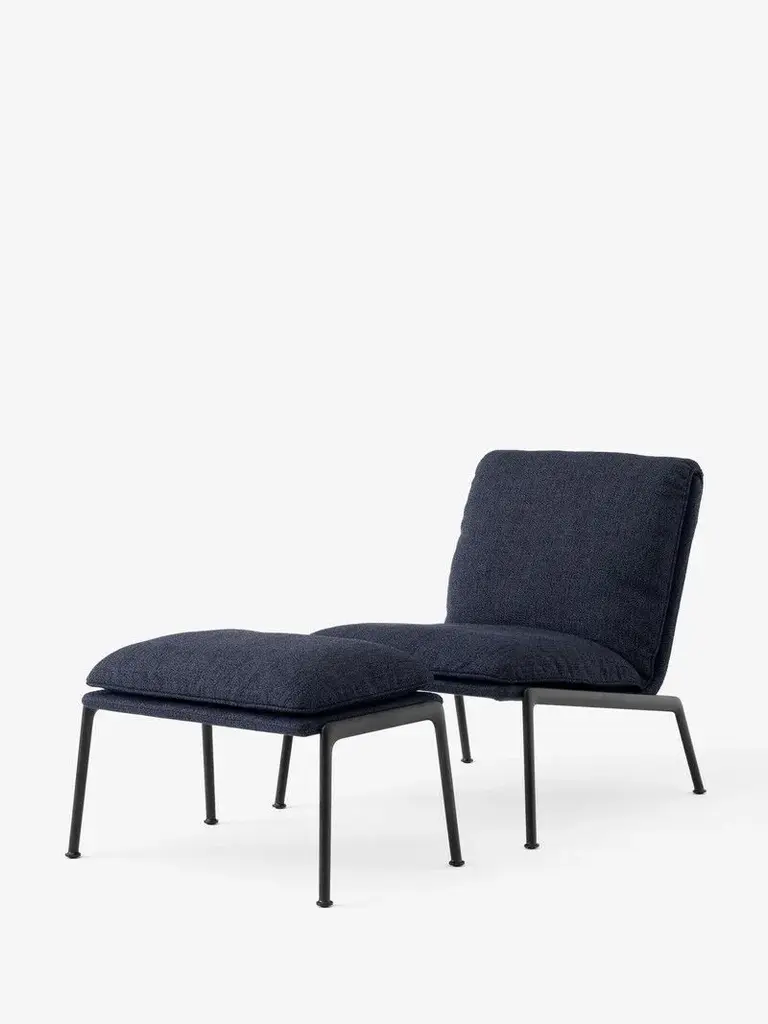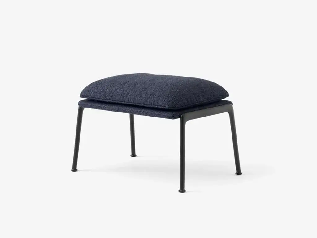 Envisaged to work in tandem with the Muno lounge chair, the footstool provides an additional level of comfort in lounging environments. Standing at the optimal height for both chair models, the footstool offers seamless support for extended relaxation. In addition, the design can also be used as a pouf or extra seating when hosting larger groups.Product MaterialPlywood frame, HR foam, polyester wadding, cast aluminium. Fabric or leather upholstery.Production ProcessThe frame is made from form-pressed plywood upholstered with foam and a textile cover. The cushion consists of duvets made from HR foam. The legs are made from cast aluminium and surface-treated with dark chrome or powder-coated in black. VariantsDark ChromeWarm Black