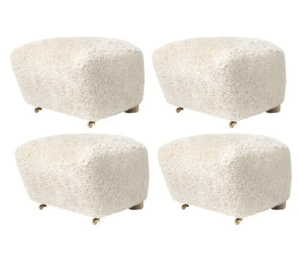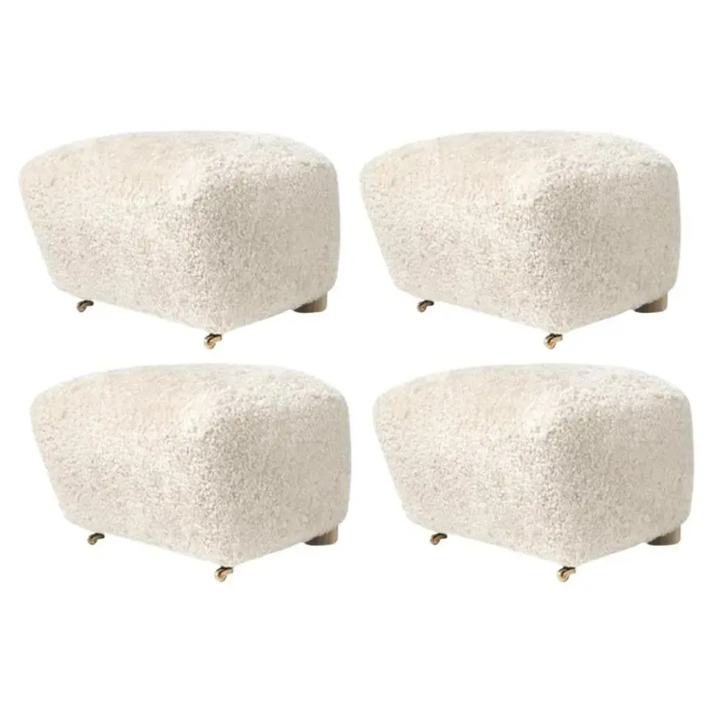 Set of 4 off white natural oak sheepskin the tired man footstools by Lassen. Dimensions: W 55 x D 53 x H 36 cm Materials: Sheepskin Flemming Lassen designed the overstuffed easy chair, The Tired Man, for The Copenhagen Cabinetmakers’ Guild Competition in 1935. It is characterised by organic, bearlike shapes and then as now it created a sensation with its curved form and voluminous armrests. Sitting in the chair should, in Flemming Lassen’s own ords, be ”as warm and safe as a polar bear cub in the arms of its mother in the middle of the ice cap”. The family man Flemming Lassen valued intimate relationships - with its warm exterior, The Tired Man invokes domestic cosiness and socialising by candlelight.
