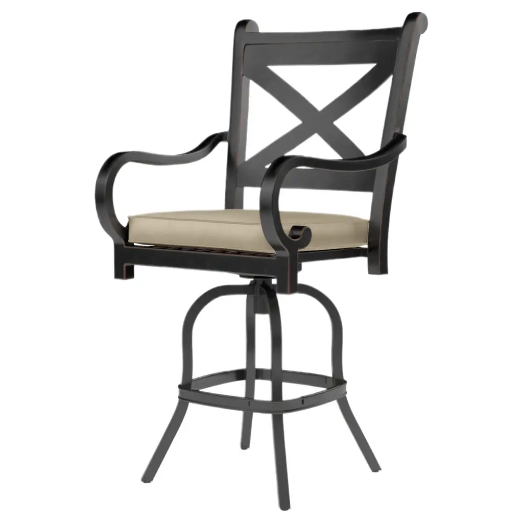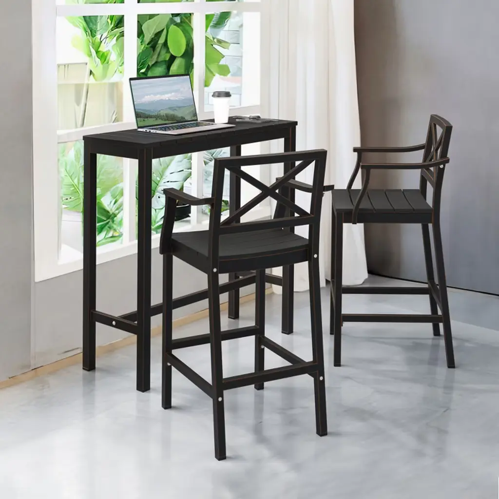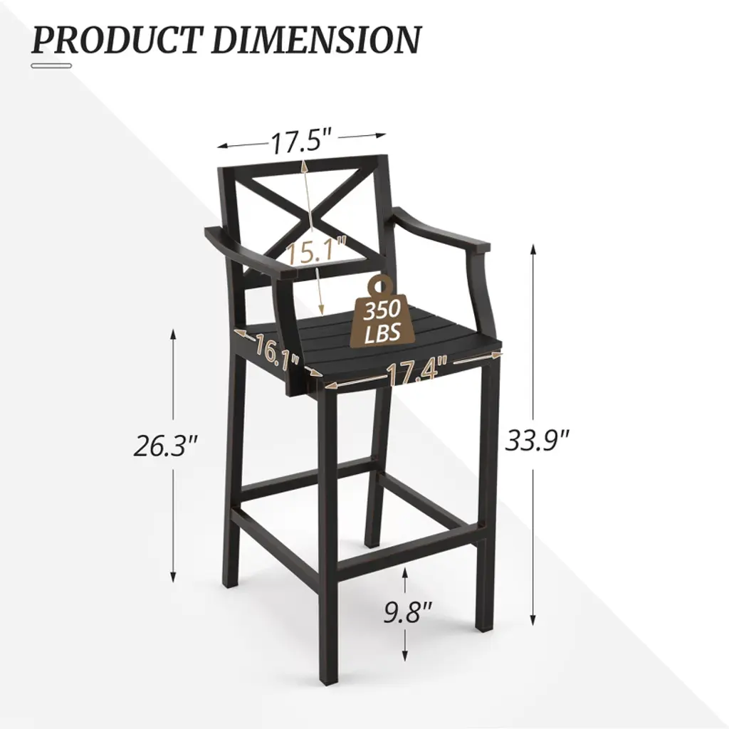 Comfort-First Design Designed for extended lounging, these bar stools feature ergonomically curved backrests and built-in footrests to support your lower back and legs with ease. Built to Last Reinforced aluminum frame and upgraded HDPS seat resist rust, weather, and daily wear. Adjustable foot pads keep stools steady on any surface. Indoor & Outdoor Ready Sleek enough for indoor spaces and durable enough for the patio—plus, they tuck neatly under most bar-height tables to save space. Modern Style with Arm Support Clean lines and a minimalist silhouette enhance any setting, while the armrests offer extra comfort during long sit-downs. Quick & Easy Setup Includes clearly labeled parts and step-by-step instructions for a stress-free 15-minute assembly—no extra tools needed.