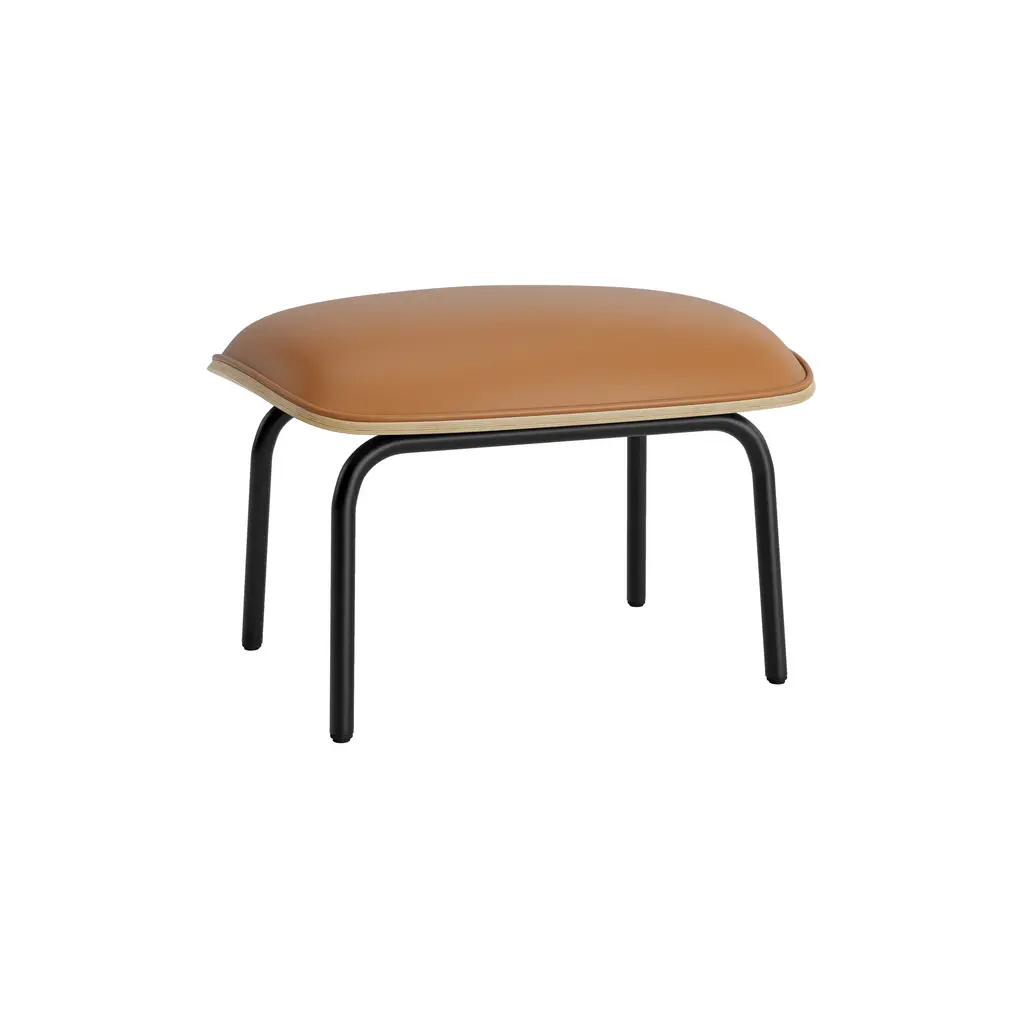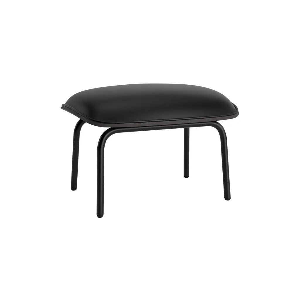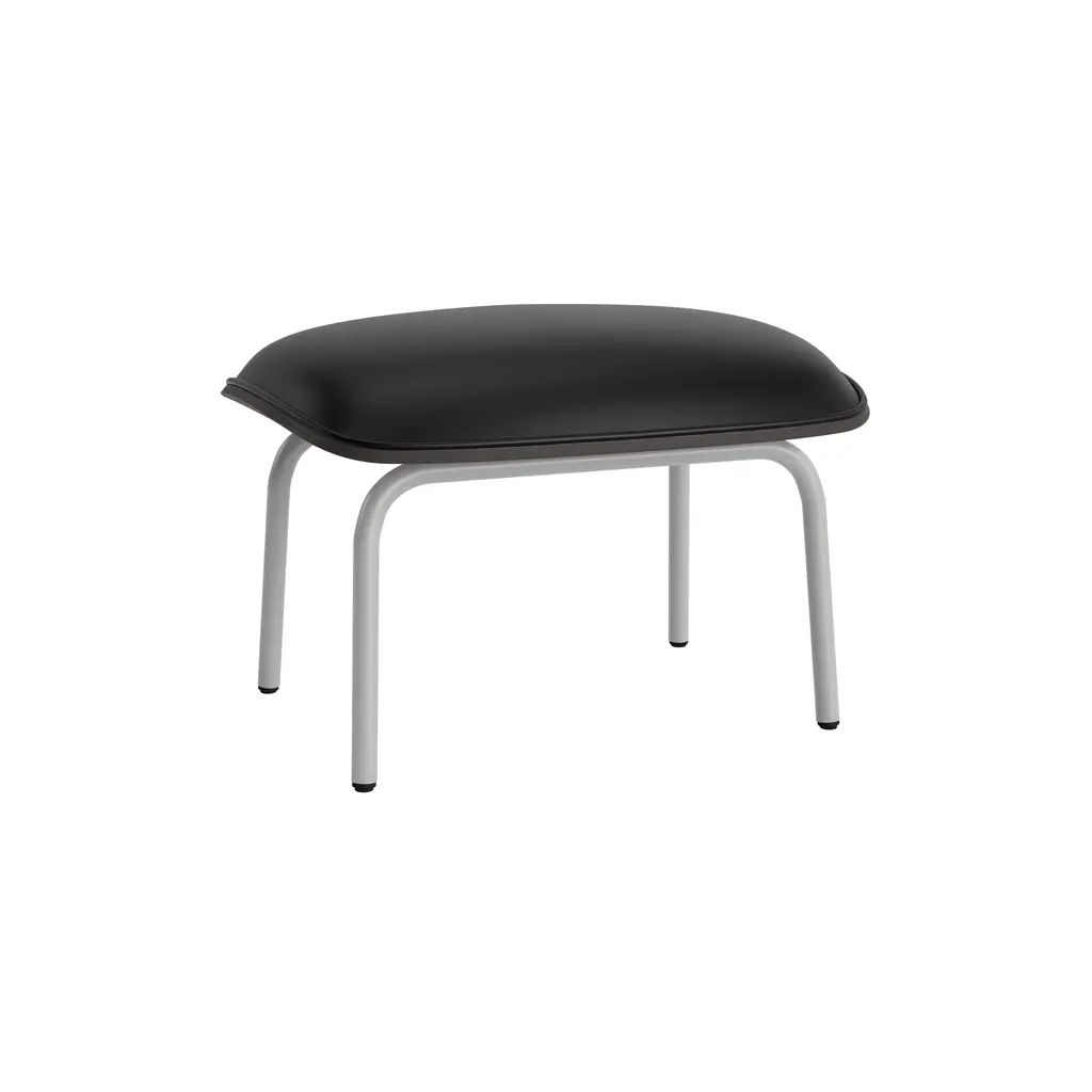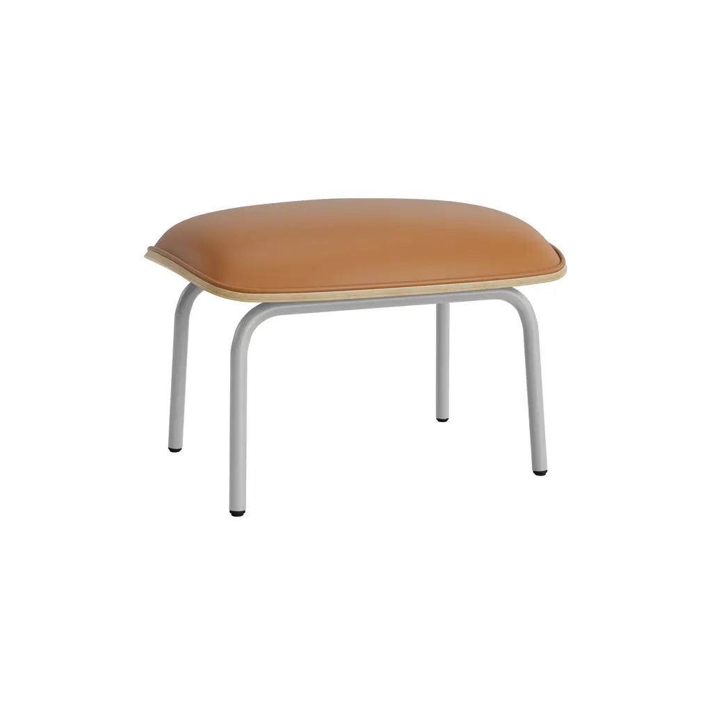 Pad takes its shape from typically Danish molded veneer and adds a finely upholstered, plump cushion of molded PU foam for creature comfort. Swathed in a premium textile or smooth leather, the footstool reveals an hint of the veneer in either a natural oak or painted finish. The powder-coated tubular steel legs in grey or black add a streamlined fillip from designer Simon Legald.