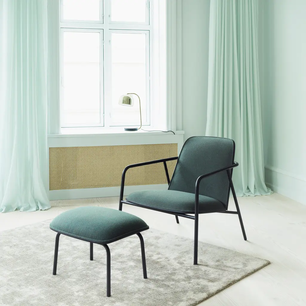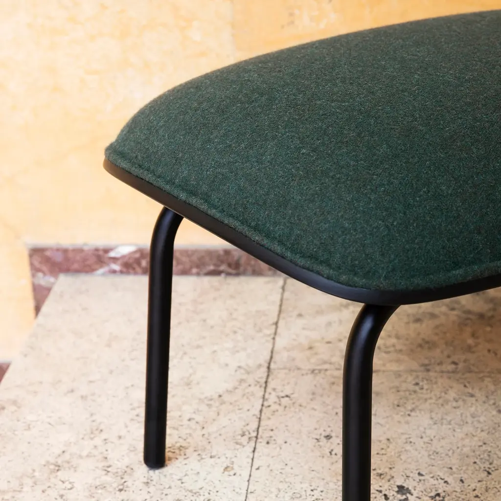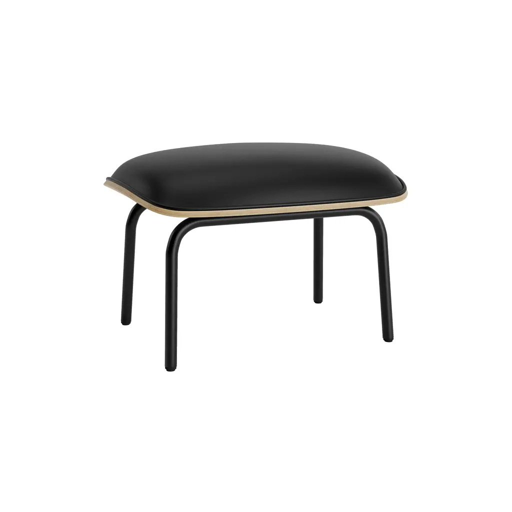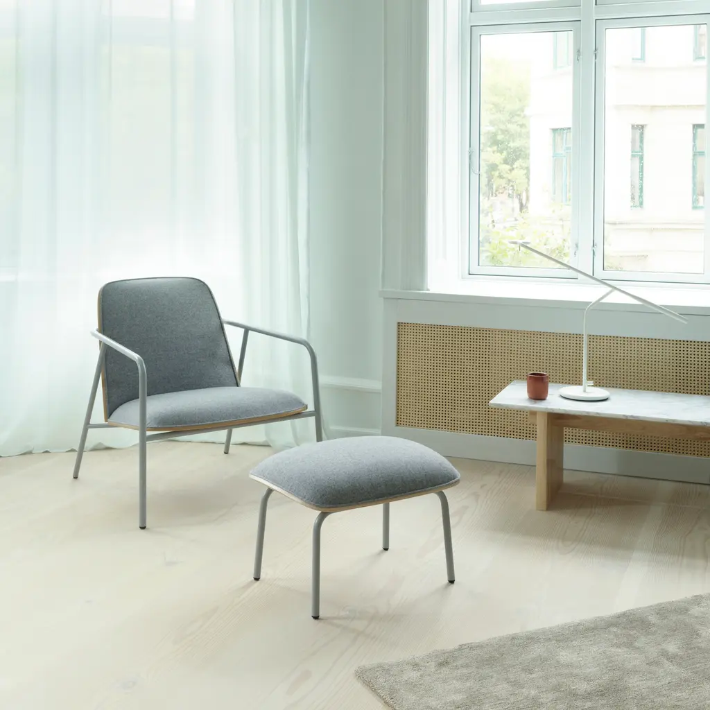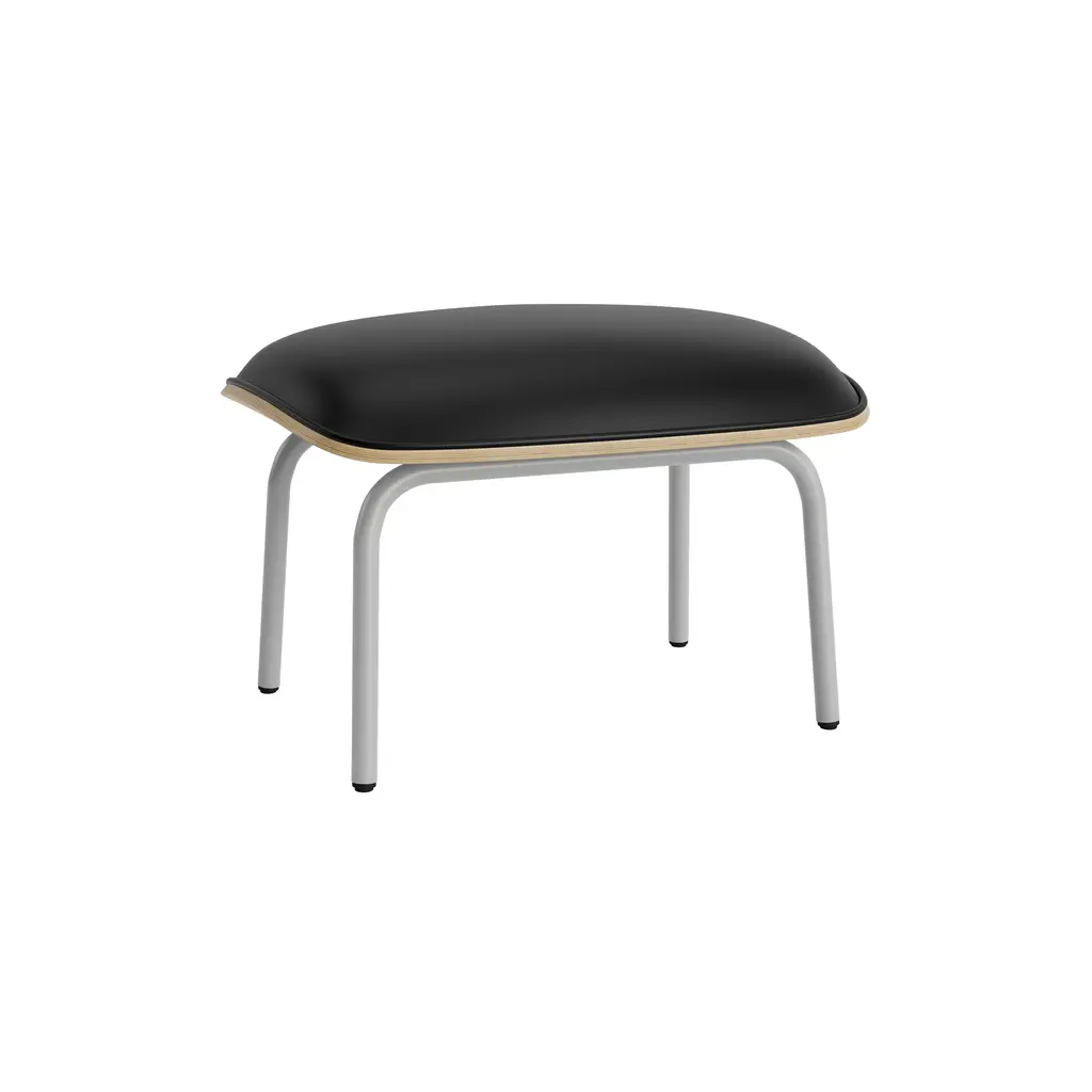 Pad takes its shape from typically Danish molded veneer and adds a finely upholstered, plump cushion of molded PU foam for creature comfort. Swathed in a premium textile or smooth leather, the footstool reveals an hint of the veneer in either a natural oak or painted finish. The powder-coated tubular steel legs in grey or black add a streamlined fillip from designer Simon Legald.