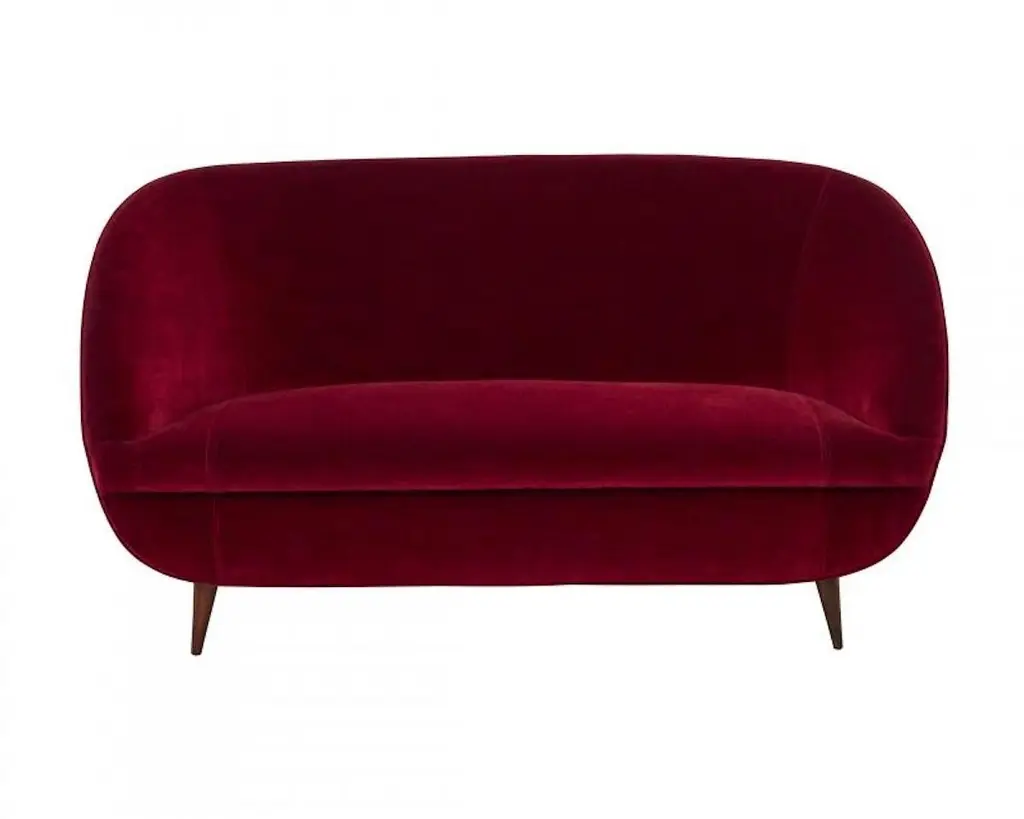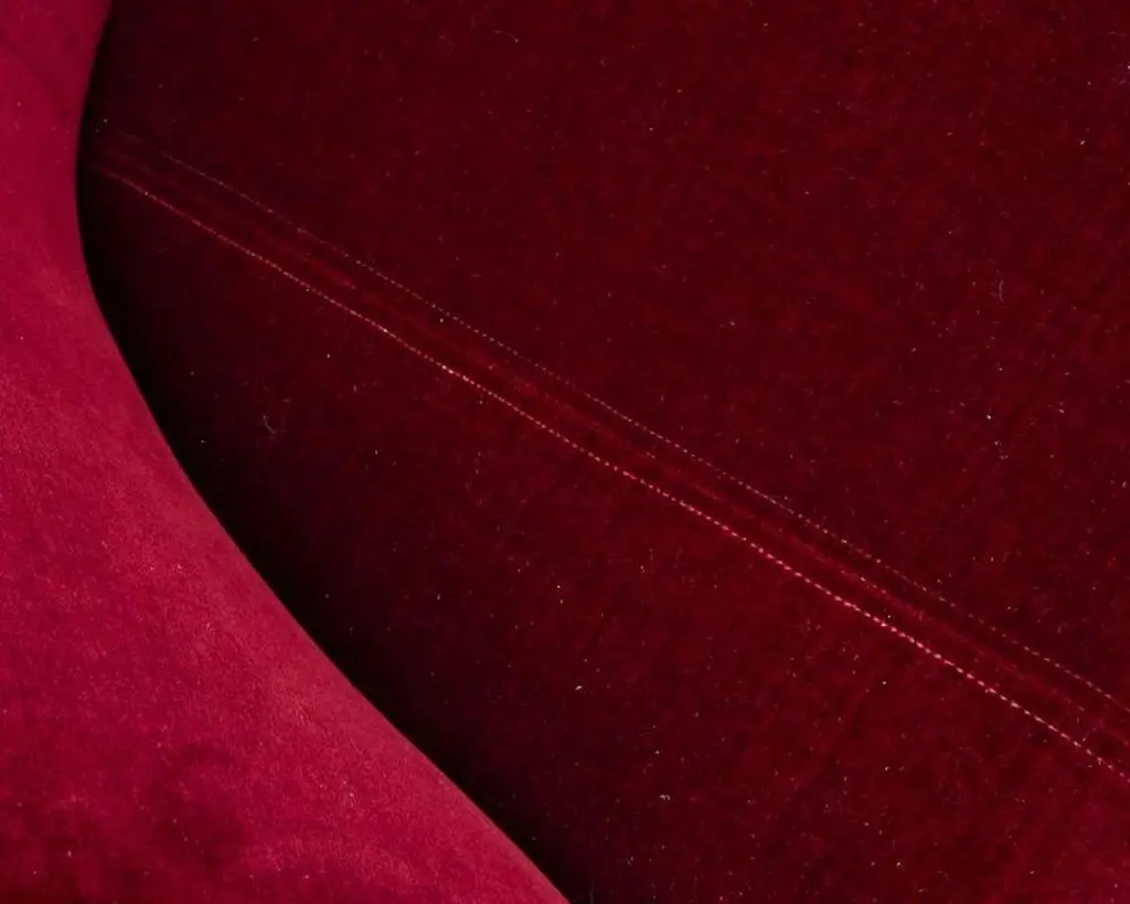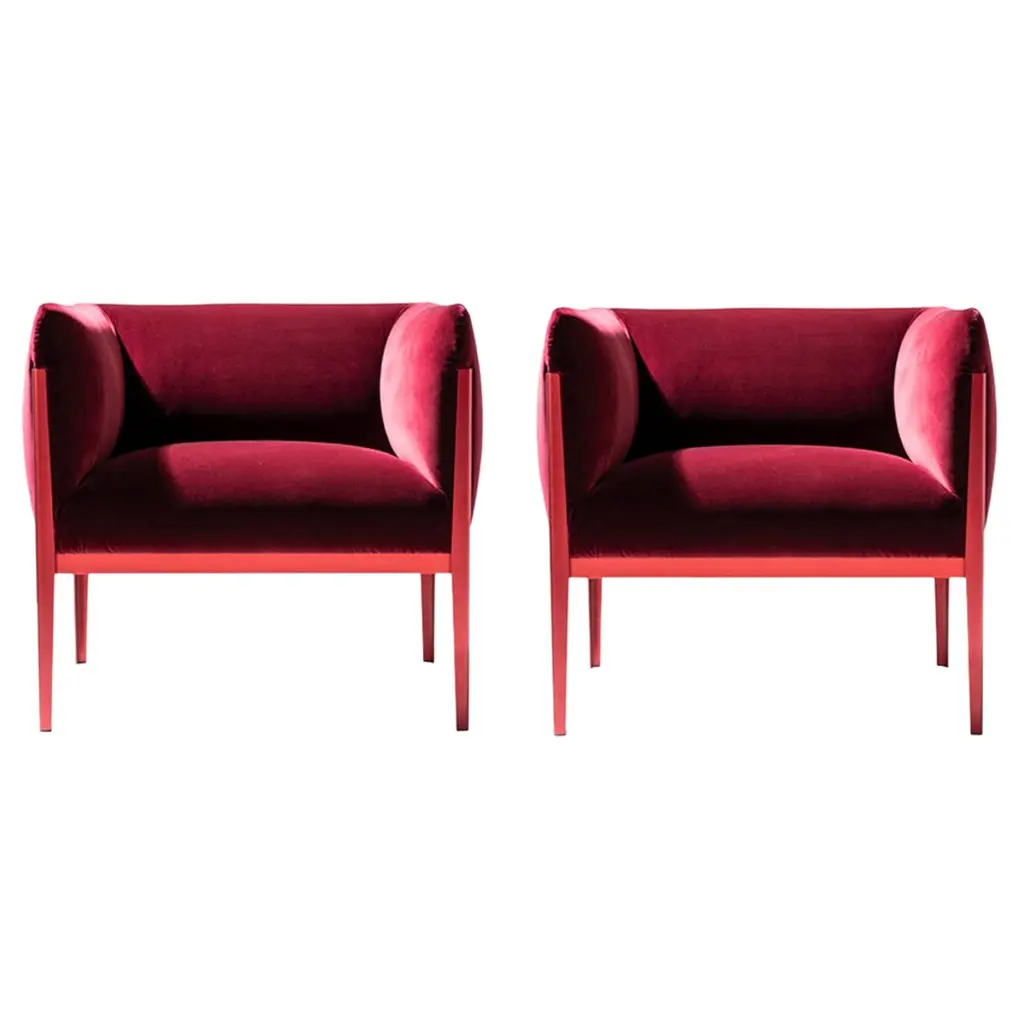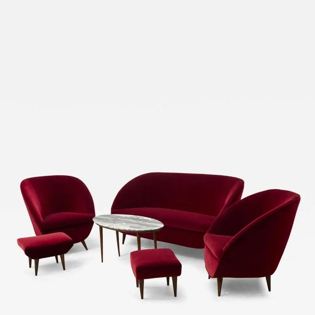 Pair of Period Milanese Style armchairs and foot stools, in the school of ISA Bergamo. These chairs and the entire set may have been produced by Fede Chieti or ISA. They have been completely re-built and newly re-upholstered Fabric is in Rigoletto Cotton Velvet by Kerry Joyce Textiles. The color is Sangria. There are other pieces of this set of furniture independently listed Measurements are below.The pricing is for the pair of chairs with footstools. The sofa and marble top table are priced separatelySofa measures 60"L x 20"D x 30" seat height is 17"Chairs Measure 28.5"L x19"D x30.5"H seat height is 17"Ottomons 14" x 18" x 12" H