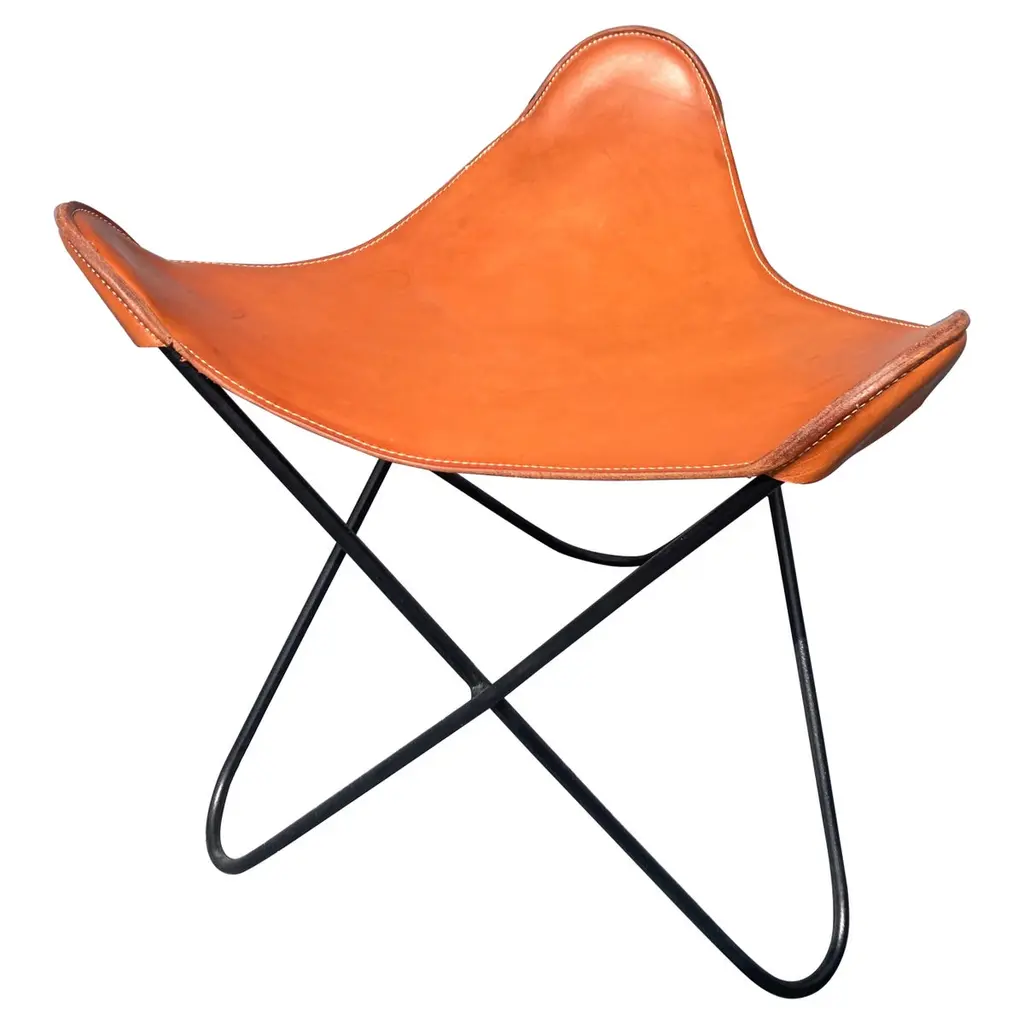 Pampa Flying Goose Footstool by Cuero DesignDimensions: D 48 x W 47 x H 48 cm.Materials: Leather and metal.Finish: Polo leather and black frame.Weight: 5,5 kg.Available in different upholstery and metal color options and finishes. Prices may vary. Please contact us.Designed to be easily carried around, this stool is ideal to have on hand. Stable and sturdy, the Flying Goose will be your best ally on any occasion. With its compact design and weightlessness, you won't ever have to worry about it being a burden. Its floor protectors won't damage your floors and ensure stability when you sit on it. The alliance of solid 12mm Swedish steel and Italian leather guarantees an ever-lasting stool, no matter the use.Cuero DesignWe make furniture that we want to have in our own homes. Everything has to be comfortable, beautiful, and very high quality. Second-generation family business. Since 1986 - My father started importing luxury leather goods from South America to Sweden. He eventually discovered the butterfly chair which is a classical design from Argentina and became obsessed. 15 years of his life were dedicated to improving its shape and quality. Agustina is from Patagonia and Nils is from Sweden.