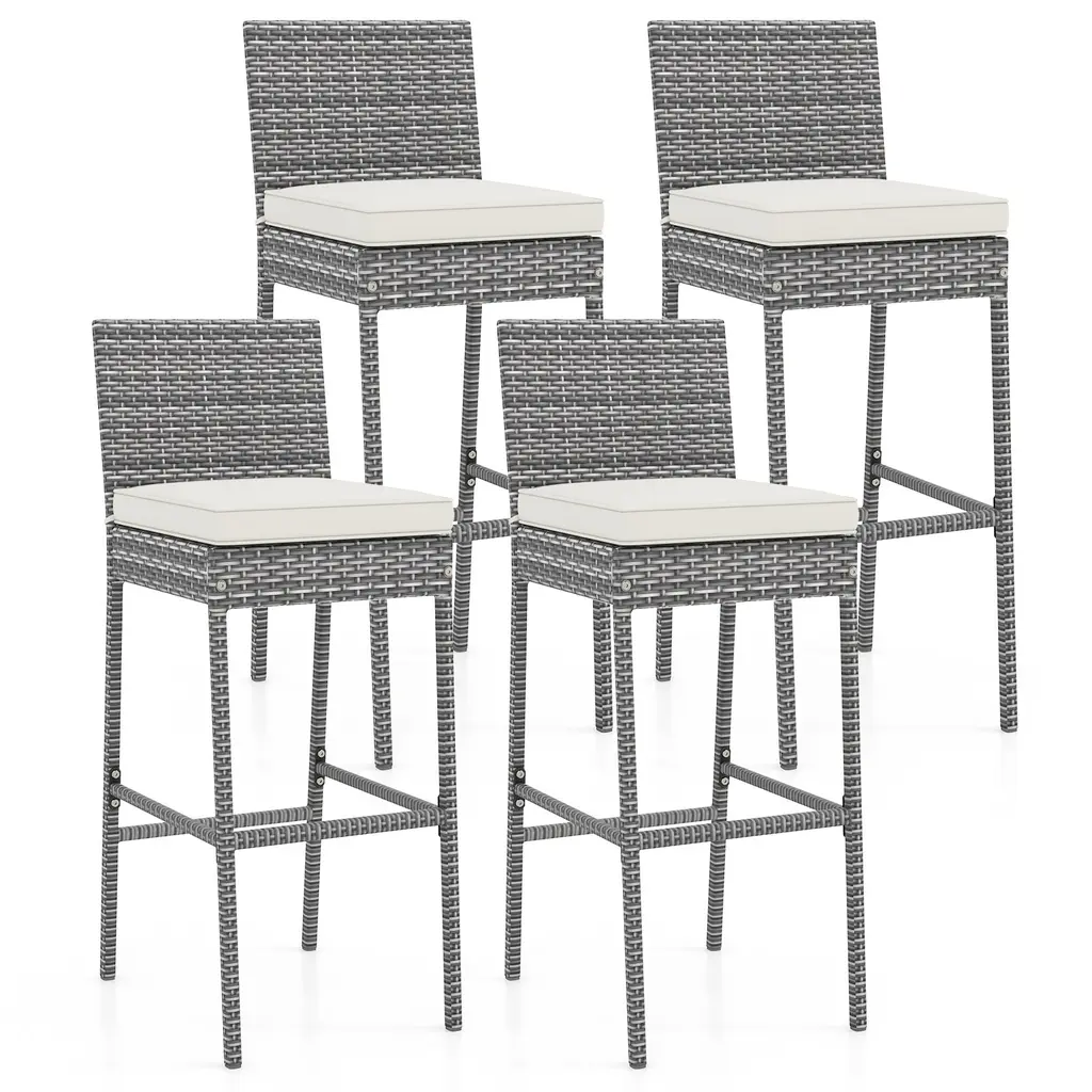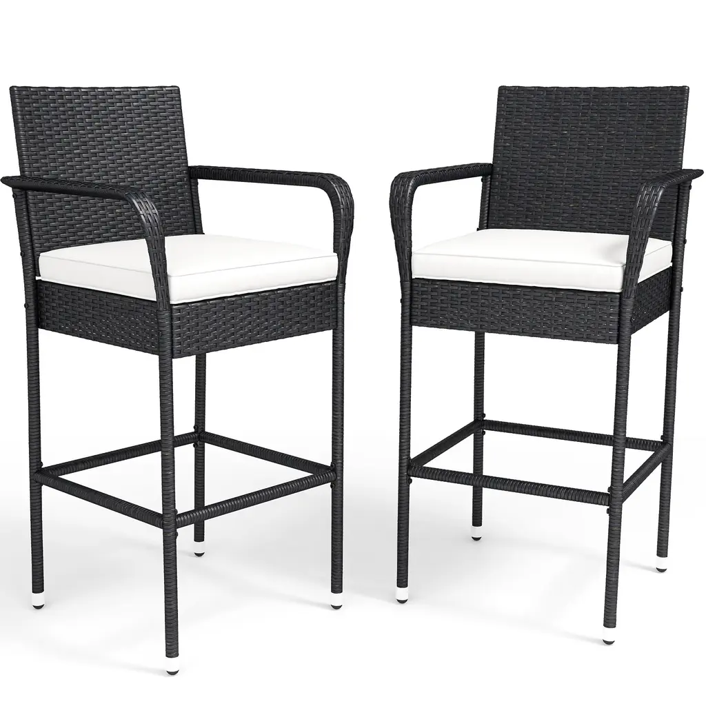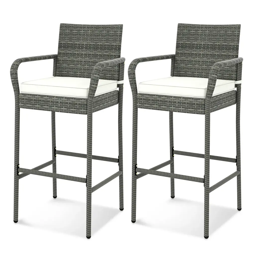 Specifications:Description:Enhance your outdoor space with these stylish and durable barstools, featuring hand-woven grey PE rattan that resists fading for long-lasting appeal. The heavy-duty metal frame offers exceptional stability and can support up to 400 lbs, ensuring strength and reliability. Designed with a 30" seat height, these barstools are perfect for 40"-48" bar tables, and the 14" footrest provides added comfort. The 12.5" backrest offers firm support, making these seats ideal for extended relaxation. Equipped with soft cushions made from high-density foam, these barstools deliver ultimate comfort, and the cushion covers are easy to remove and clean with smooth zippers. Perfect for use around the pool, in your backyard, or on the balcony, these wicker barstools are designed to bring a touch of sophistication to any outdoor area (though it’s recommended to avoid prolonged rain exposure for best results).Key Features:● Appealing Rattan: The mix grey PE rattan wrapped outside is hand-woven, stylish and anti-fading, which also ensures long-lasting service life. Therefore, the barstools with stylish look will be a perfect addition for outdoor relaxing space.● Strong Metal Frame: The main frame of the bar chairs is constructed of heavy-duty metal, which is of high stability and deformation resistance. Each barstool can load up to 400 lbs.● Appropriate Size: With 30" seat height, this bar chair set suits well for 40"-48" bar tables. Moreover, the 14" high convenient footrest offers a perfect place for you to relax feet. And the 12.5" comfortable backrest offers firm support to you.● Soft Cushioned Comfort: Each barstool is equipped with a soft cushion which includes high-density sponge inside for more coziness. Plus, the fixing ties make the cushions always in right place. And the smooth zippers make the covers easy to wash.● Wide Range of Applications: These patio wicker barstools with cozy seat feature wide application, such as poolside, backyard and balcony. But please avoid rain exposure for longer serving time.