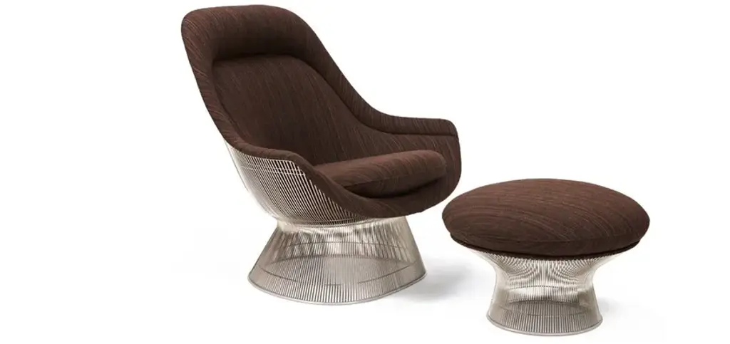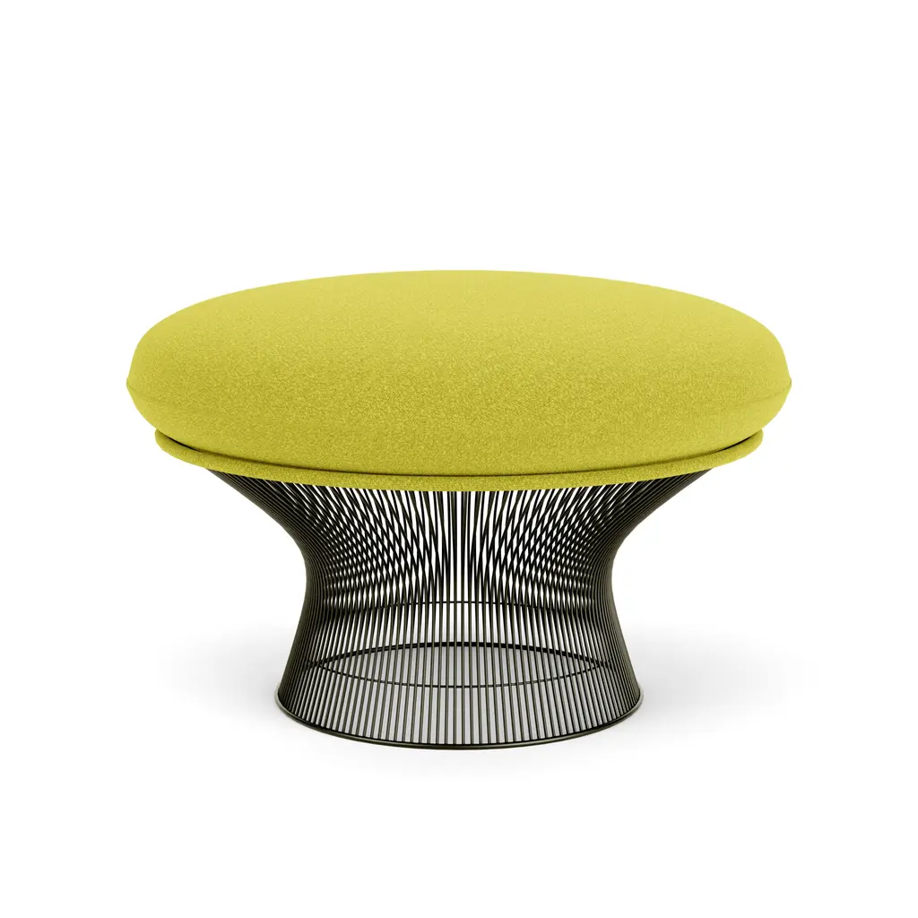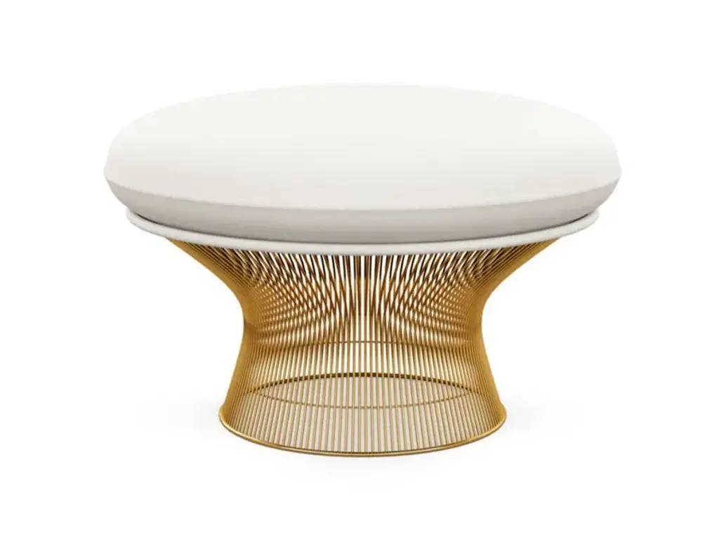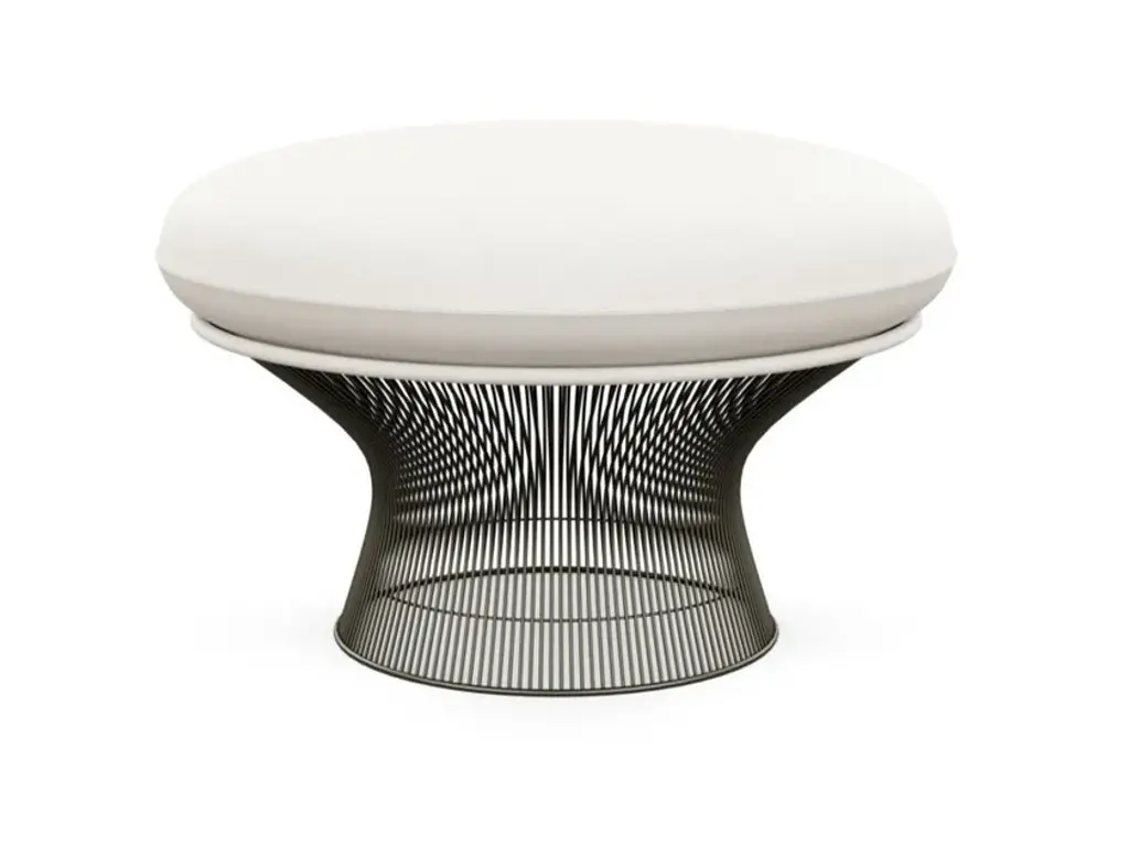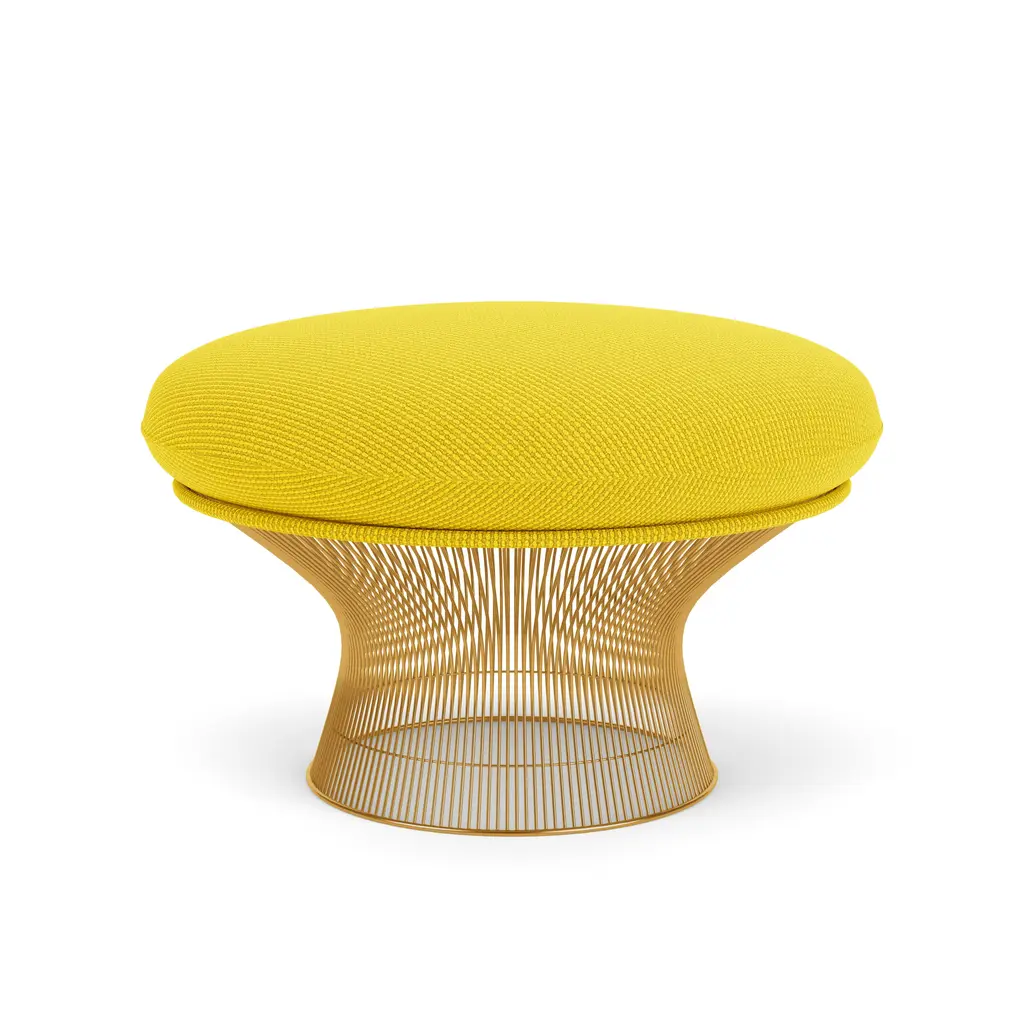 FEATURESThe Ottoman was only produced between 1966 and 1988. CONSTRUCTIONFrame: Hand manufactured forms created by vertical steel wire rods welded to circular horizontal and edge-framing rods. Bright nickel finish with clear lacquer protection.Base: Clear plastic extrusion ring for smooth bottom surface.Upholstery: Moulded fibreglass shell with foam cushion quilting. Cushions with latex core and zipper cover attach to seat with Velcro.FINISHESAvailable in a variety of fabrics. Finish in plated 18k gold, polished Nickel or Metallic Bronze.