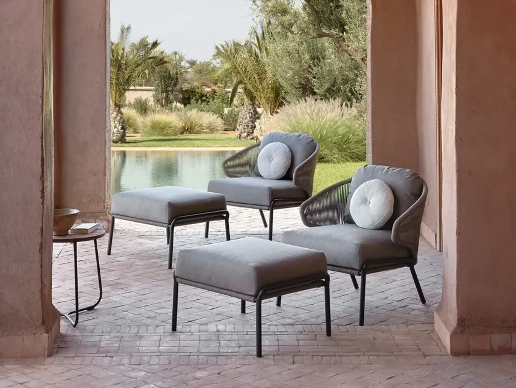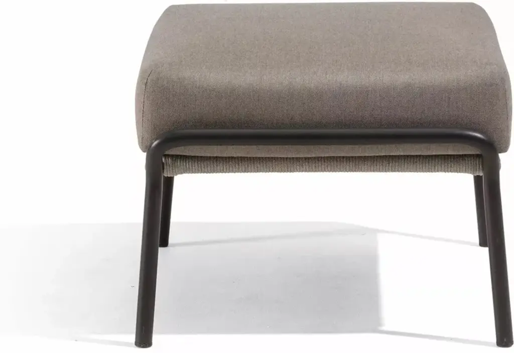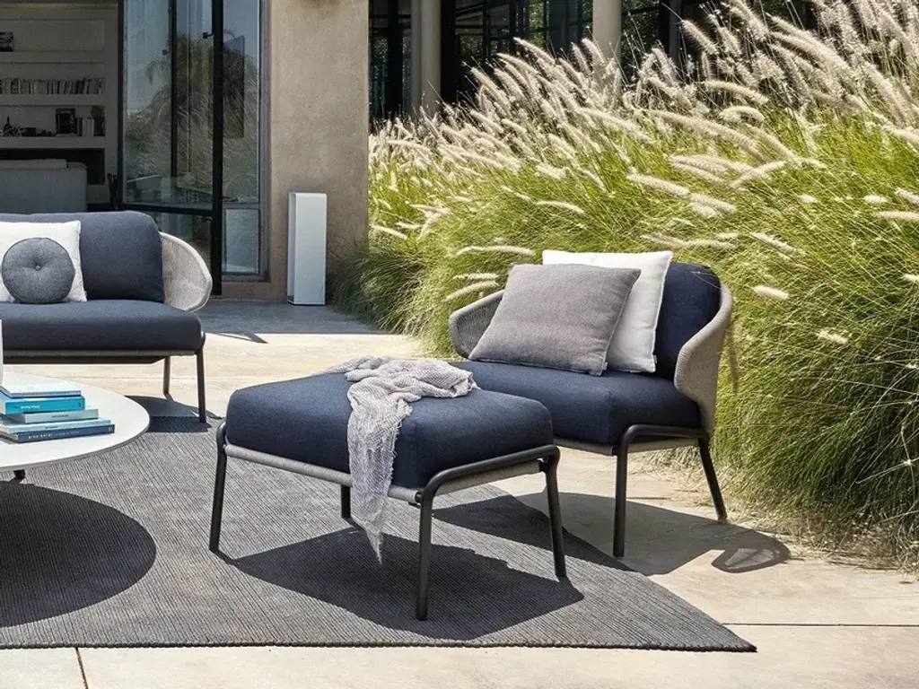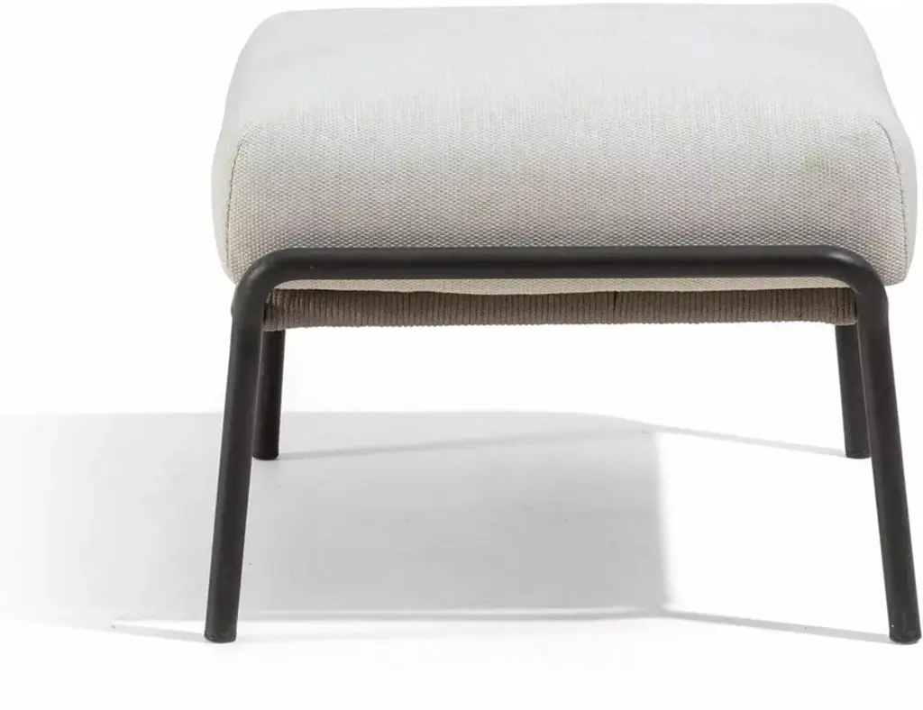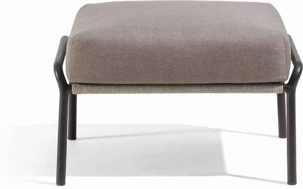 Radius FootstoolFrame made of thermo-lacquered Lava aluminium, and Bronze or Silver rope. Seat cushion.The unique, airy design of the RADOC chair, footstool, lounge chair and sofa collection is perfect for exquisite moments of warmth and closeness. The wrap-around back and armrests, made entirely out of rope, blend seamlessly and give each piece a neomodern yet timeless look and feel. Keep it sober or opt for matching backrest cushions designed for optimal seating comfort for long get-togethers.