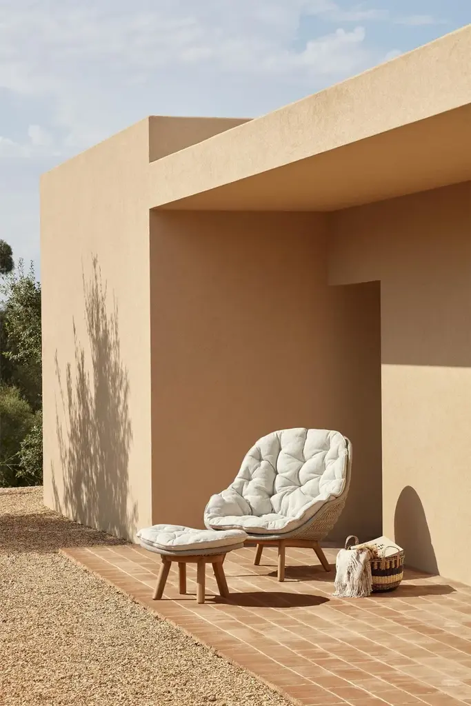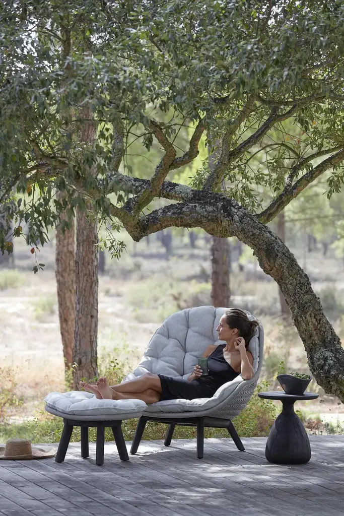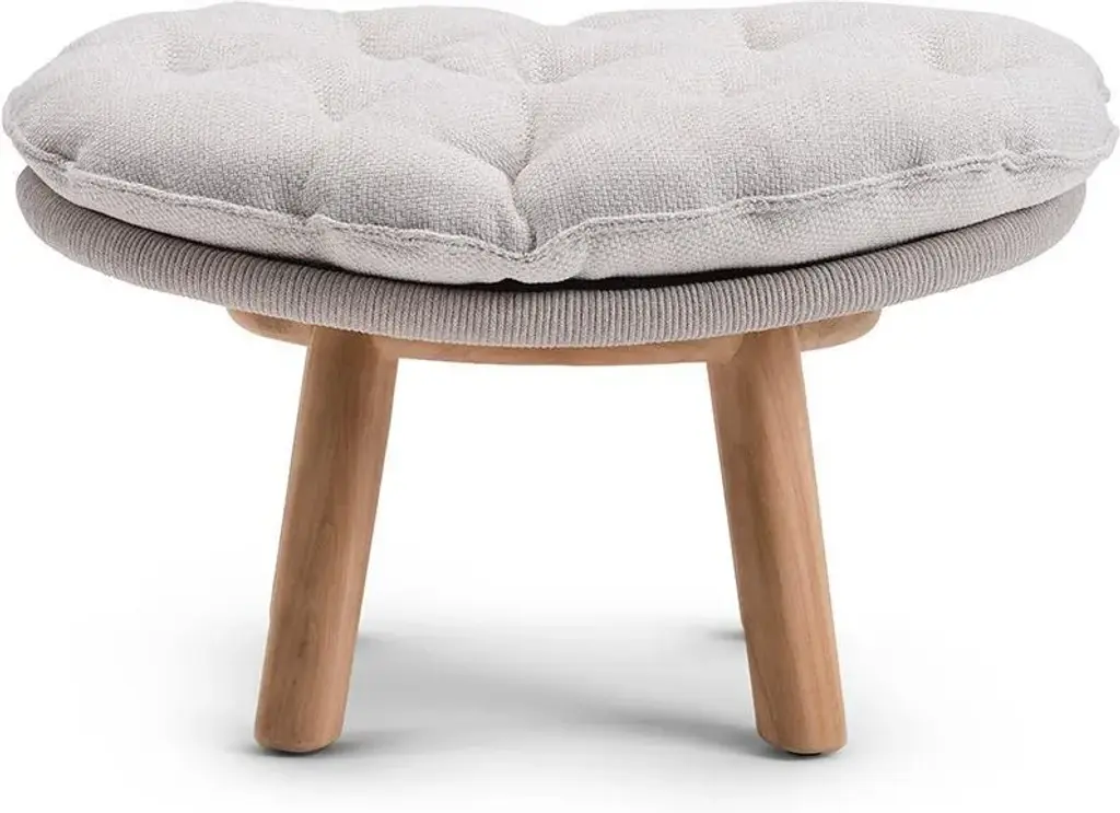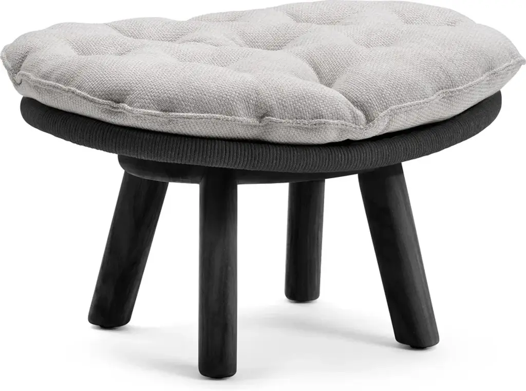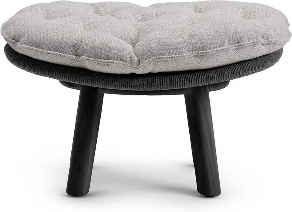 Sandua is a garden footstool upholstered in fabric, part of the homonymous collection.It is a thing of beauty when craftsmanship and innovation combine in perfect harmony. Distinctly different from one another, yet perfectly in sync, each piece in the SANDUA collection is an ode to true artisanship. An organically shaped woven shell is cradled by the sculpted wooden base. Using not one, but two different materials, designer Robin Hapelt developed a both modern and unique take on traditional weaving techniques, resulting in unmatched aesthetics as well as comfort. Topped off with opulent cushions, SANDUA's dining and lounge chairs radiate sophisticated splendour. The collection's rechargeable, remote-controlled outdoor lighting is sure to brighten any outdoor setting.