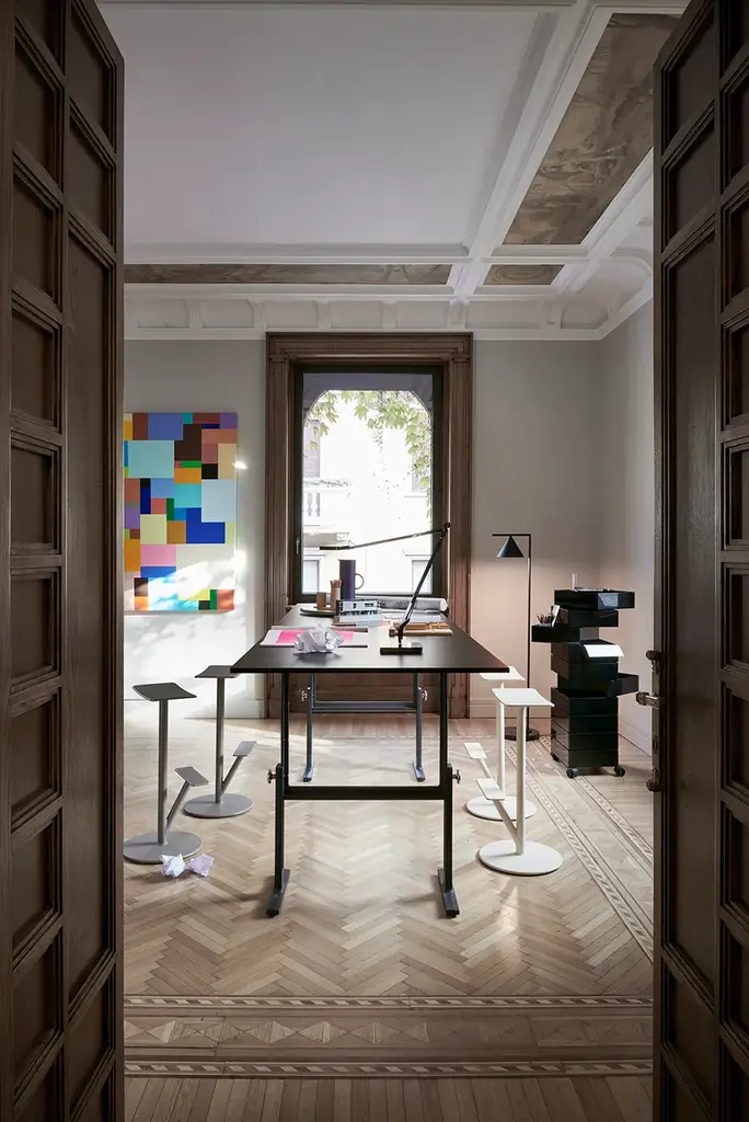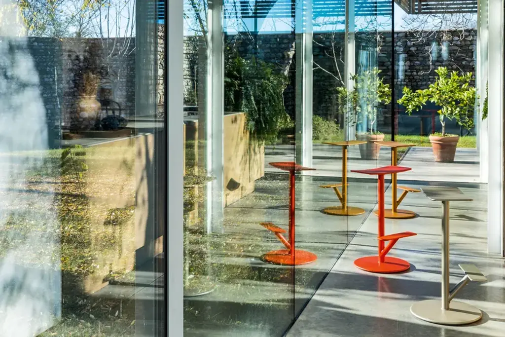 The project name of our ‘Sequoia’ bar stool was ‘Forest’, as the division of the stem into two tubes reminded us of a solid branch growing out of tree trunk. Sequoia has a clear recognizable, unified graphical outline - it reminds us of a calligraphical character. The foot rest has the shape of a foot plate. This gives a certain freedom of movement: it’s like we’ve lifted a segment of the floor. To us, the similarity in shape between the seat and foot rest is an important feature as it makes more meaning of the branch like division of the stem. We looked into various material technologies before we landed on a construction that is inspired by how bicycle frames are put together.Two fixed height.Materials: steel painted in polyester powder.
