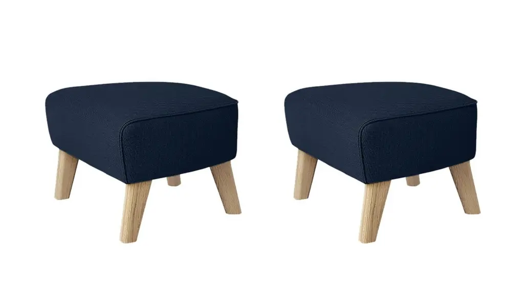 Set of 2 blue and natural oak sahco zero footstool by LassenDimensions: W 56 x D 58 x H 40 cm Materials: TextileAlso available: Other colors available.The my own chair footstool has been designed in the same spirit as Flemming Lassen’s original iconic chair, reflecting his love of rounded shapes, simple forms and precise detailing, to enable the full relaxation effect.By Lassen is a Danish design brand focused on iconic designs created by Mogens and Flemming Lassen, founded by Lassens’ relatives in 2008. Brothers Mogens (1901-1987) and Flemming (1902-1984) Lassen are known as two of Denmark’s greatest architects and designers. Both were renowned pioneers of Danish functionalism and modernist architecture, honoured with numerous prestigious medals and awards. Headed by Mogens Lassen’s grandson Søren Lassen, By Lassen carries on the brothers’ design philosophy by manufacturing their iconic designs as well as products by other designers that complement the Lassen’s functionalist style. The company’s Mission is to continue the tradition of timelessness, functionality and quality, and to introduce the Lassen’s design heritage to new generations.