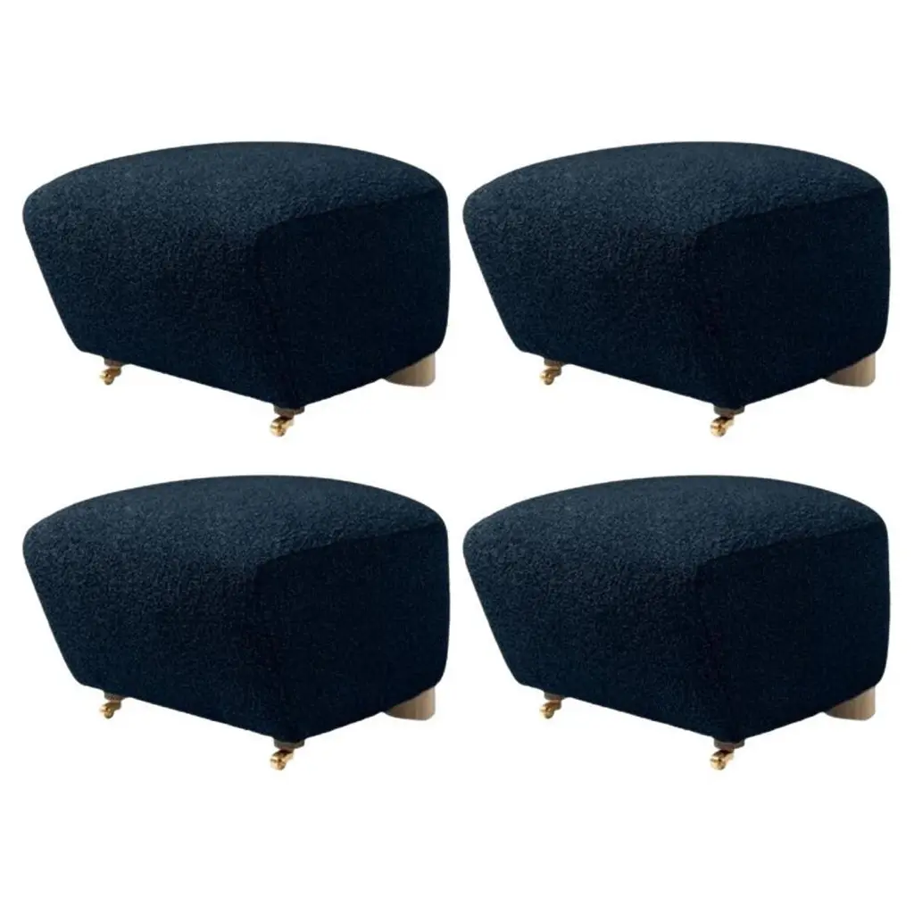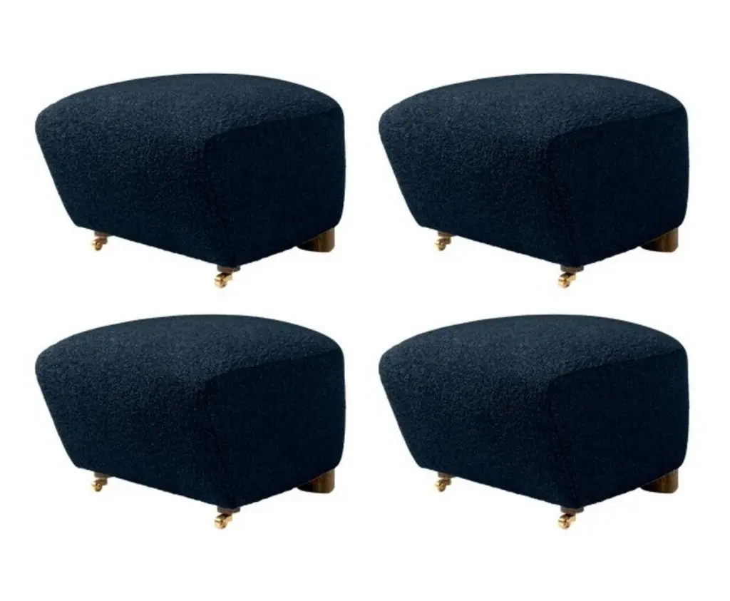 Set of 4 blue smoked oak sahco zero the tired man footstools by LassenDimensions: W 55 x D 53 x H 36 cm Materials: TextileFlemming Lassen designed the overstuffed easy chair, the tired man, for The Copenhagen Cabinetmakers’ Guild Competition in 1935. It is characterised by organic, bearlike shapes and then as now it created a sensation with its curved form and voluminous armrests. Sitting in the chair should, in Flemming Lassen’s own ords, be ”as warm and safe as a polar bear cub in the arms of its mother in the middle of the ice cap”. The family man Flemming Lassen valued intimate relationships - with its warm exterior, The Tired Man invokes domestic cosiness and socialising by candlelight.By Lassen is a Danish design brand focused on iconic designs created by Mogens and Flemming Lassen, founded by Lassens’ relatives in 2008. Brothers Mogens (1901-1987) and Flemming (1902-1984) Lassen are known as two of Denmark’s greatest architects and designers. Both were renowned pioneers of Danish functionalism and modernist architecture, honoured with numerous prestigious medals and awards. Headed by Mogens Lassen’s grandson Søren Lassen, By Lassen carries on the brothers’ design philosophy by manufacturing their iconic designs as well as products by other designers that complement the Lassen’s functionalist style. The company’s mission is to continue the tradition of timelessness, functionality and quality, and to introduce the Lassen’s design heritage to new generations.