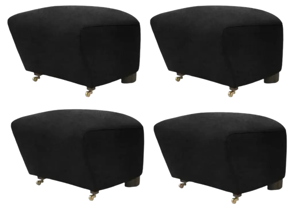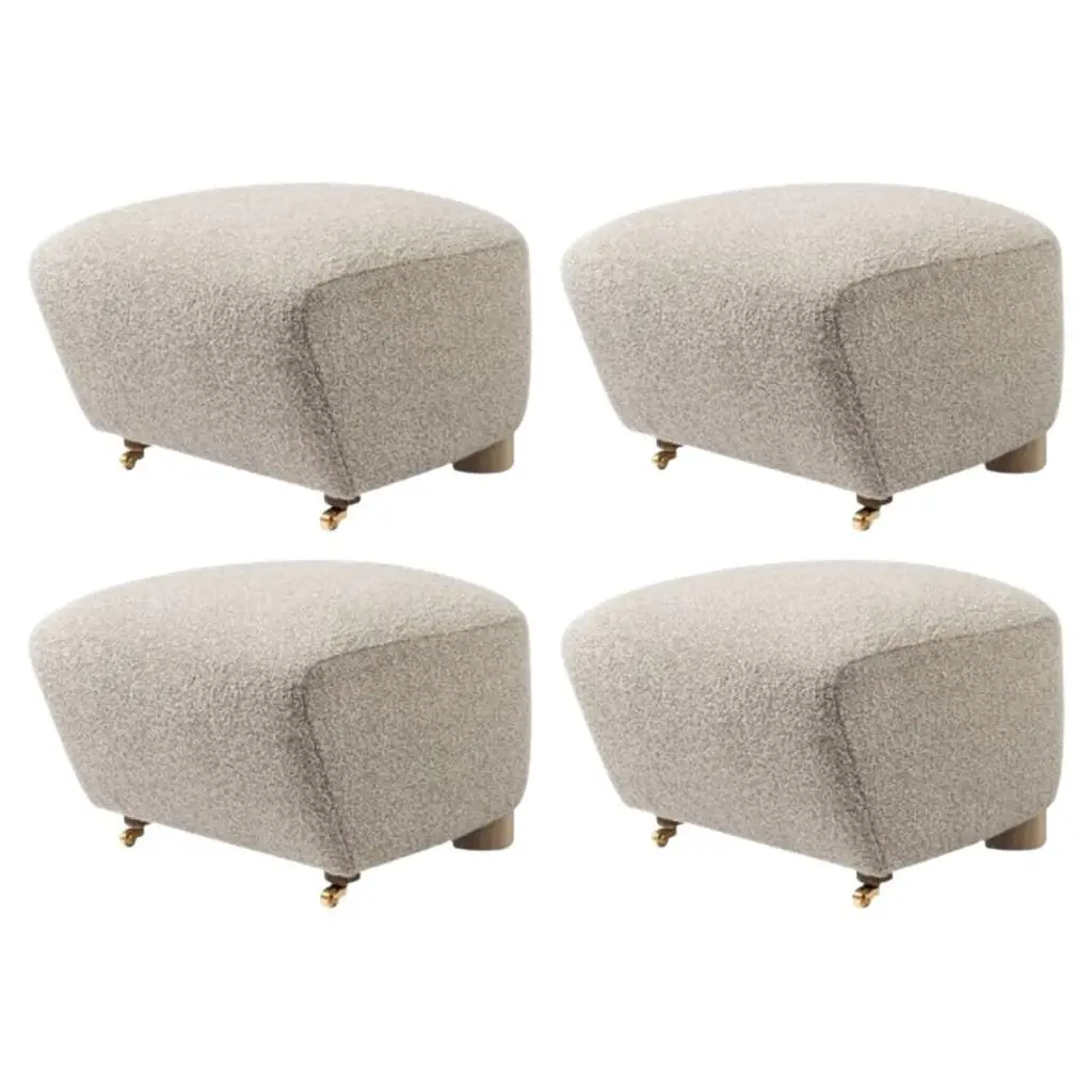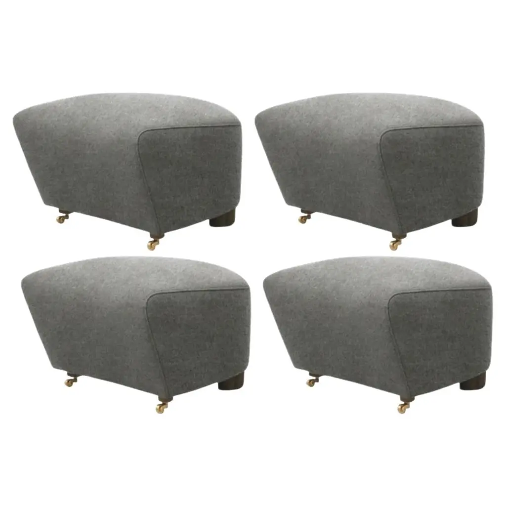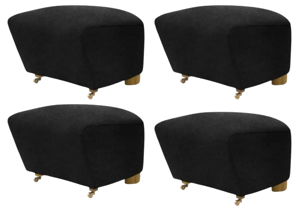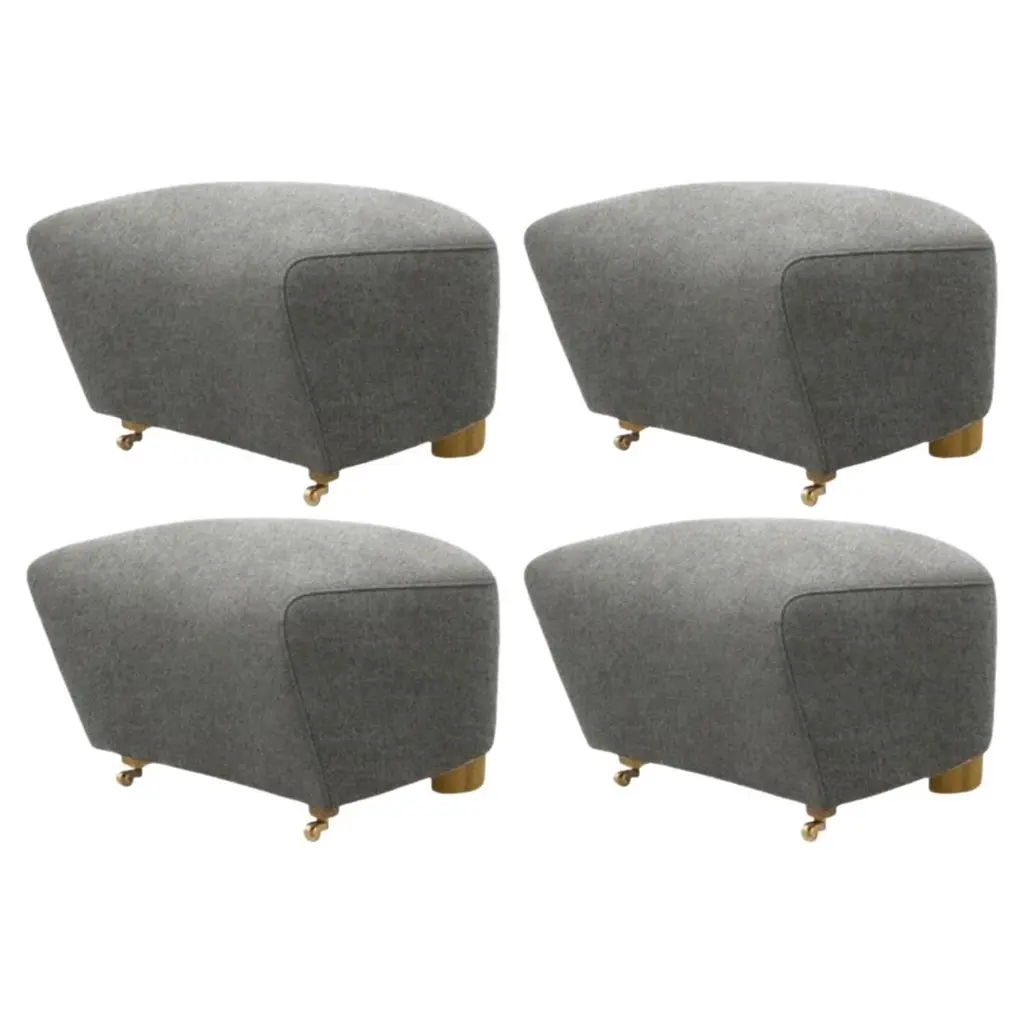 Set of 4 dark grey natural oak hallingdal the tired man footstools by Lassen.Dimensions: W 55 x D 53 x H 36 cm. Materials: Textile.Flemming Lassen designed the overstuffed easy chair, The Tired Man, for The Copenhagen Cabinetmakers’ Guild Competition in 1935. It is characterised by organic, bearlike shapes and then as now it created a sensation with its curved form and voluminous armrests. Sitting in the chair should, in Flemming Lassen’s own ords, be ”as warm and safe as a polar bear cub in the arms of its mother in the middle of the ice cap”. The family man Flemming Lassen valued intimate relationships - with its warm exterior, The Tired Man invokes domestic cosiness and socialising by candlelight.By Lassen is a Danish design brand focused on iconic designs created by Mogens and Flemming Lassen, founded by Lassens’ relatives in 2008. Brothers Mogens (1901-1987) and Flemming (1902-1984) Lassen are known as two of Denmark’s greatest architects and designers. Both were renowned pioneers of Danish functionalism and modernist architecture, honoured with numerous prestigious medals and awards. Headed by Mogens Lassen’s grandson Søren Lassen, By Lassen carries on the brothers’ design philosophy by manufacturing their iconic designs as well as products by other designers that complement the Lassen’s functionalist style. The company’s mission is to continue the tradition of timelessness, functionality and quality, and to introduce the Lassen’s design heritage to new generations.