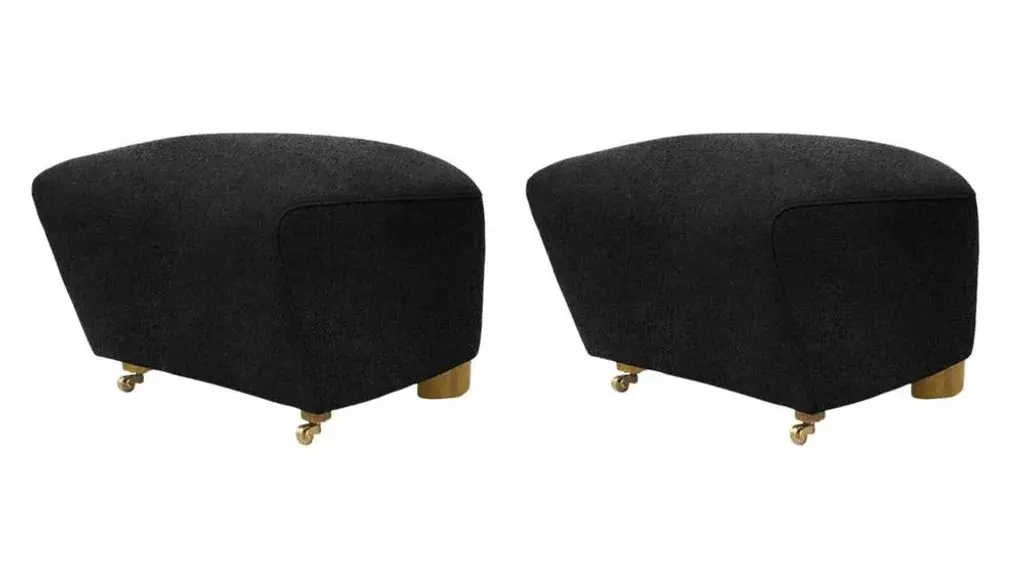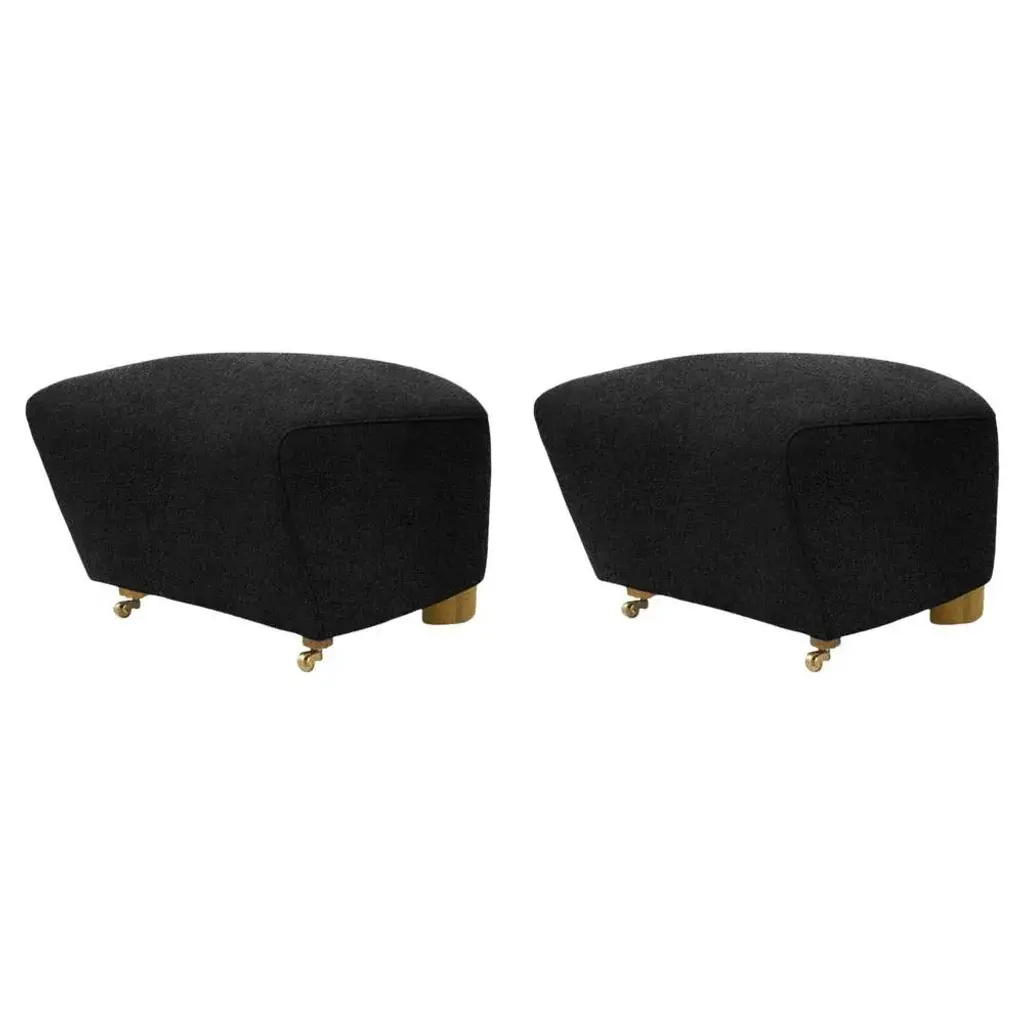 Set of 2 dark grey Natural Oak Hallingdal the Tired Man footstools by Lassen Dimensions: W 55 x D 53 x H 36 cm Materials: Textile Flemming Lassen designed the overstuffed easy chair, The Tired Man, for The Copenhagen Cabinetmakers’ Guild Competition in 1935. It is characterised by organic, bearlike shapes and then as now it created a sensation with its curved form and voluminous armrests. Sitting in the chair should, in Flemming Lassen’s own ords, be ”as warm and safe as a polar bear cub in the arms of its mother in the middle of the ice cap”. The family man Flemming Lassen valued intimate relationships - with its warm exterior, The Tired Man invokes domestic cosiness and socialising by candlelight.