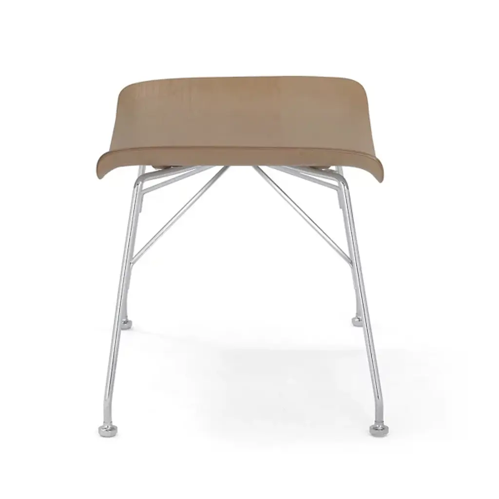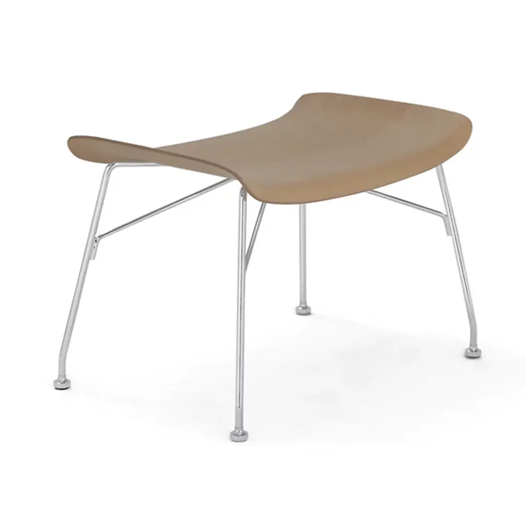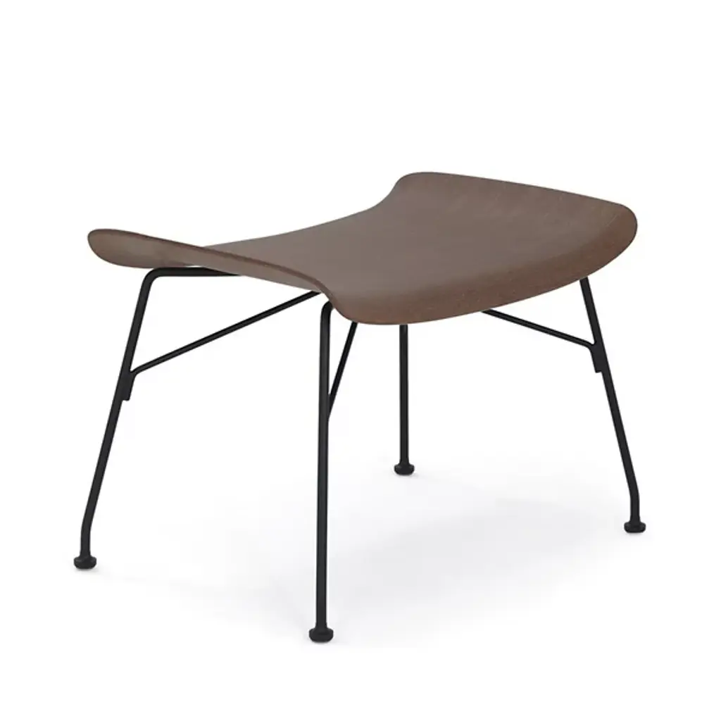 Relax back and put your feet up on the sweeping, simple lines of the SmartWood Footstool by Kartell. Designed in 2019 by Phillippe Starck and built in Italy, it uses an elegant assembly of slender cylindrical steel legs atop small disc feet to provide an airy presence to its surroundings. Cantilevered supports further strengthen the frame. The wood rest has been shaped into a three-dimensional shape using patented technology, offering organic curves to an otherwise simple design.
