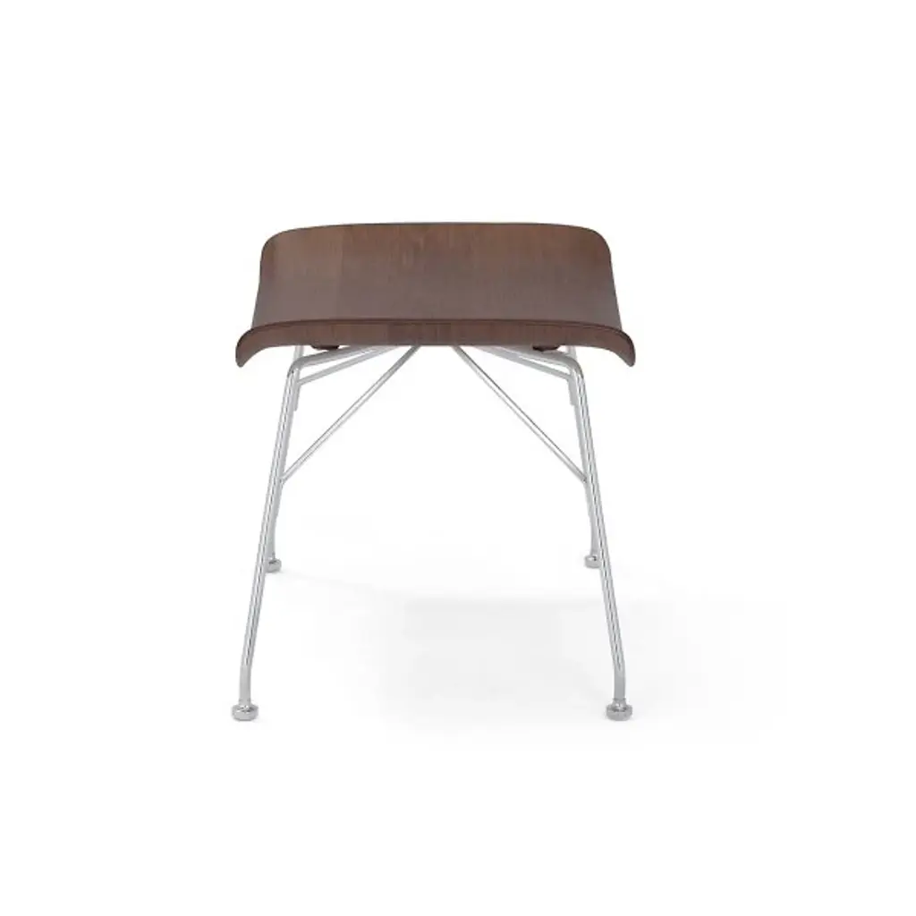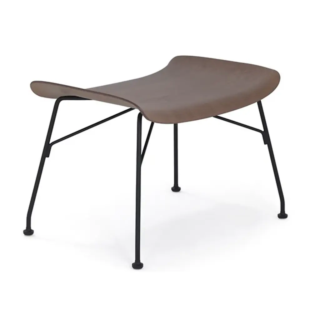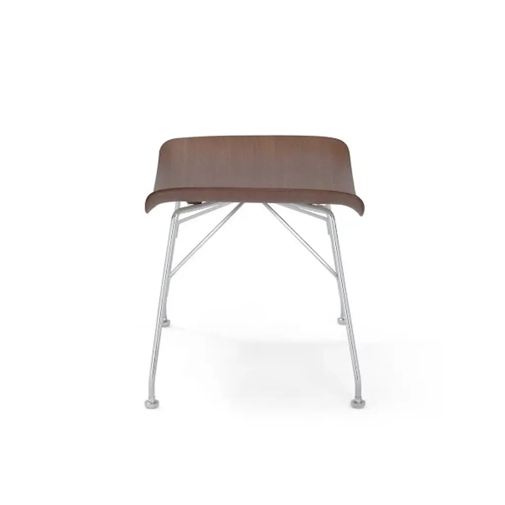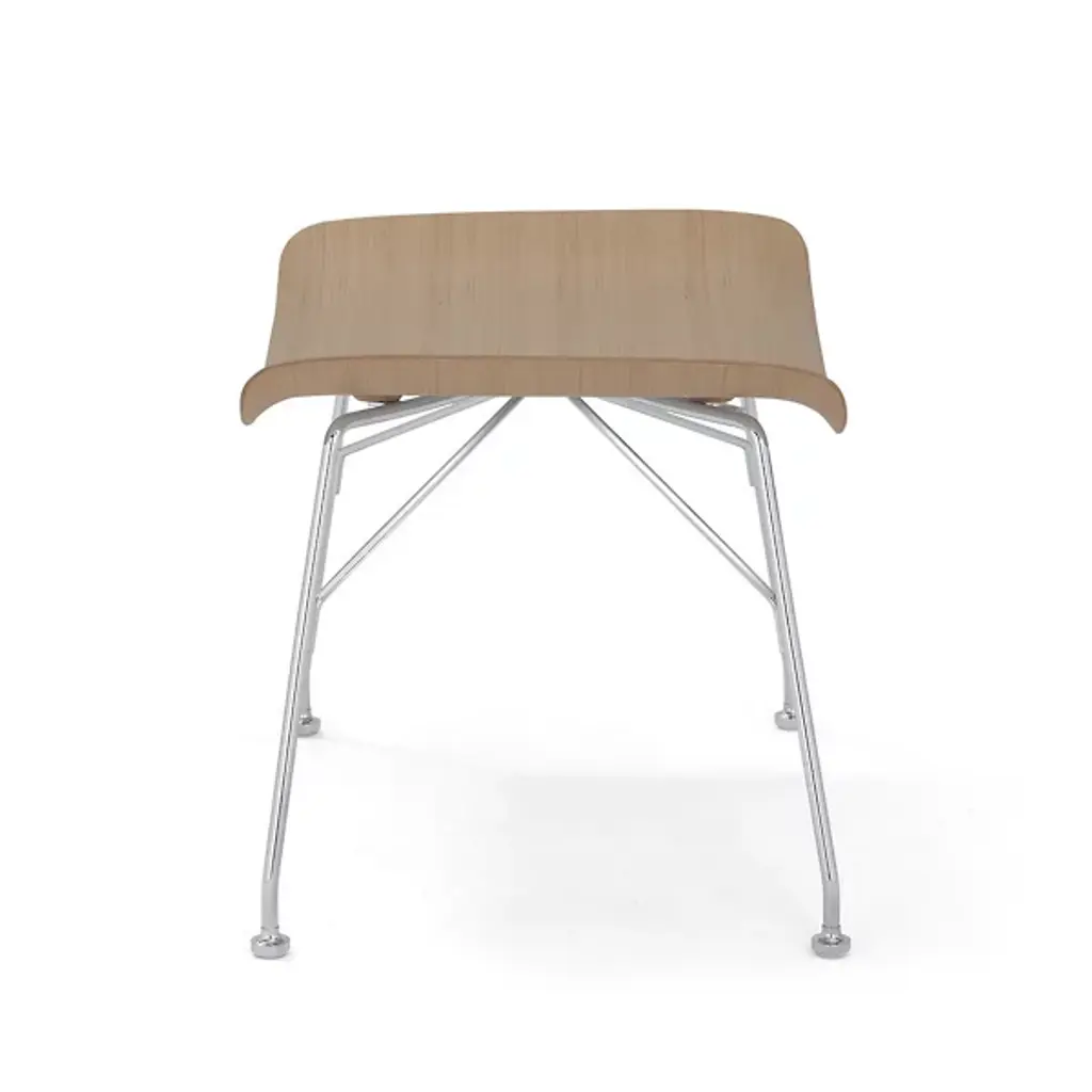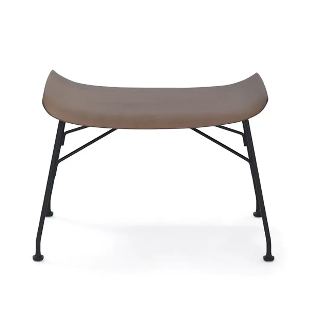 Relax back and put your feet up on the sweeping, simple lines of the SmartWood Footstool by Kartell. Designed in 2019 by Phillippe Starck and built in Italy, it uses an elegant assembly of slender cylindrical steel legs atop small disc feet to provide an airy presence to its surroundings. Cantilevered supports further strengthen the frame. The wood rest has been shaped into a three-dimensional shape using patented technology, offering organic curves to an otherwise simple design.