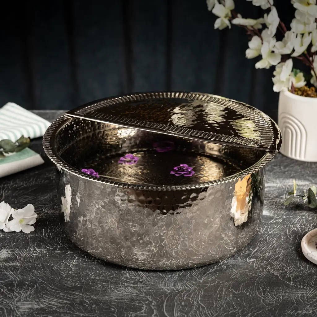 Designed for luxurious hand and foot care, this Handcrafted Silver Copper Pedicure and Manicure Bowl brings spa-quality refinement into your home. Made from pure copper with a radiant silver-tone hammered finish, it provides both aesthetic elegance and functional comfort. The removable footrest is perfectly angled to support extended soaks or treatments, making this bowl ideal for warming, soaking, or essential oil rituals. Rooted in Ayurvedic wellness traditions and crafted by skilled artisans, it offers a serene, sensory escape that turns everyday self-care into a restorative experience.