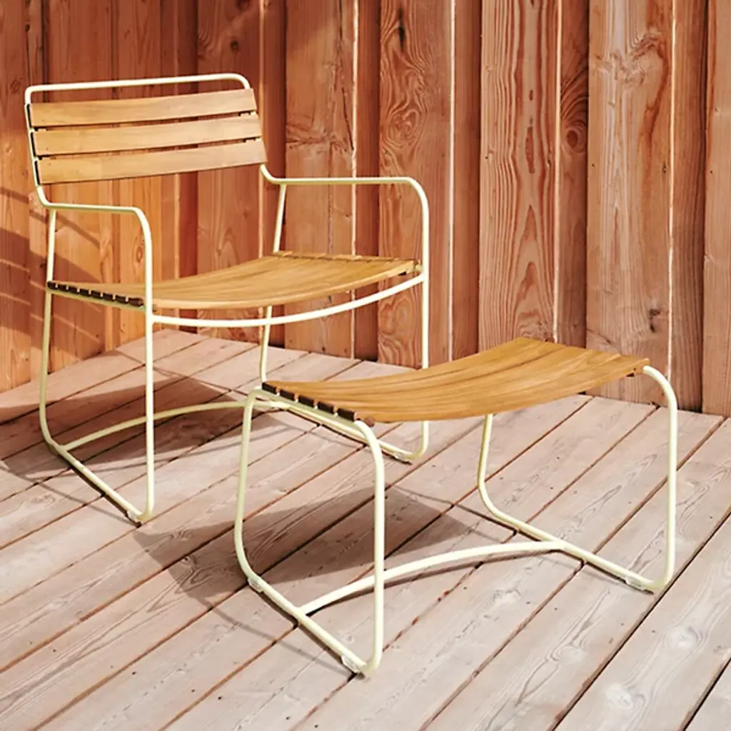 A lounge-worthy invitation. The Surprising Teak Footrest by Fermob invites comfort to your outdoor seating group. Designer Harold Guggenbichler conjures up vintage visions of classic teak steamer chairs on the decks of luxury liners in the early 1900s with the modern addition of a Steel rod frame. Gently contoured natural Teak slats provide an extra seat on the patio or restful lounging at the end of the day. Designed as a complement to the Surprising Teak Low Armchair, this stylish footrest provides relaxed seating and being lightweight, it easily moves from sun to shade and back again.