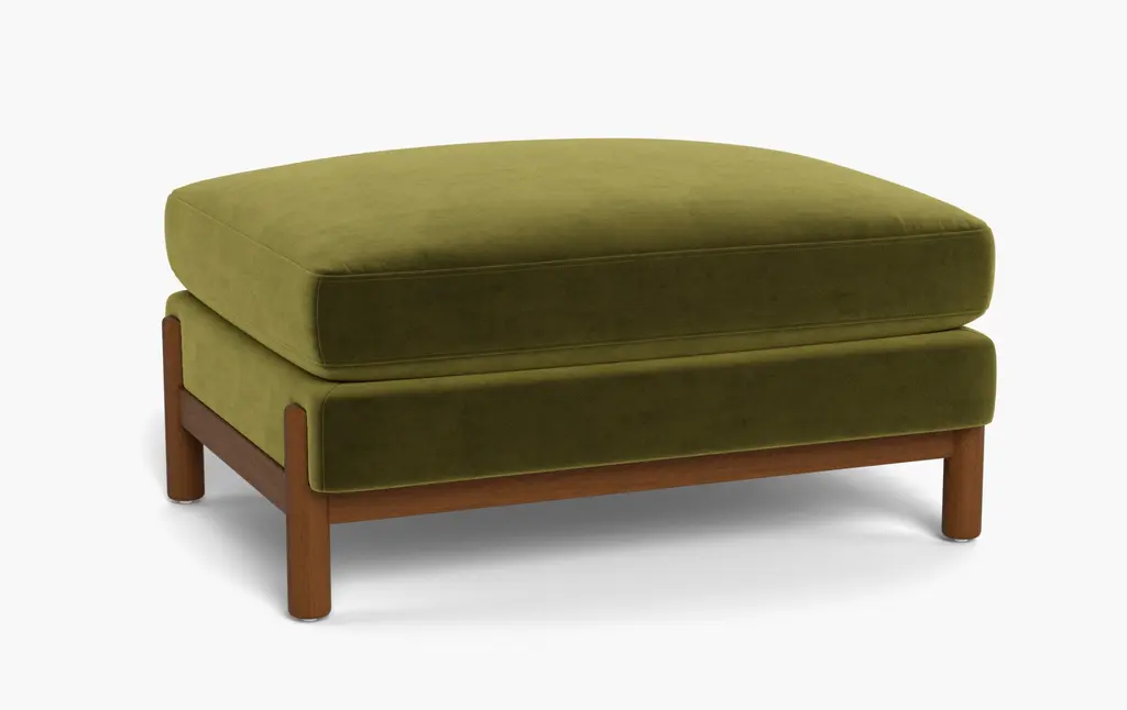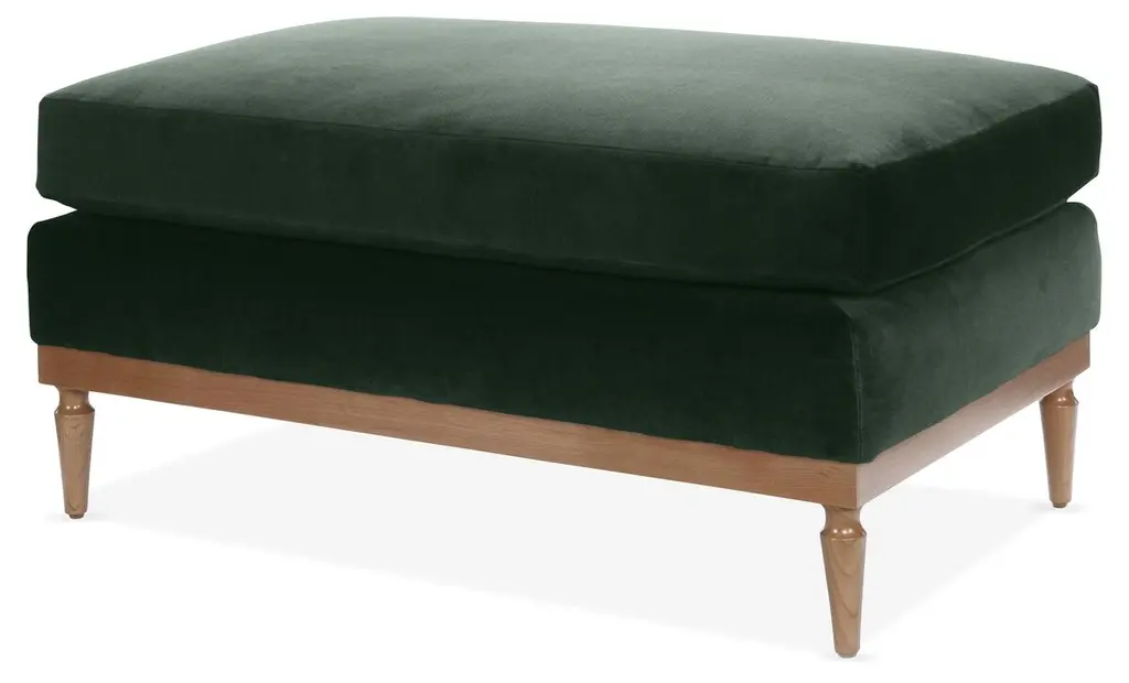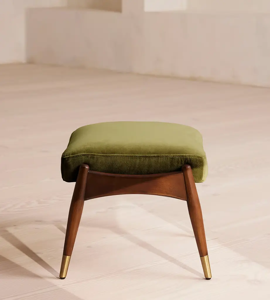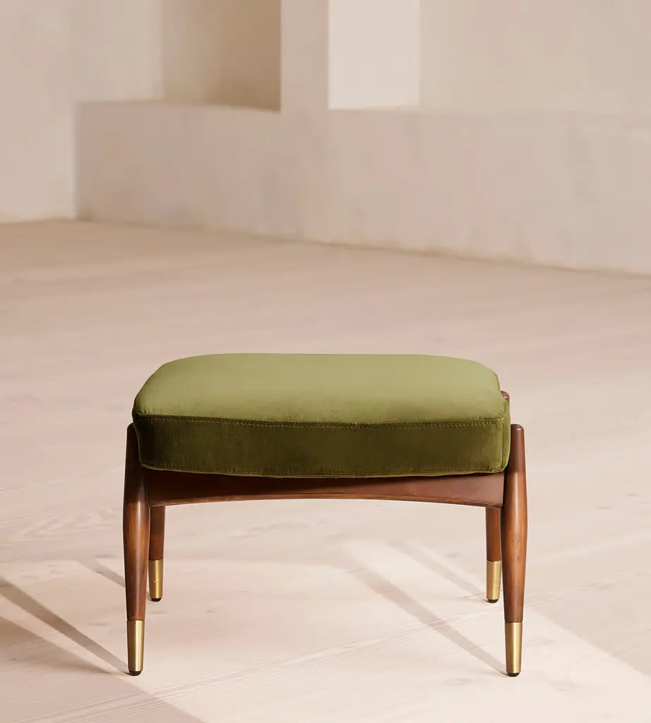 Taking cues from vintage-inspired designs at 40 Greek Street, our Theodore footstool will add a fresh focal point to your living space. It has a comfortable, deep-sit shape with a down and feather-wrapped foam cushion upholstered in olive velvet. The tapered birch-wood frame and brass detailing on the legs complement the clean lines.