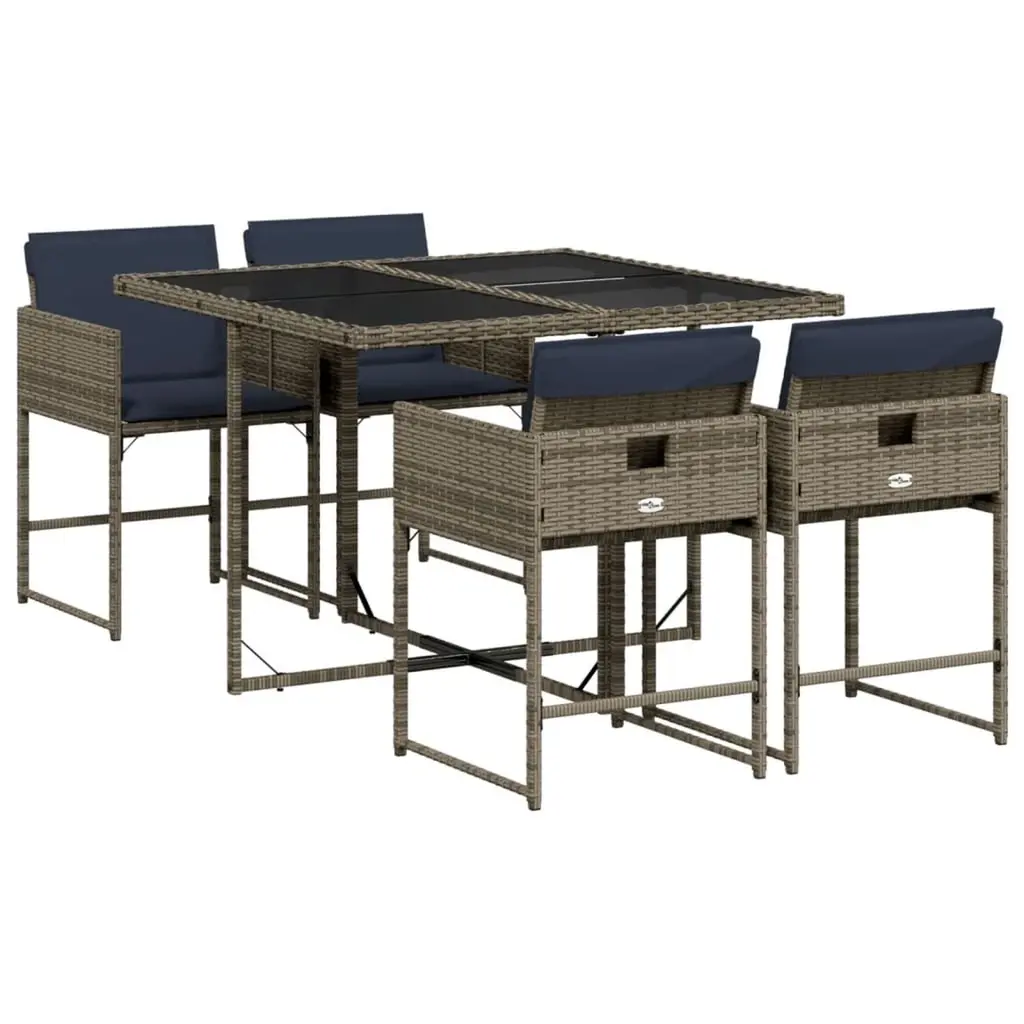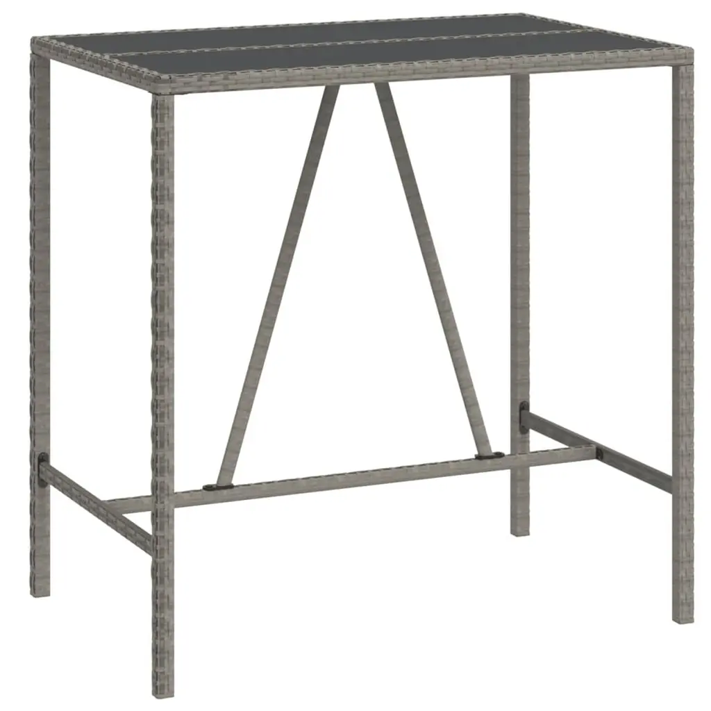 This 5 Piece Outdoor Bar Set mixes style with practicality, making it ideal for your garden, patio, or balcony. With a modern look, it has a sleek profile and solid materials, giving your outdoor area a fab upgrade. Durability: The weatherproof PE rattan ensures your bar set stands up to different outdoor conditions, keeping its good looks over time. The solid framework made from powder-coated steel adds stability and longevity.Comfort: Chill out with thick cushions that have removable covers fastened with zippers for easy cleaning, allowing you and your guests to dine or relax comfortably outside.Stylish Design: This bar set has a modern vibe that mixes simplicity with practicality, featuring a smooth texture that enhances any outdoor decor. The grey rattan and black tempered glass combo adds a touch of class.Space-Efficient: Perfect for smaller areas, the rectangular design of the bar table and stools makes sure you make the most out of your outdoor space while seating four comfortably.Versatile Use: Perfect for a mix of social events, this bar set works well for dining, casual hangs, or as a home bar, making it a multifunctional piece for any gathering.