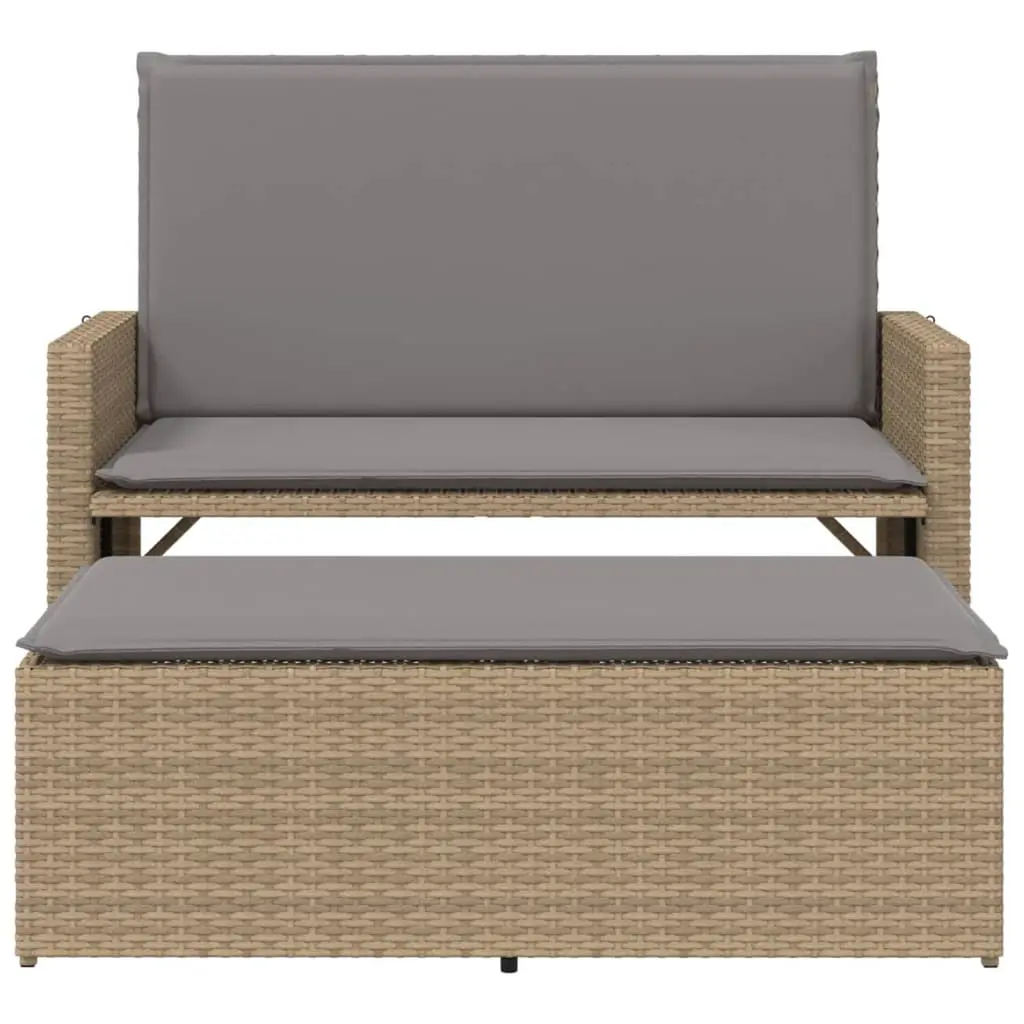 This 2-in-1 patio bench, serving as both an outdoor loveseat and sofa bed, makes a practical and eye-catching addition to your outdoor living space. Durable material: PE rattan, also known as poly rattan, is a strong, low-maintenance synthetic material that looks like natural rattan. It's lightweight, easy to clean, and commonly used for outdoor furniture due to its durability and weather-proof properties. Versatile functionality: This outdoor furniture can be used as a 2-seater bench or a sofa bed. You can easily switch it to a bed by reclining the backrest and pulling out the stool from under the bench. The support panels behind the backrests make the bed more stable. Comfortable seat experience: This outdoor furniture, complete with thickly padded cushions, offers a comfortable seating experience. Versatile footstool: The stool is versatile, serving as a comfortable footrest for when you're lounging on the sofa or as an extra seat in your garden. Compact storage: The footstool can be neatly tucked underneath the seat, allowing for space-saving storage. Good to know:To make sure your outdoor furniture stays beautiful, we recommend protecting it with a waterproof cover.