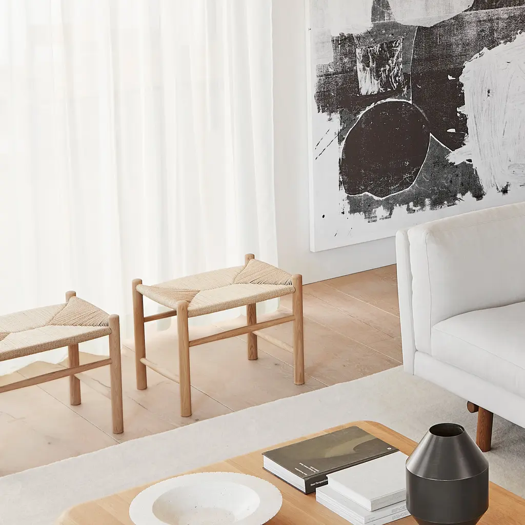 One of Hans J. Wegner's most widely recognized pieces, his quintessential Danish rocking chair gets a faithful companion in the J16 Stool. Part and parcel of Fredericia's proud heritage, its natural paper cord woven as the seat adds support while creating a subtle contrast in texture to the smooth wooden structure. As a footrest or a small stool, it's available in a range of oak and walnut finishes with the same sturdy structure and visual lingo as the cherished rocking chair.