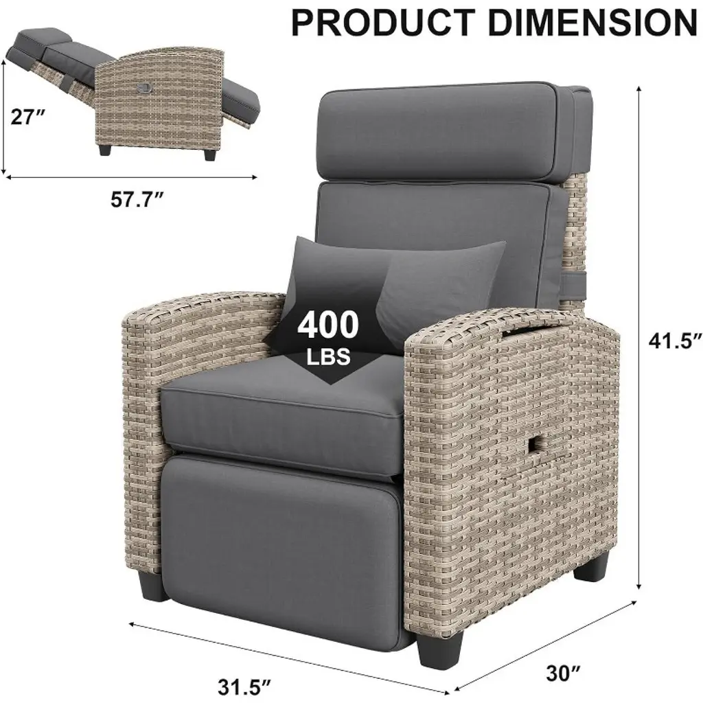INDIVIDUALLY ADJUSTABLE RECLINER: This outdoor recliner features a locking adjustable backrest and footrest with a maximum angle of 150°. Easily adjustable from 25° upright reading position to 150° lie-flat sleeping mode, this recliner easily locks into your desired sitting, reclining or lying position, whether sunbathing or napping.ERGONOMIC DESIGN: Featuring a wider and deeper seat, extended footrest, and ergonomic armrests and sectional cushions, this patio lounger not only provides you with perfect comfort for long lounging sessions, but also provides excellent support for your back and neck, making it an ideal outdoor lounger for the backyard or poolside.BUILT-IN SIDE TABLE: The heavy duty lounge chair has a built-in side table on the outside armrests, perfect for snacks, drinks, books, cell phones, or tablets, keeping the essentials at your fingertips while relaxing on your outdoor lounger. Perfect for backyard lounging or poolside napping.ALL-WEATHER DURABILITY: This outdoor patio lounger features a rust-resistant steel frame and hand-woven polyethylene rattan (UV-resistant and waterproof) to withstand the outdoor elements of rain, sun, and wind; the removable cushion is made of highly resilient foam and olefin fabric that is waterproof, fade-resistant, abrasion-resistant, and easy to clean. Maximum weight capacity 300 lbs.QUICK AND EASY INSTALLATION: Ready to use in 30 minutes with clearly labeled parts and no special tools required.Lightweight design for easy transportation and installation. Go wherever you want, from the beach to the backyard. Small footprint for patios, balconies or decks, and uniform tilt mechanism ensures smooth operation every time.