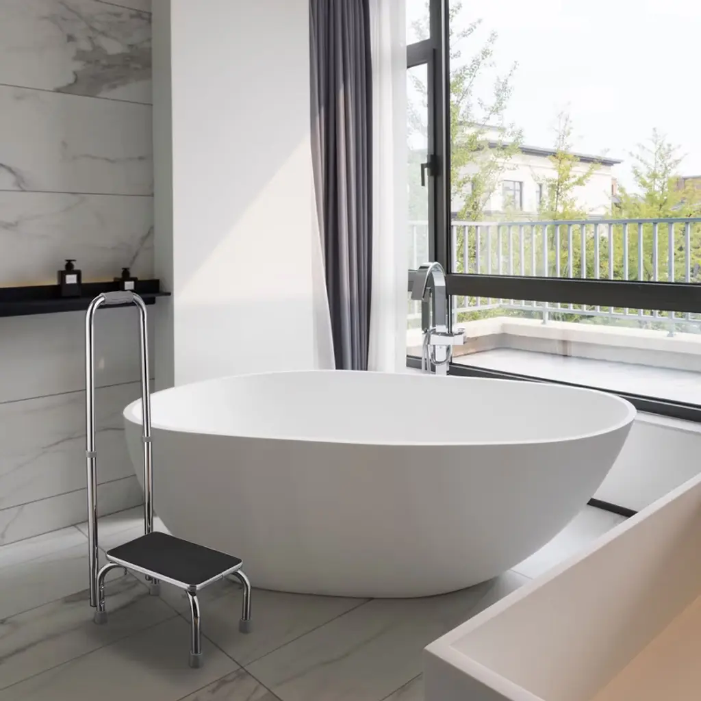 Features:- Strong Metal Construction - 16 15/16" x 11 5/8" x 39 3/4" Step Stool is made of heavy-duty steel for providing durability and sturdiness, legs of 16-gauge thick for adding stability and supporting a heavy weight up to 330lbs, ideal for getting in and out of bath, bed and car- Non-skid & Safe - Non-skid textured plastic surface for preventing slippery and adding using safety; reinforced feet not only for slip resistance, but also for reducing noise and protecting your floor from scratches, suitable for using in bedroom and bathroom- Adjustable & Steady Handle - 1" diameter round handle which provides convenient grasping, features 10-position height adjustment from 32 11/16" to 39 3/4" for catering to users of different heights, offering support and stability for seniors and adults when standing on the stool- Durable & Easy to Use - Smooth chromed-plated metal frame for ensuring rust-resistance and long life, easy to be cleaned and maintained; easy to assemble, no need to use extra tools, just connect all parts together- Portability & Multifunctional Usages - Compact size and light weight for providing portability and convenience, can be moved to anywhere you need; widely used for helping adults and elderly people to reach high-shelved items, clean windows, etc; also beneficial for the disabled and the patients at hospitalsSpecifications:- Overall Dimension(LxWxH): 16 15/16" x 11 5/8" x 39 3/4" (43 x 29.5 x 101 cm)- Stool Platform Size(LxWxH): 14 5/16" x 9 13/16" x 7/8" (36.4 x 25 x 2.2 cm)- Height from Platform to Ground: 8 11/16" (22 cm)- Handle Height Adjustment: 32 11/16" to 39 3/4" (83 to 101 cm)- Diameter of Leg or Handle: 1" (2.5 cm)- Weight Capacity: 300 Lbs (150 kg)- Net Weight: 9 Lbs (4.1 kg)Package Contents:- 1x Footstool- 1 Set of Accessories- 1x User Manual