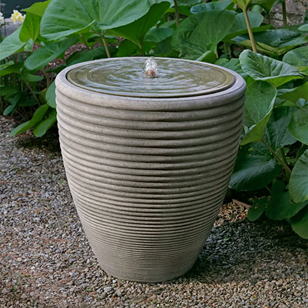 This fountain's ribbed design is similar to that of the venerable symbol for the Michelin tire company, known in France as Bibendum. Unlike the Michelin Man, however, the fountain is made of cast stone using locally sourced natural materials. Its hand-applied patina replicates the look of naturally aged materials, adding to its elegance. The fountain produces a minimal splash and can be heard at a distance.