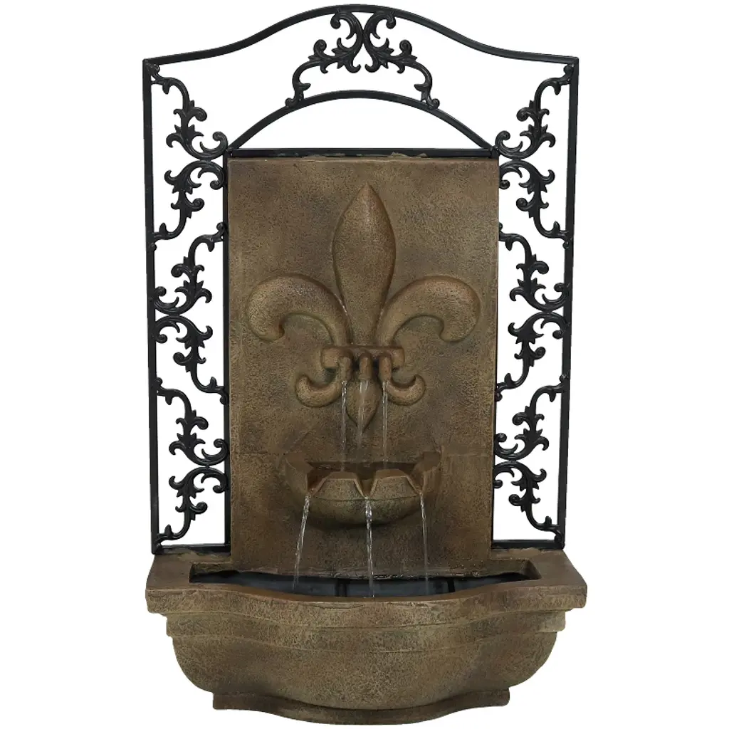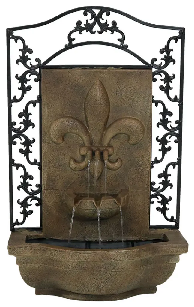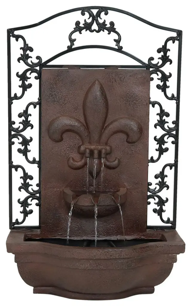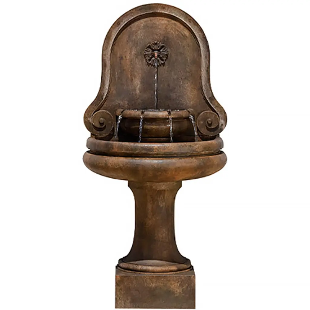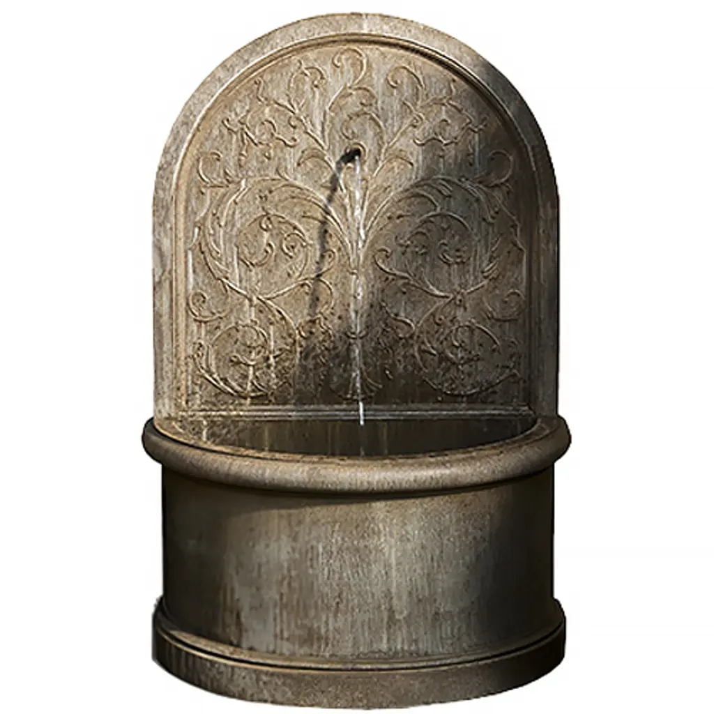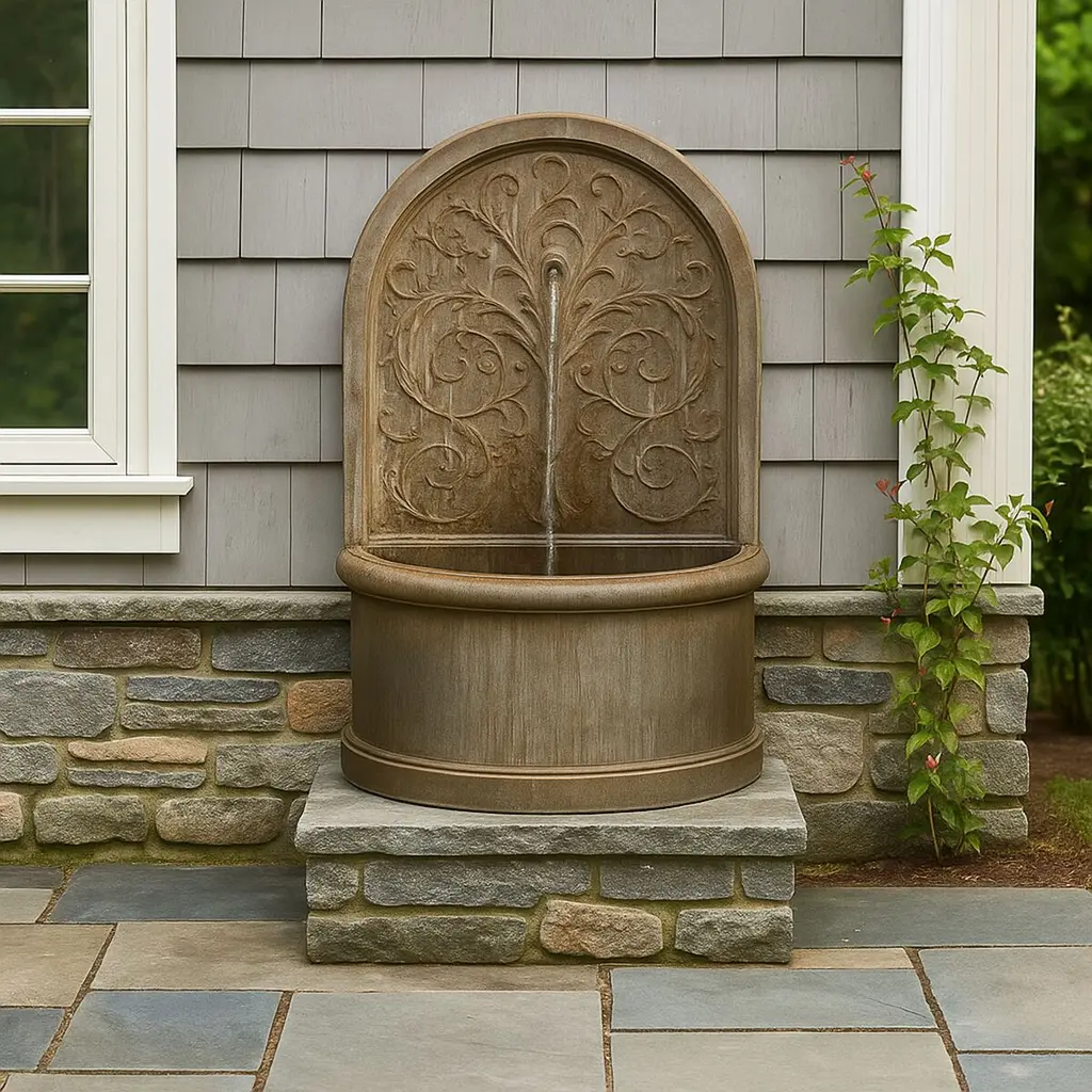 This wall fountain is as beautiful as it is pleasing to the ear, with ornate floral scrollwork in an aged limestone finish. Made of resilient cast stone.